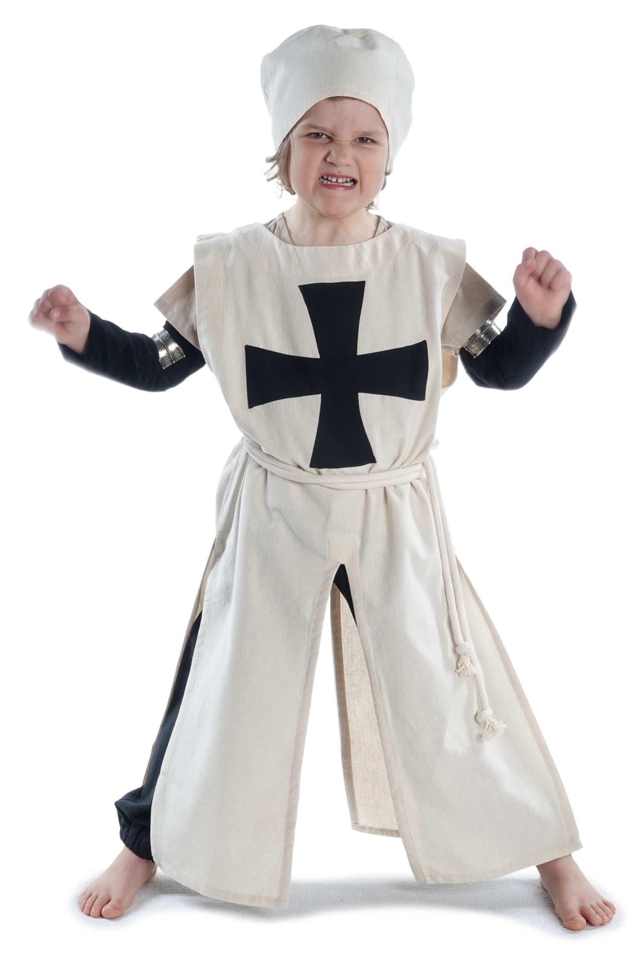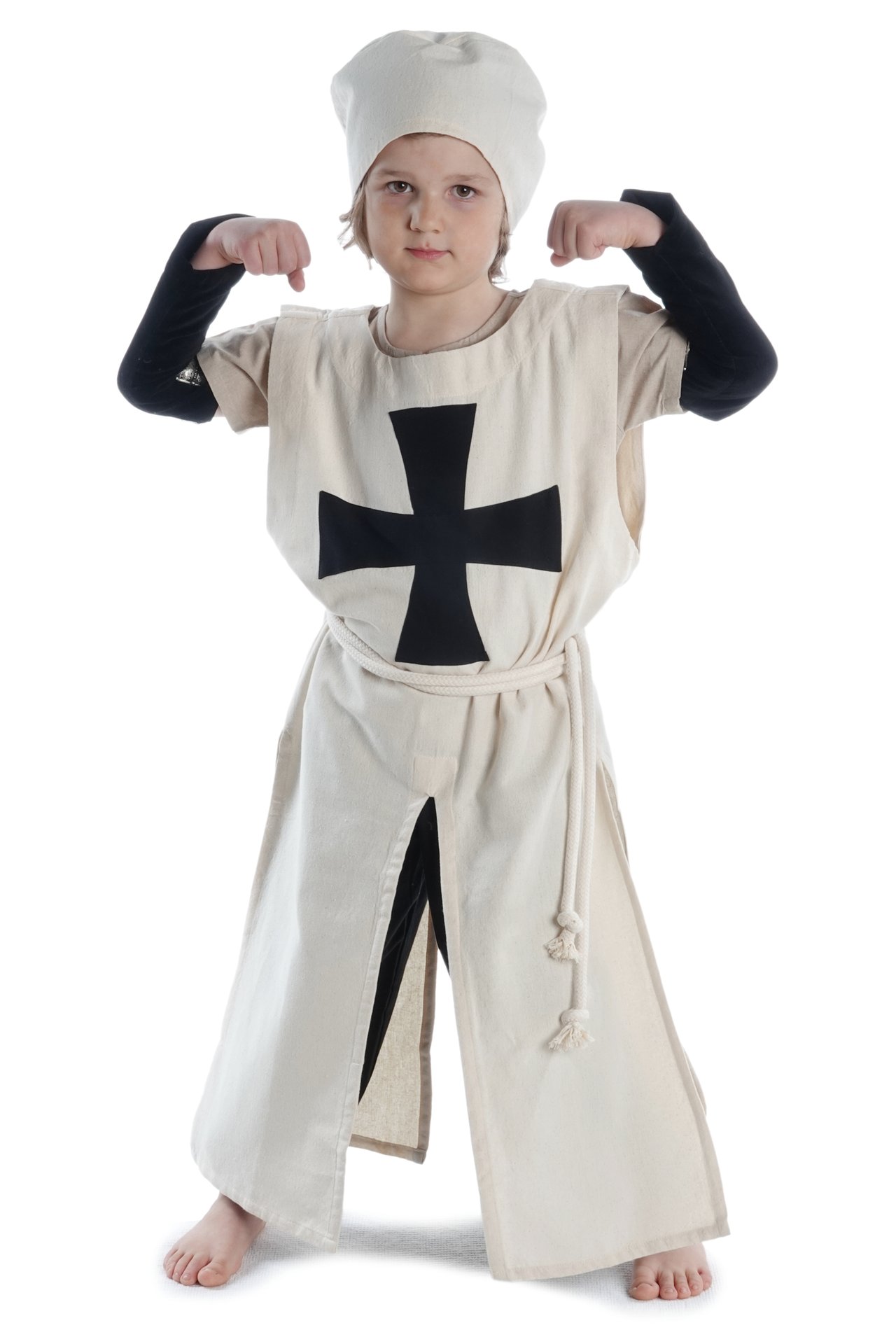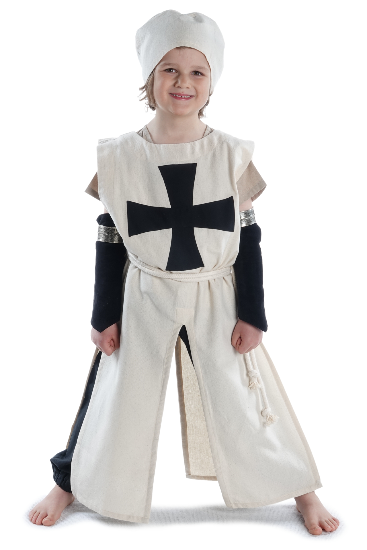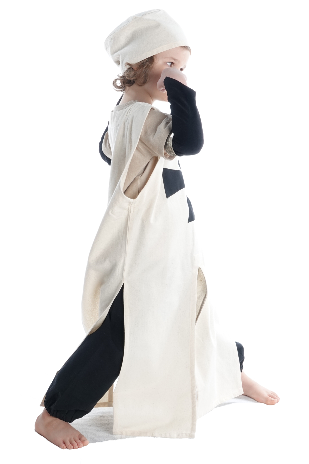 Unser Kinderwaffenrock „Poppo“ ist ein ärmelloses historisches Obergewand mit rundem Halsausschnitt. Sein langer Rock verfügt über vier Öffnungen, die sog. Gehschlitze seitlich und Reitschlitze vorne und hinten. Diese Schlitze gewähren nicht nur maximalen Bewegungsradius, sondern erlauben auch das Reiten zu Pferd. Ferner wird das Kleidungsstück in Einheitsgröße geliefert, die derart geschnitten ist, dass das Tragen des Waffenrocks über Kettenhemd oder Rüstung völlig problemlos ist. Auf der Brust unseres historischen Waffenkleids für Kinder ist das schwarzes Tatzenkreuz, der Deutschritter, aufgenäht.