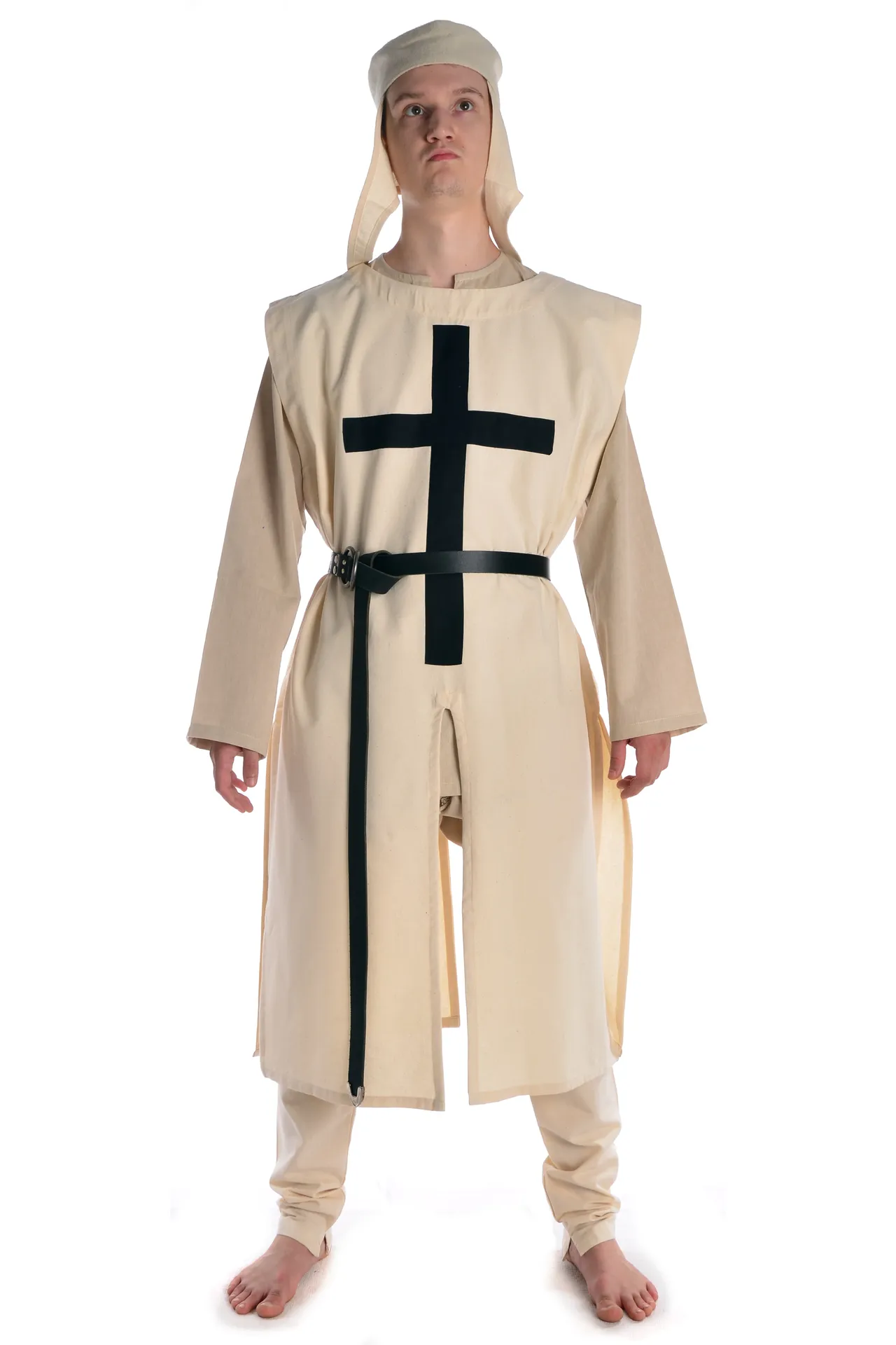 Unser Waffenrock „Nagelring“ ist ein ärmelloses historisches Obergewand mit rundem Halsausschnitt. Sein langer Rock verfügt über vier Öffnungen (vorne, hinten und seitlich). Diese Gehschlitze gewähren nicht nur maximalen Bewegungsradius, sondern erlauben auch das Reiten zu Pferd. Ferner wird das Kleidungsstück in Einheitsgröße geliefert, die derart geschnitten ist, dass ein Tragen des Waffenrocks über Kettenhemd oder Rüstung völlig problemlos ist. Darüber hinaus verfügt die beigefarbene mittelalterliche Gewandung über ein auf der Brust aufgenähtes schwarzes Kreuz. Dieses Wappen des Deutschen Ordens (ab dem späten 12. Jahrhundert) können Sie entweder als Tatzenkreuz oder gerades lateinisches Kreuz wählen.