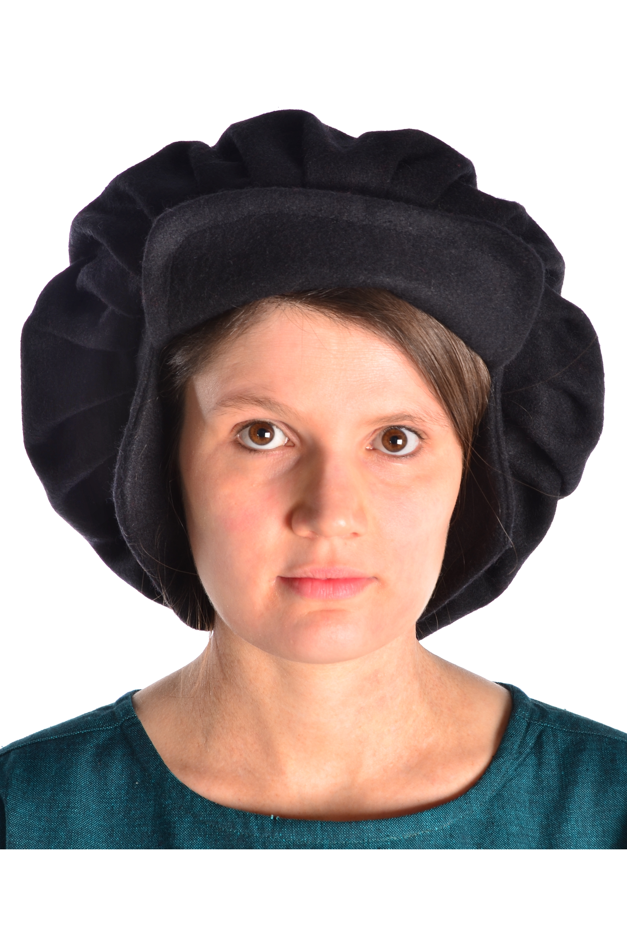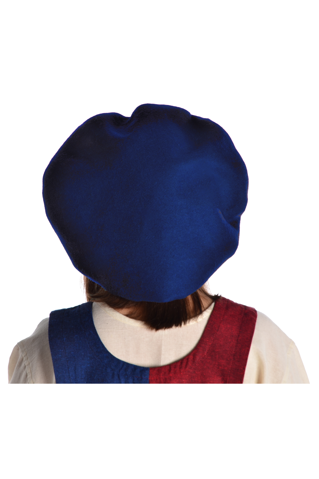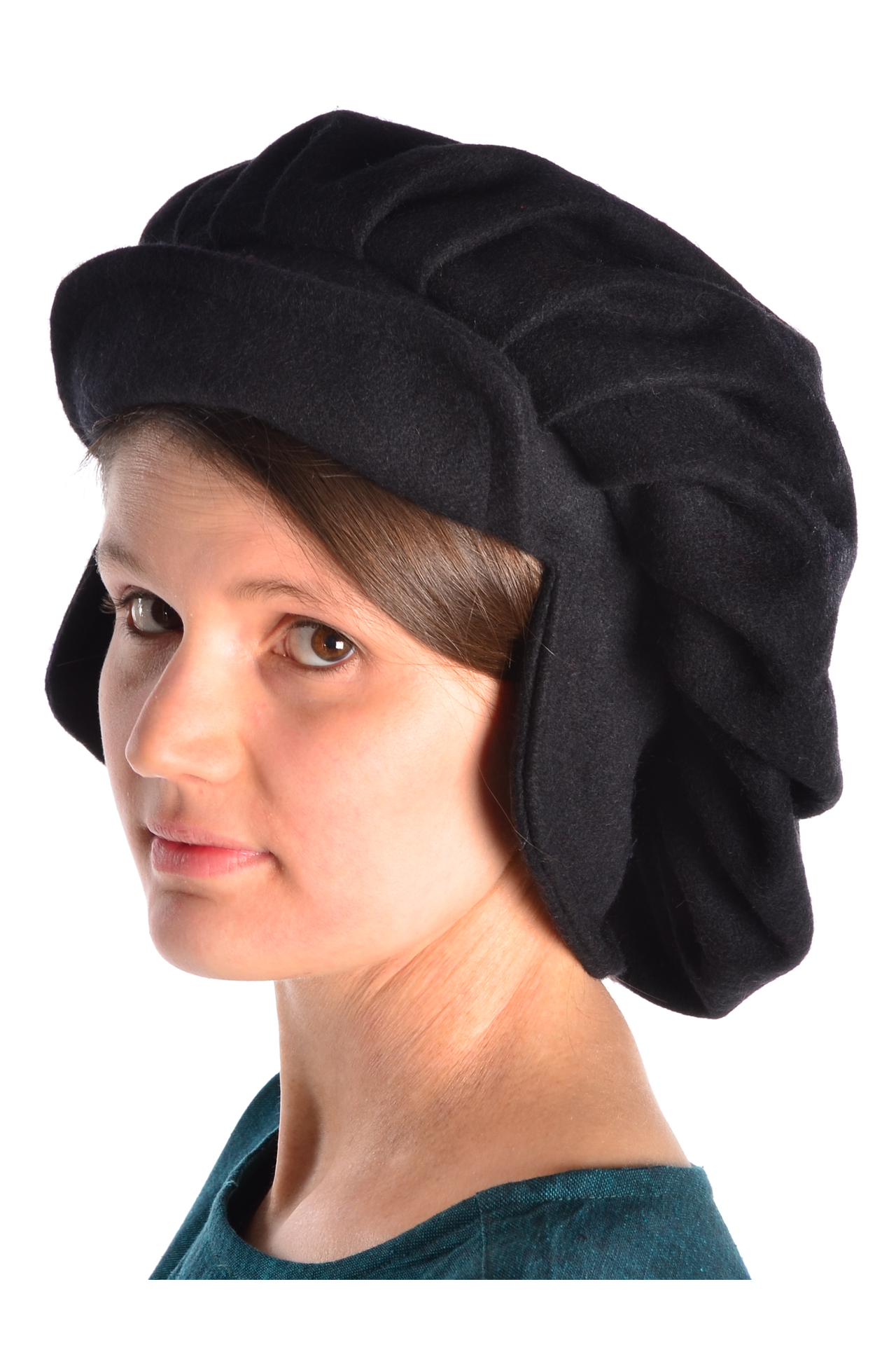 Unser mittelalterliches Barett „Sintram“ ist eine historische Haube mit Krempe. Diese spätmittelalterliche Kopfbedeckung ist durch die umschlagbaren Krempen unterschiedlich drapierbar. Geschneidert wurde „Sintram“ aus einem runden Kopf-Element, an welchem drei Klappen angebracht wurden. Da die Krempen je nach Vorliebe umgeschlagen werden können, schützt das Filzbarett besonders gut gegen Kälte und Wind.