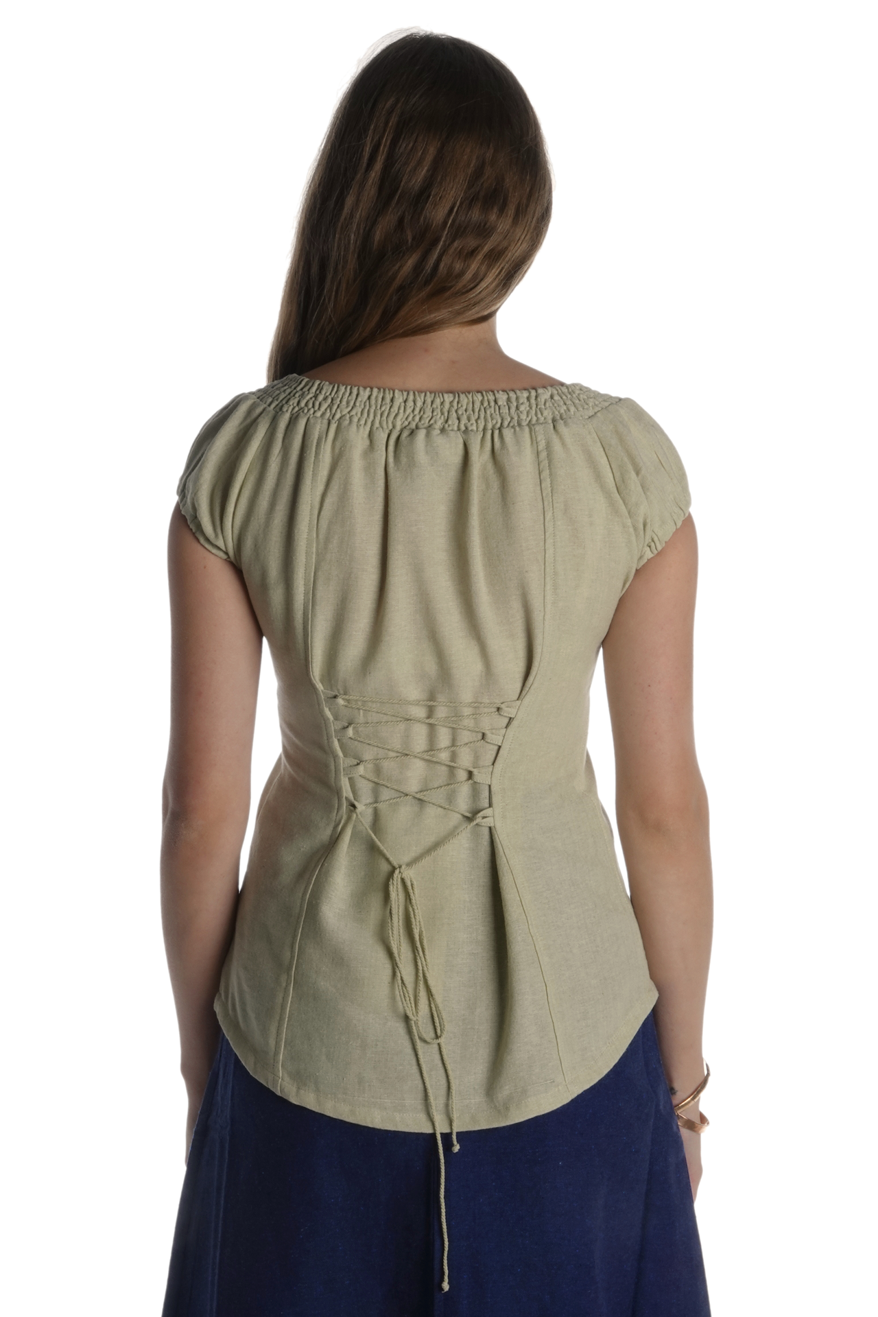 Unsere Mittelalterbluse "Elissa" hat einen V-Ausschnitt mit einer dekorativen Schnürung vorne, sowie lange Ärmel mit Schnürungen am Handgelenk. Der lockere Schnitt sorgt für Komfort und Authentizität, während die Schnürungen einen femininen und eleganten Touch verleihen.