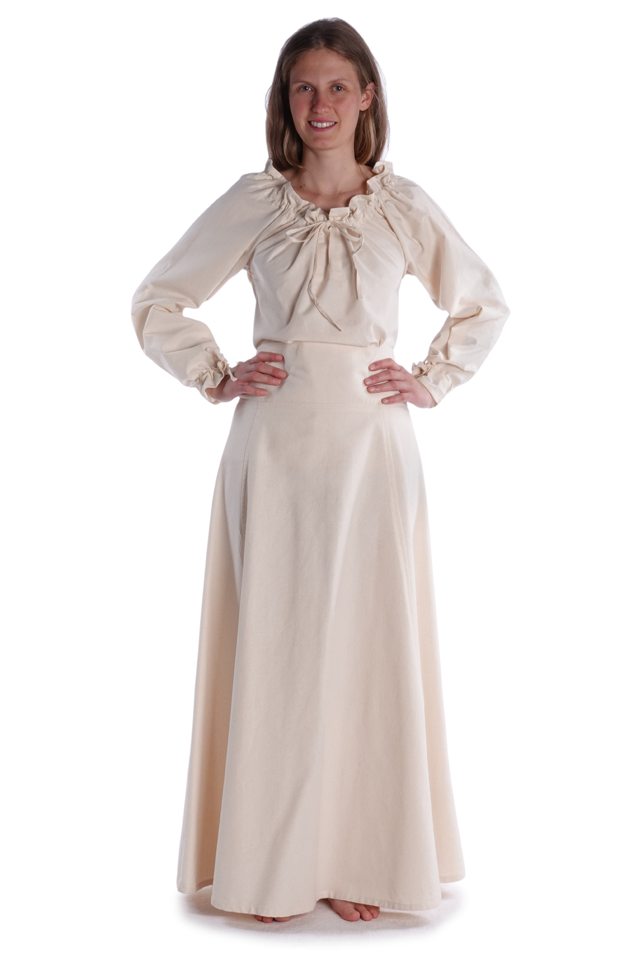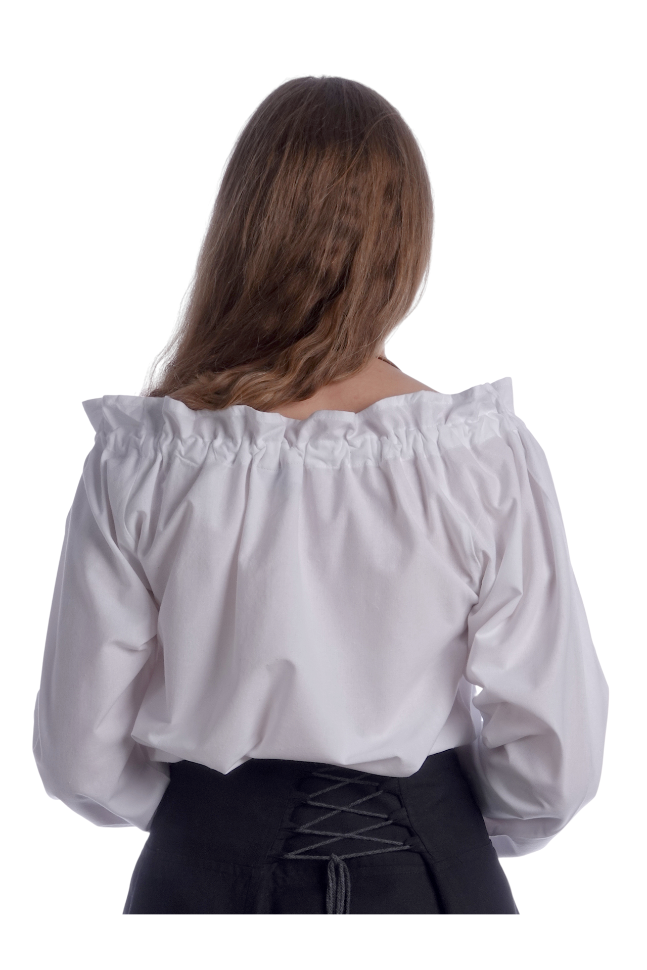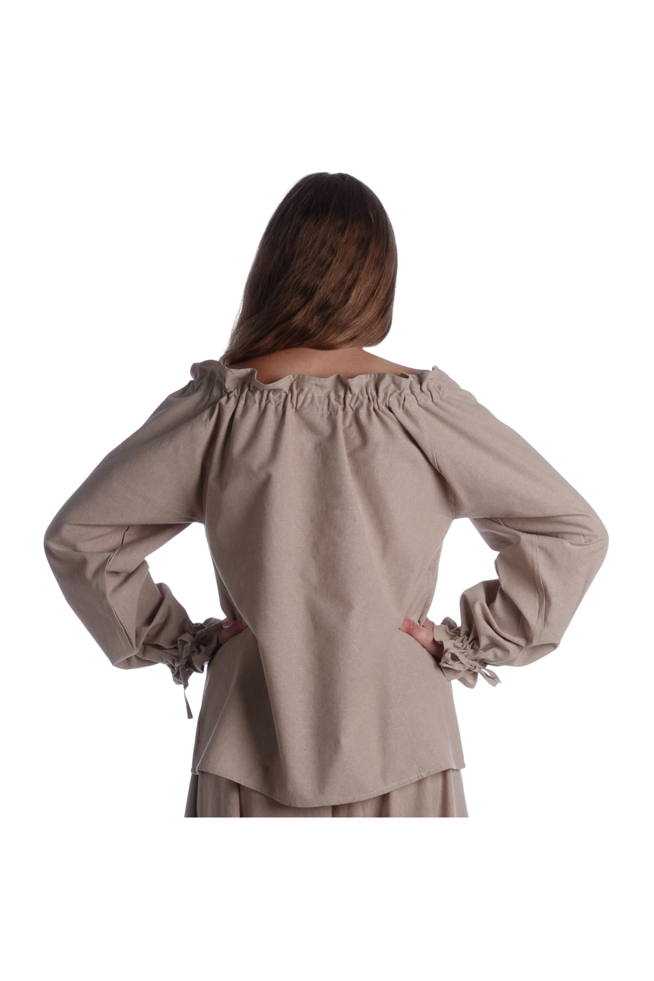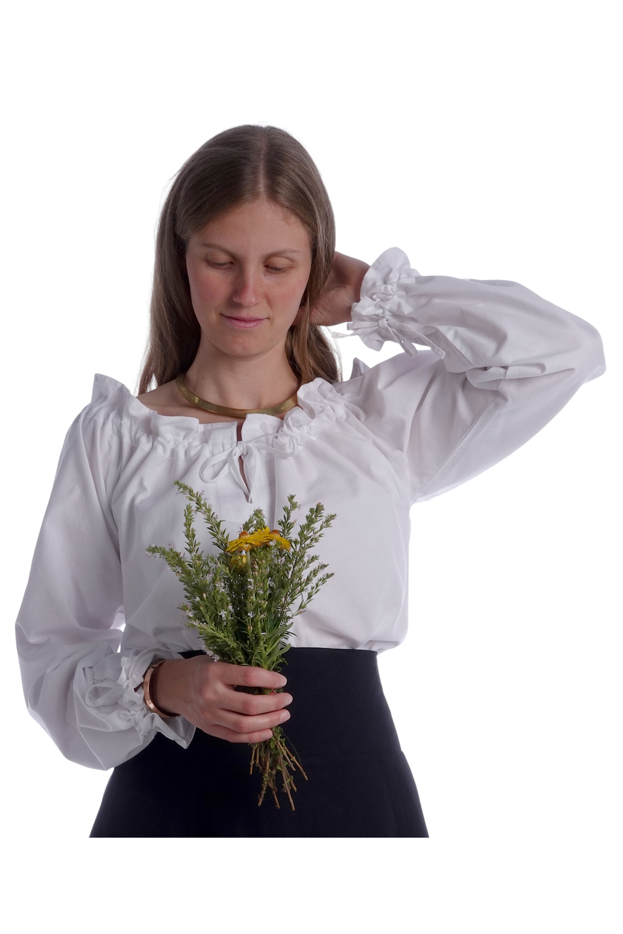 Diese mittelalterlich inspirierte Damenbluse besteht aus reiner, naturbelassener Baumwolle. Die Nutzung von natürlichen Textilien ist nicht nur kennzeichnend für die Ära des Mittelalters, sondern zudem trägt sich der Stoff auch äußerst angenehm. Die leichte Baumwolle wurde mit Leinenstruktur gewebt. Ferner ist die hohe, feine Stoffqualität Garant für die Nachhaltigkeit des Kleidungsstückes.