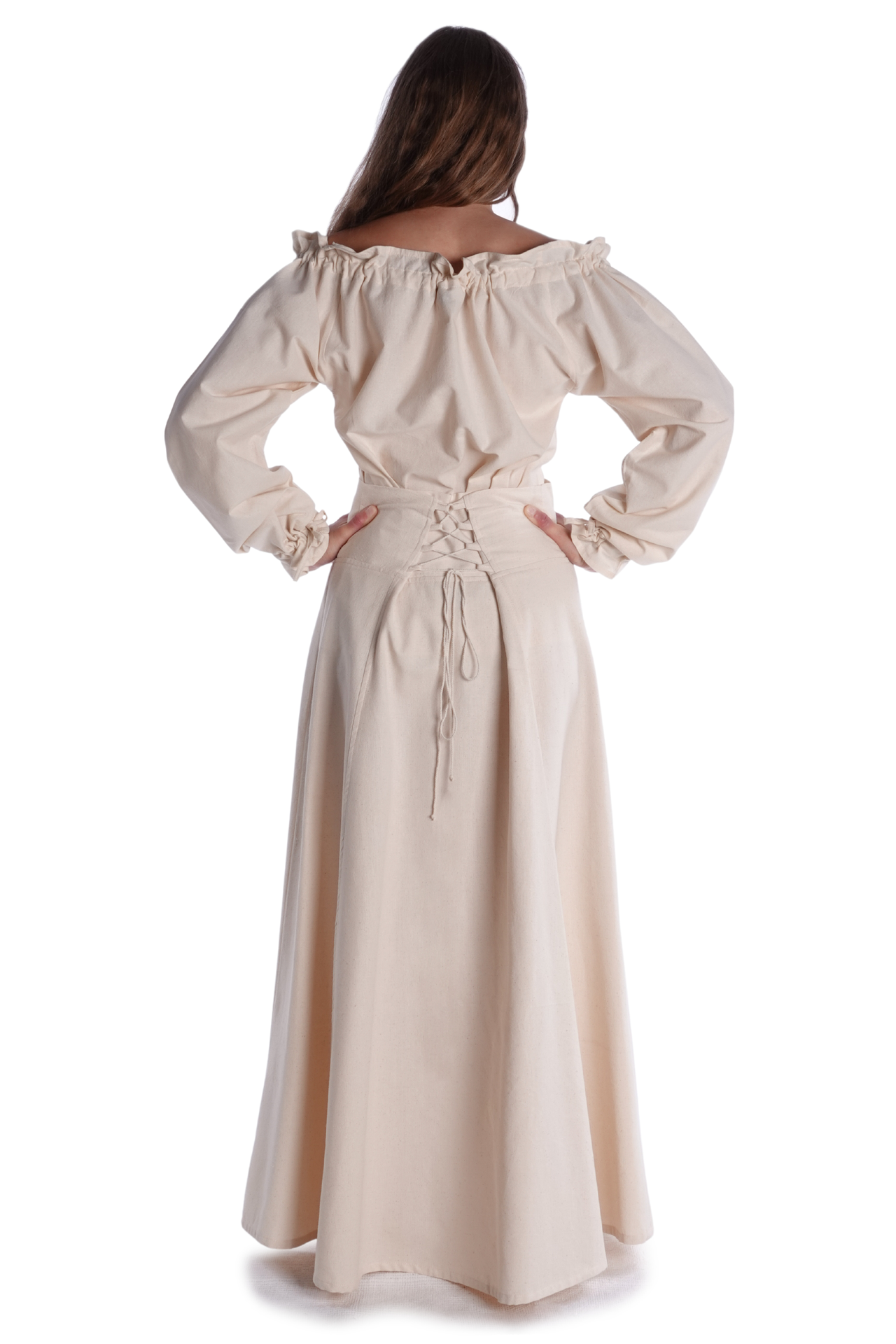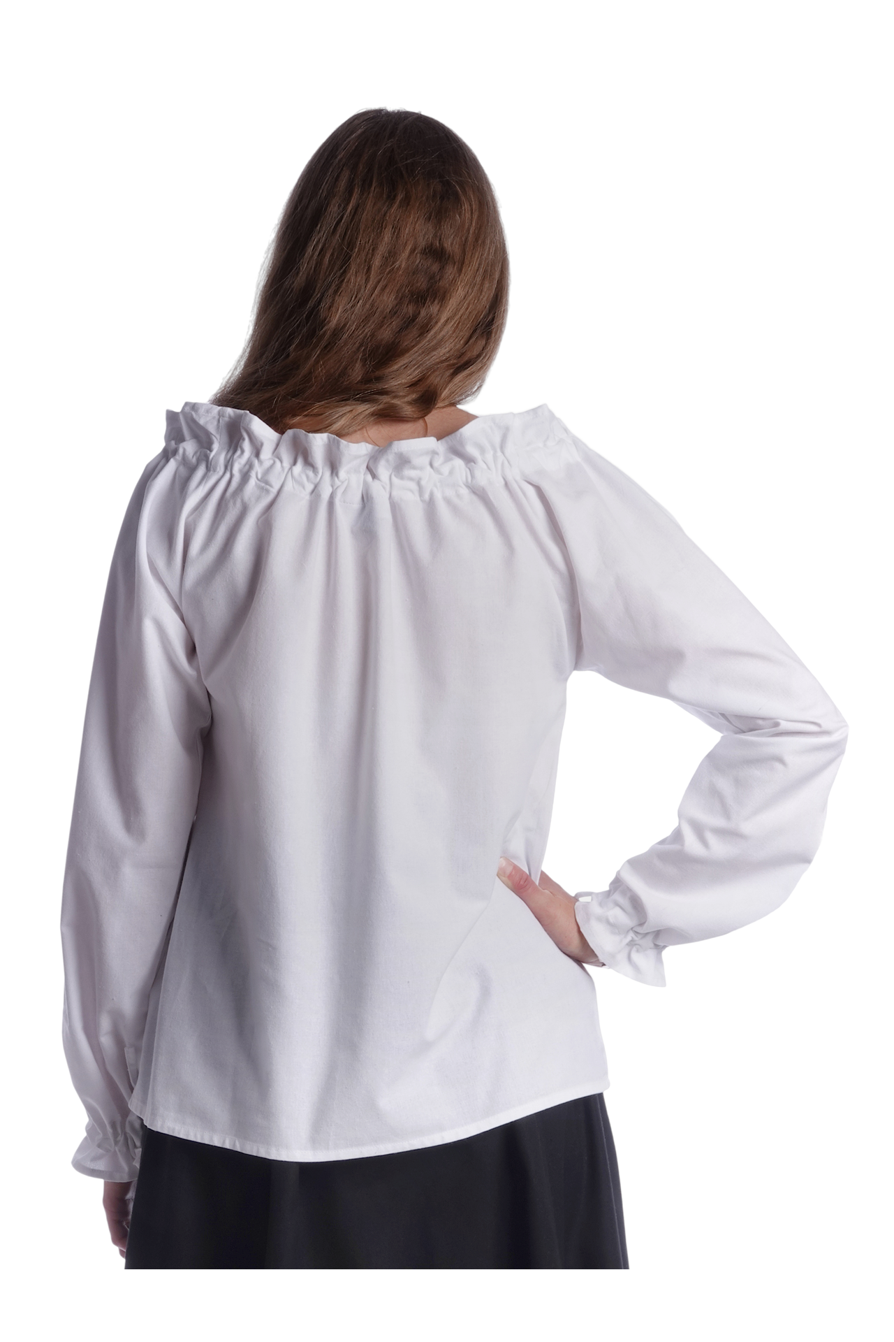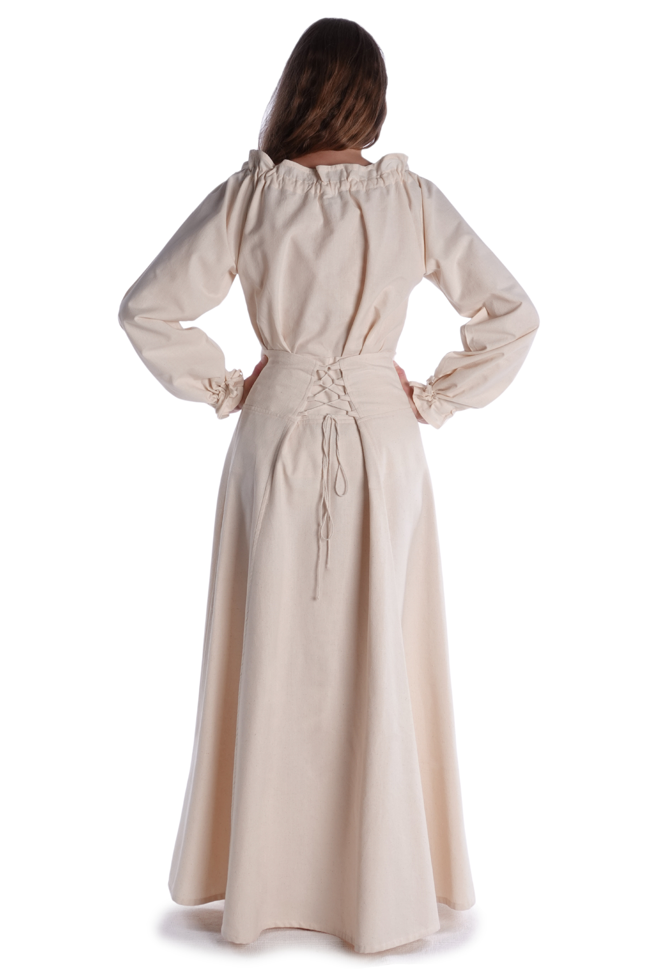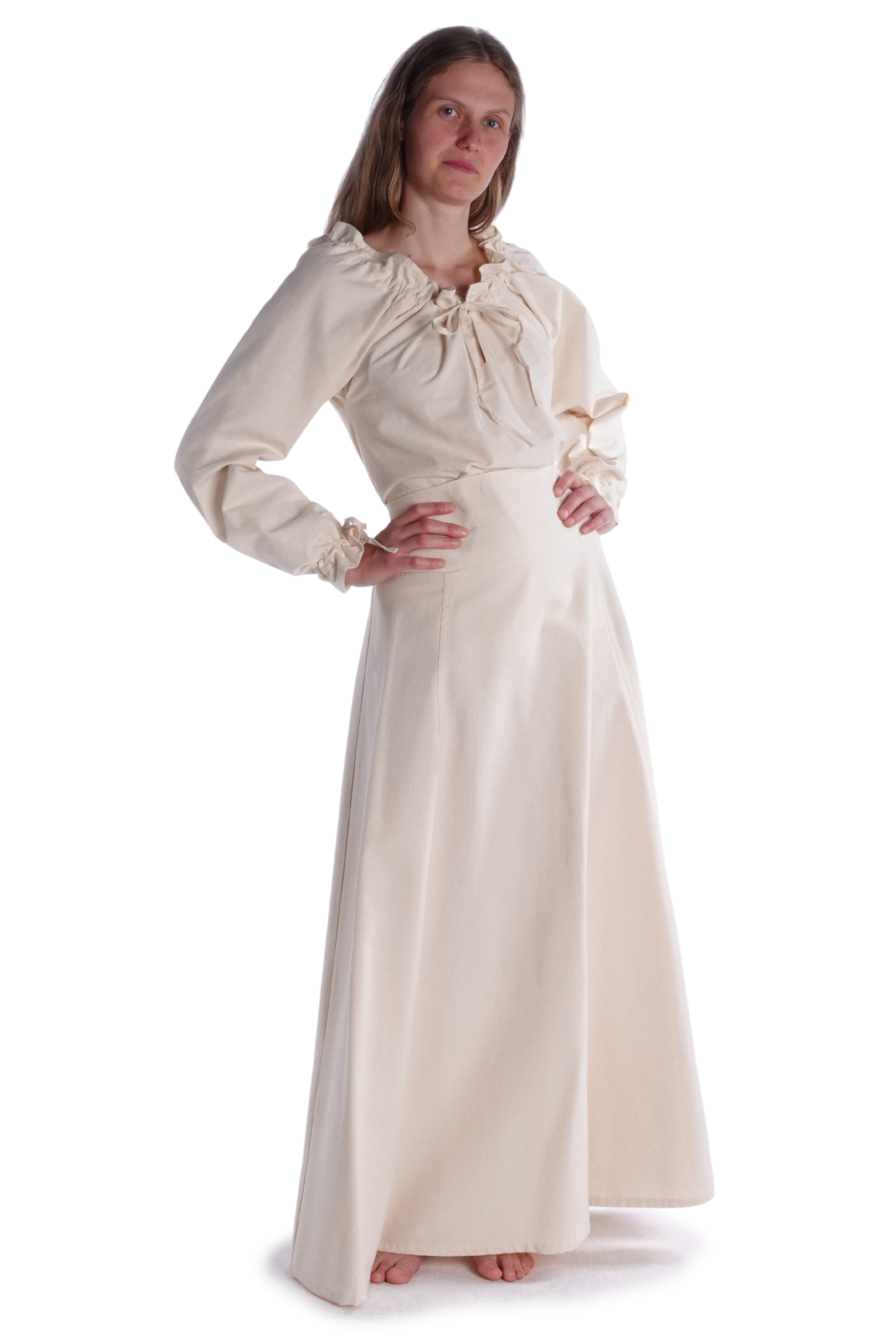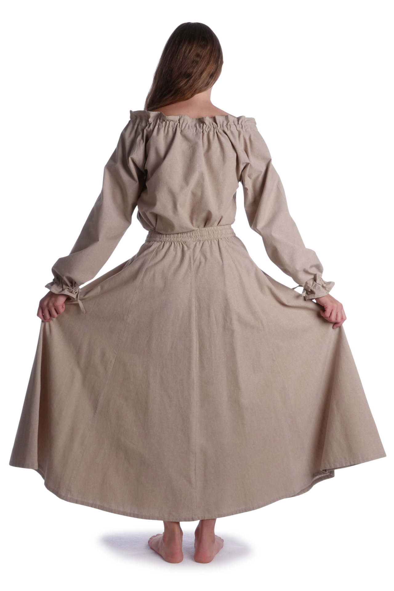 Diese mittelalterlich inspirierte Damenbluse besteht aus reiner, naturbelassener Baumwolle. Die Nutzung von natürlichen Textilien ist nicht nur kennzeichnend für die Ära des Mittelalters, sondern zudem trägt sich der Stoff auch äußerst angenehm. Die leichte Baumwolle wurde mit Leinenstruktur gewebt. Ferner ist die hohe, feine Stoffqualität Garant für die Nachhaltigkeit des Kleidungsstückes.