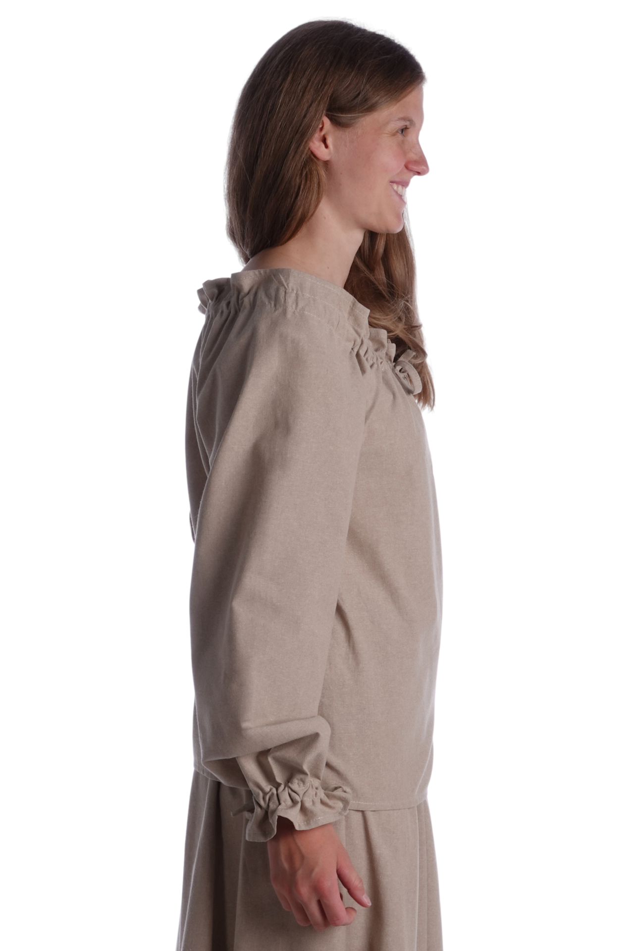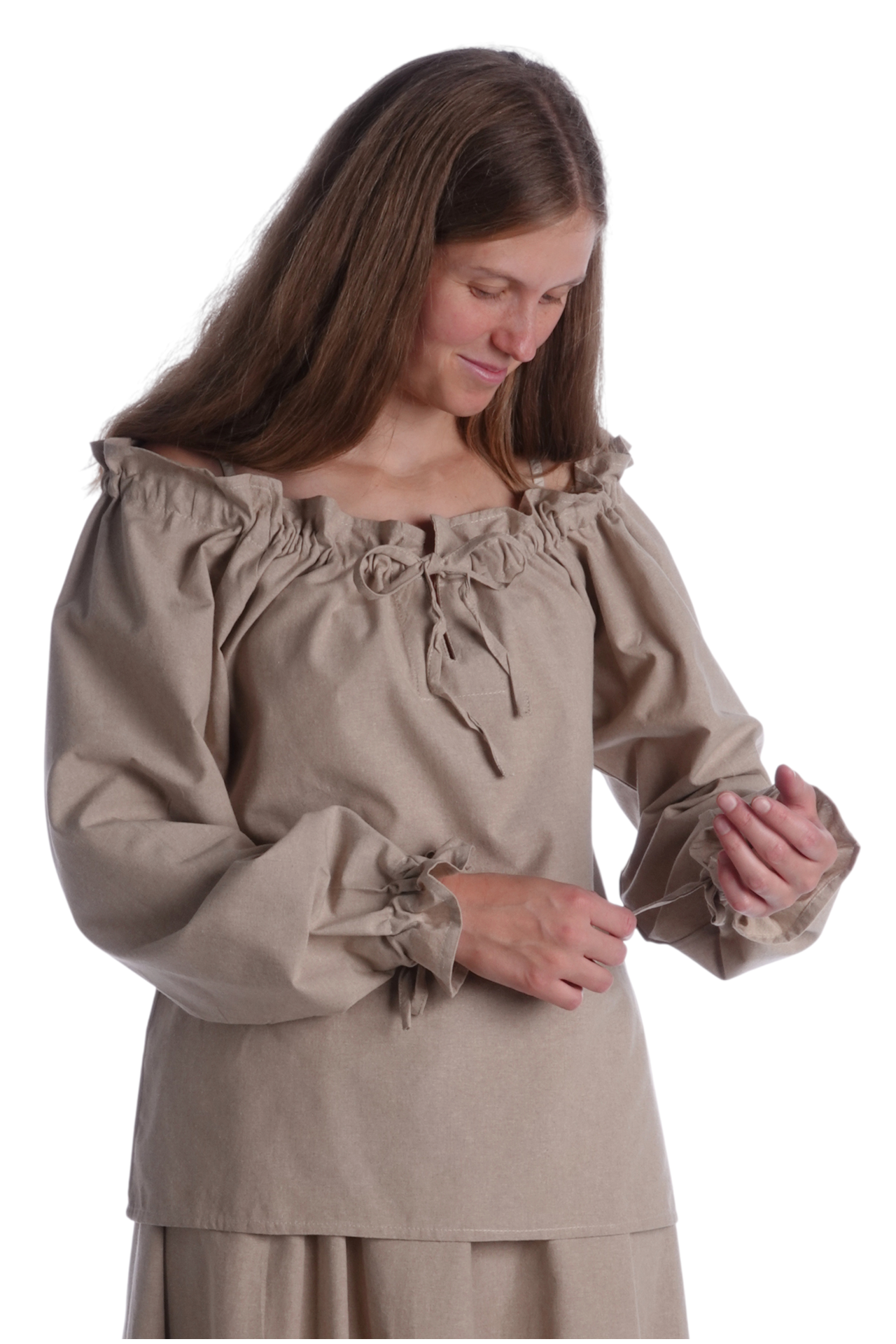 Unsere Mittelalterbluse „Gotelinde“ hat Schnürungen jeweils am runden Halsausschnitt sowie an den Ärmeln. Durch diese ist die individuelle Passform der Bluse nicht nur flexibel anpassbar, sondern es entstehen darüber hinaus durch die Raffung dekorative Rüschen.