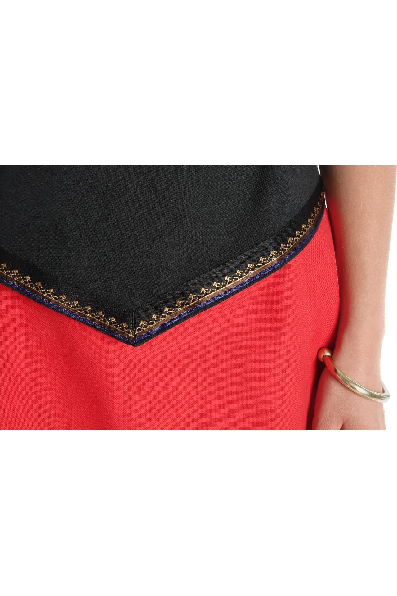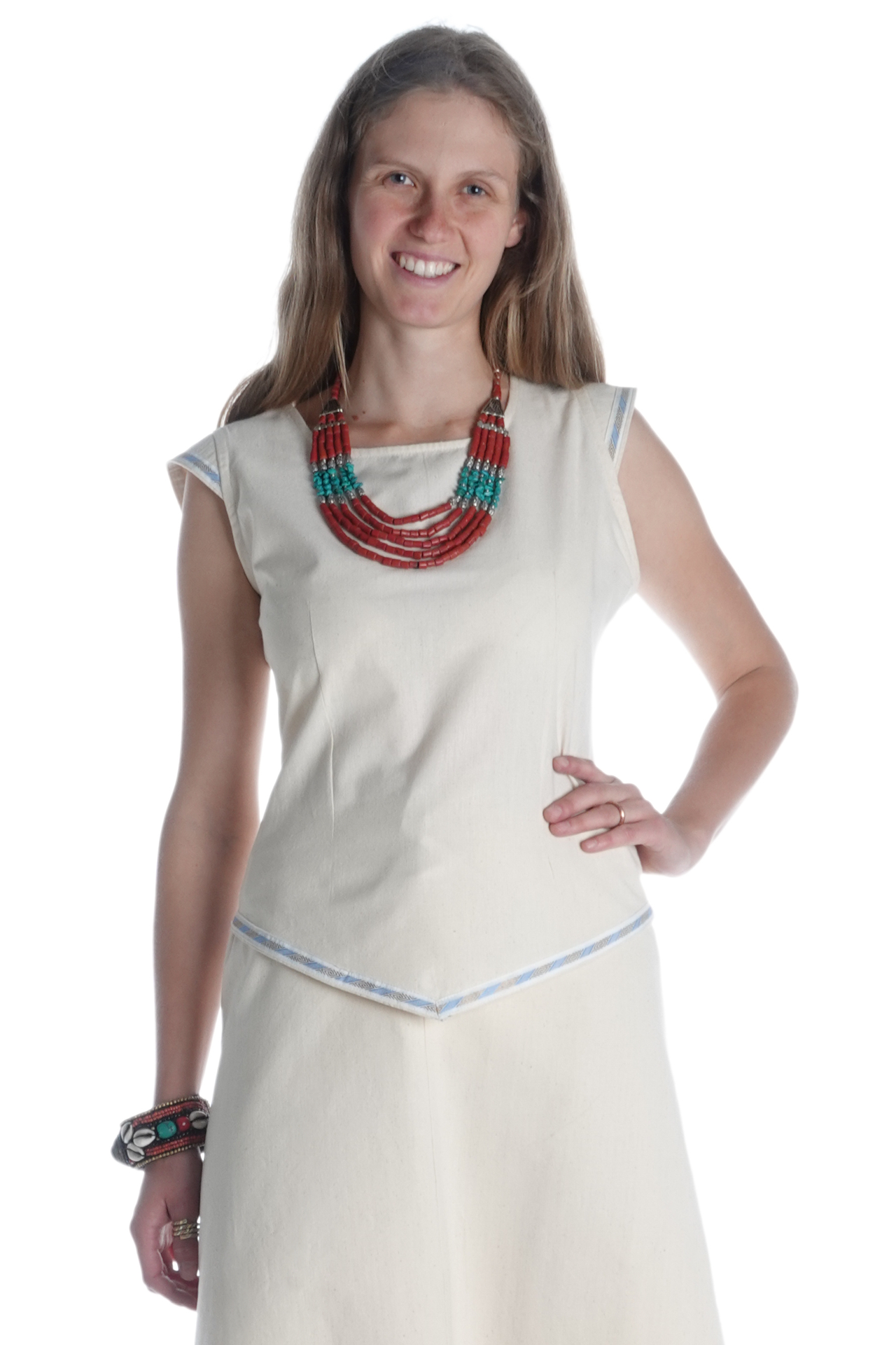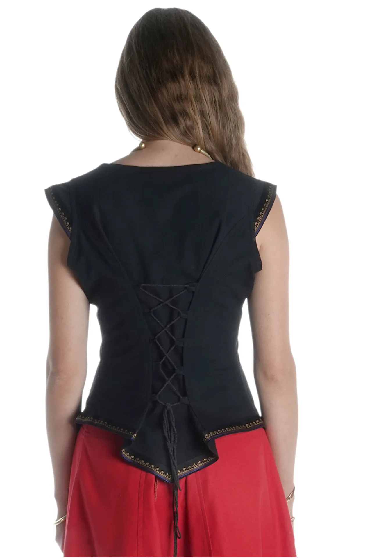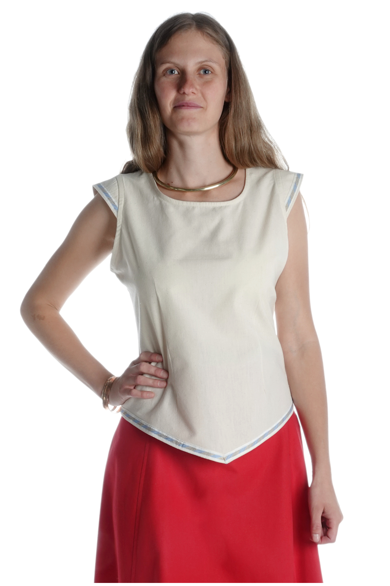 Unsere ärmellose Mittelalterbluse "Neifile" hat einen runden Halsausschnitt mit einer dekorativen Schnürung am Rücken. Die Bluse läuft spitz zu un wird an den Ärmeln sowie am unteren Saum mit einer wunderschönen Bordüre abgeschlossen. Der Schnitt sorgt für Komfort und Authentizität, während die Schnürungen einen femininen und eleganten Touch verleihen.