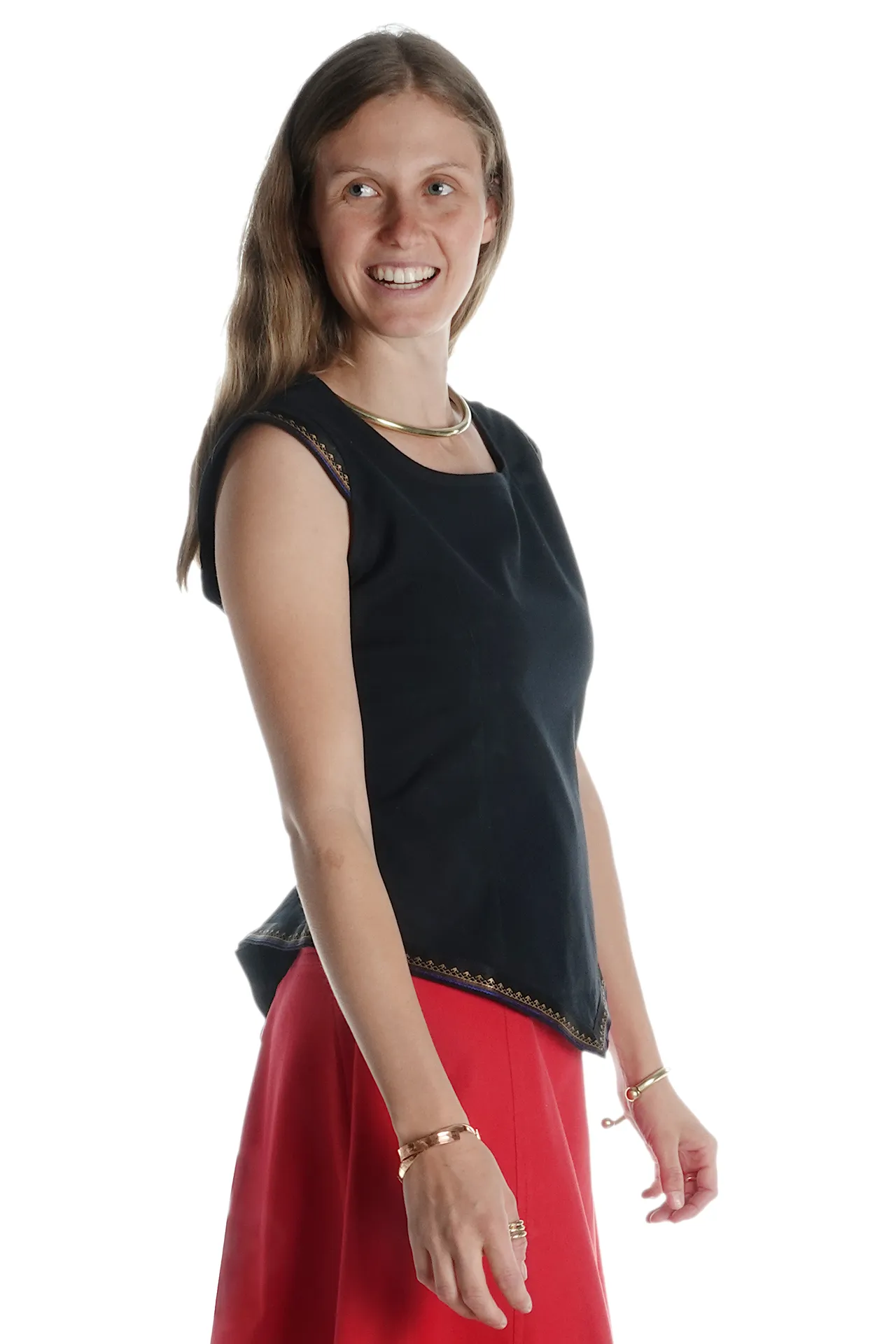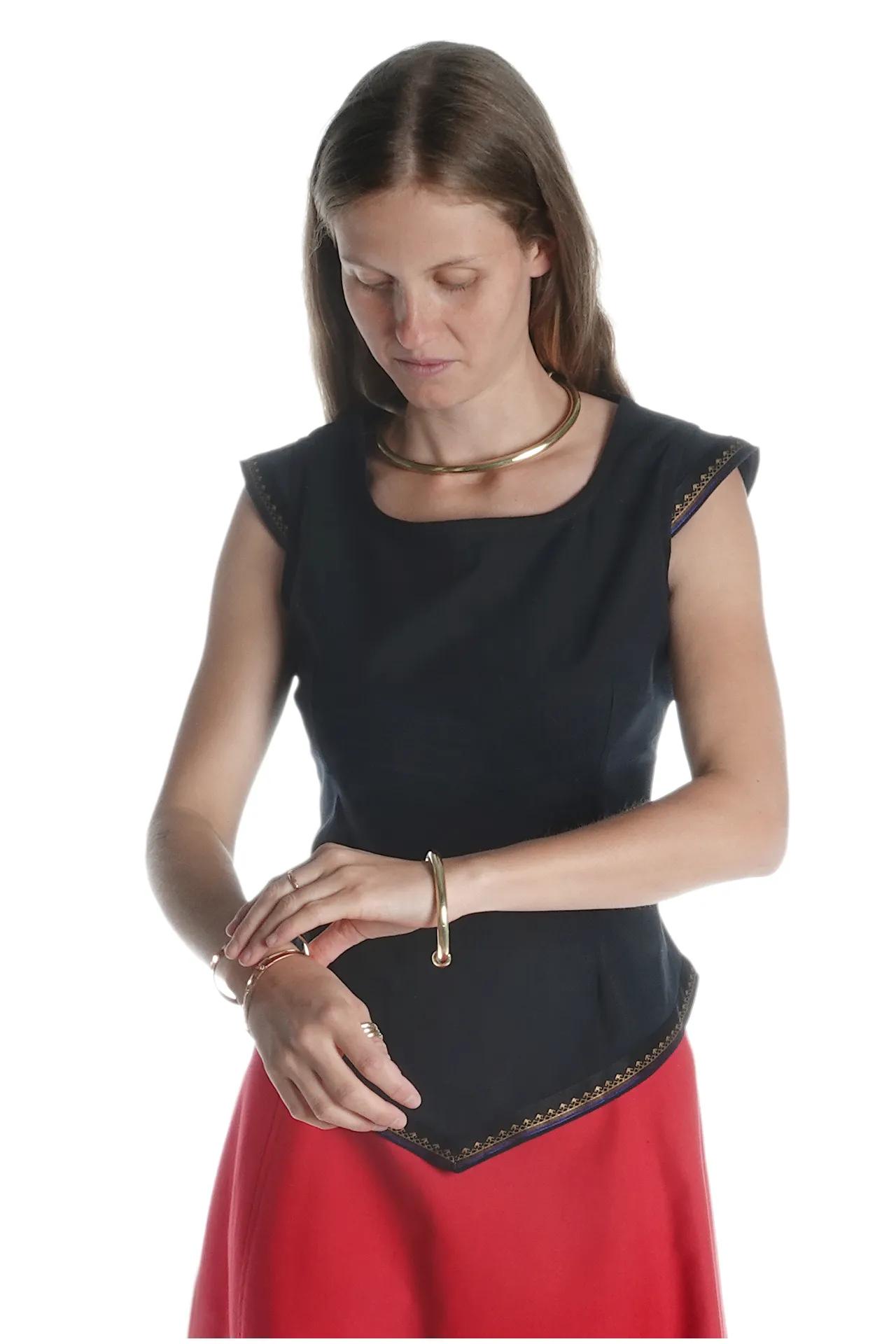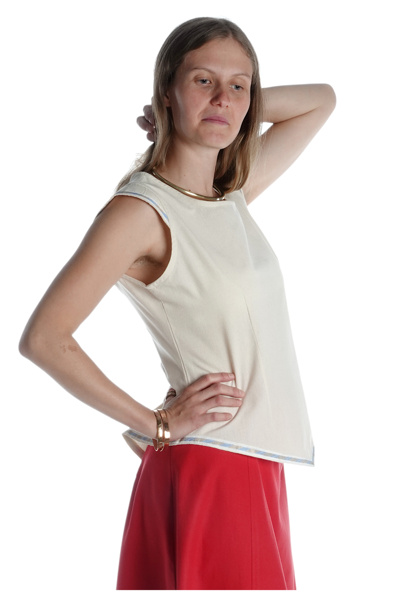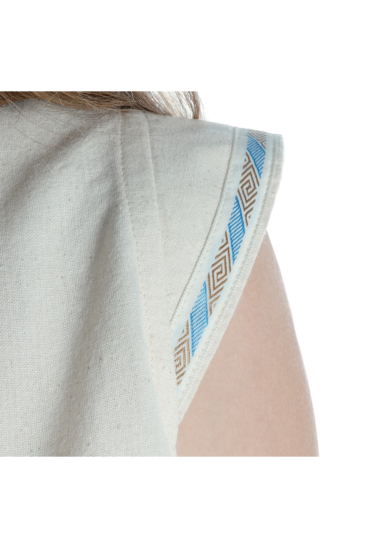 Unsere ärmellose Mittelalterbluse "Neifile" hat einen runden Halsausschnitt mit einer dekorativen Schnürung am Rücken. Die Bluse läuft spitz zu un wird an den Ärmeln sowie am unteren Saum mit einer wunderschönen Bordüre abgeschlossen. Der Schnitt sorgt für Komfort und Authentizität, während die Schnürungen einen femininen und eleganten Touch verleihen.