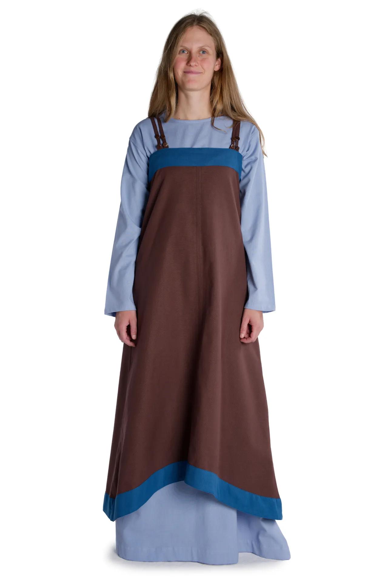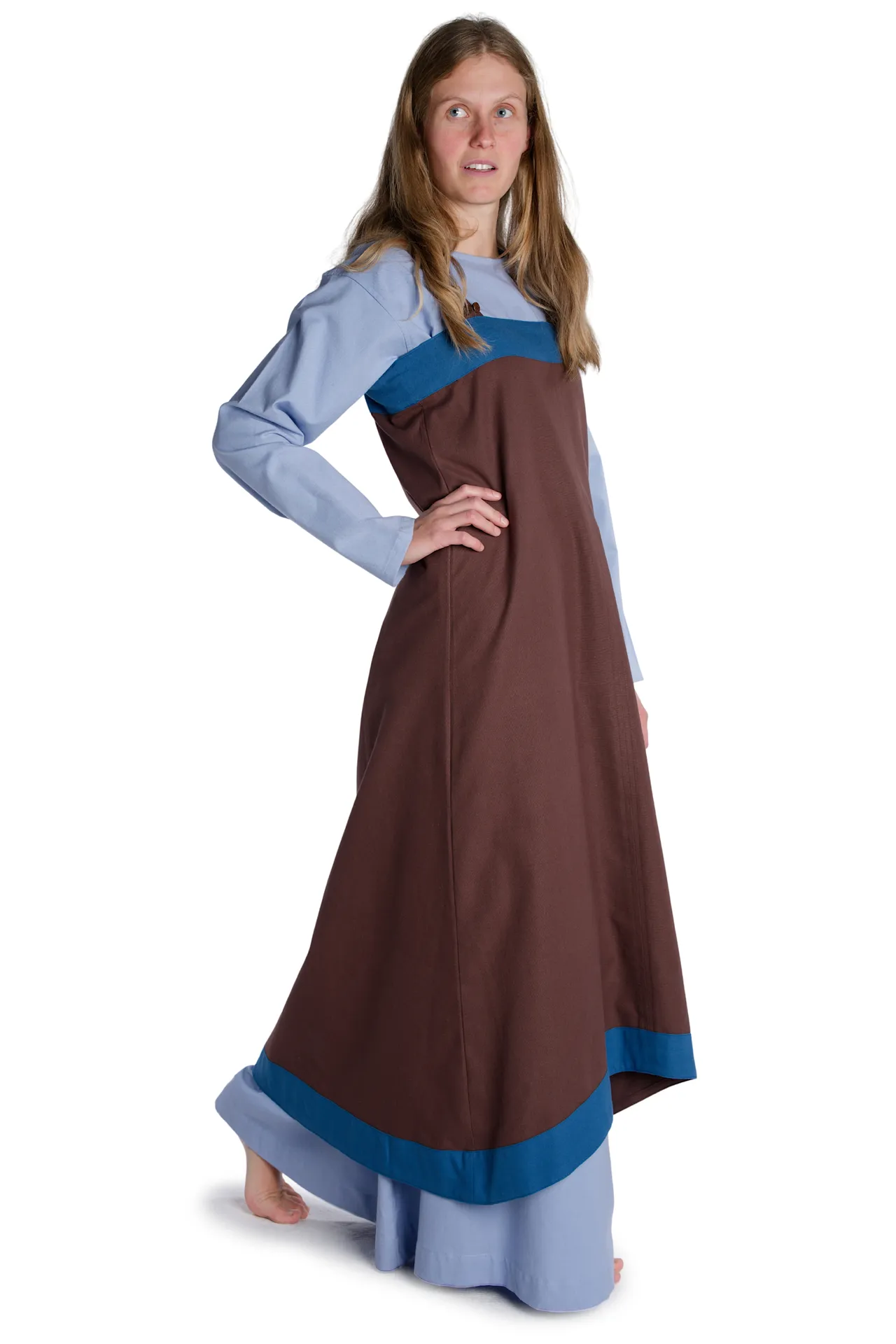 Dieses nach historischen Vorlagen entworfene Kleid wurde aus naturbelassener Baumwolle angefertigt. Die ausschließliche Verwendung von natürlichen Materialien ist kennzeichnend für die Epoche des Mittelalters. Aber nicht nur die originalgetreue Stoffwahl besticht, sondern auch der Umstand, dass die reine Baumwolle sehr angenehm zu tragen ist. Und nicht zuletzt garantiert die feine und hohe Stoffqualität die Langlebigkeit und Nachhaltigkeit des Kleidungsstückes.