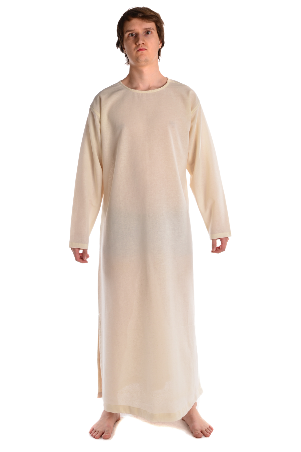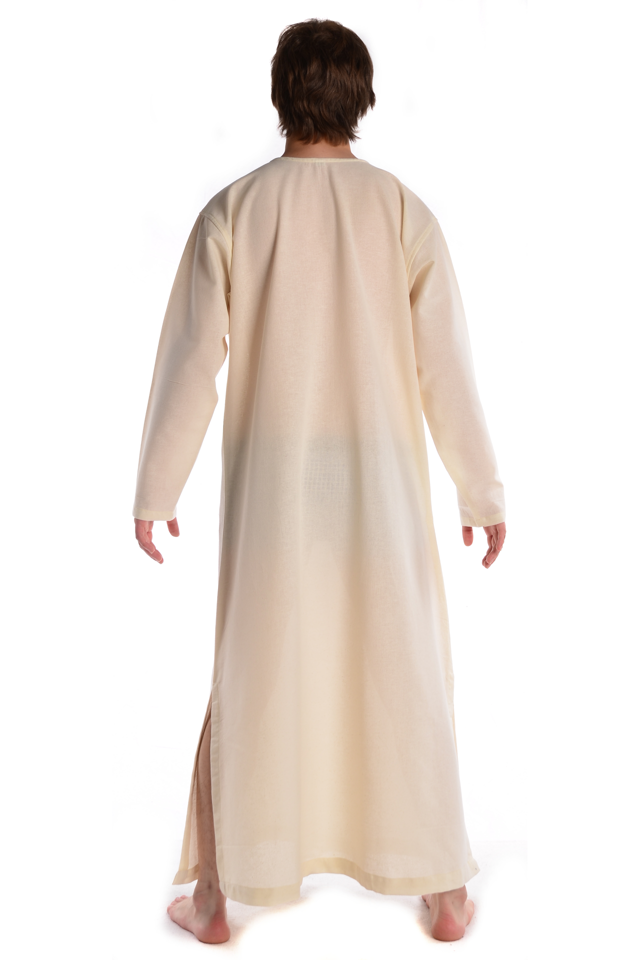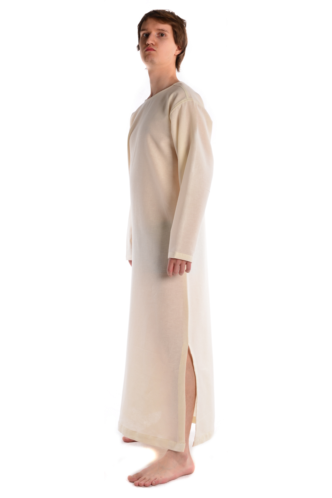 Dieses nach historischen Vorlagen entworfene Untergewand wurde aus naturbelassener, leichter Baumwolle angefertigt. Die ausschließliche Verwendung von natürlichen Materialien ist kennzeichnend für die Epoche des Mittelalters. Aber nicht nur die originalgetreue Stoffwahl besticht, sondern auch der Umstand, dass die reine Baumwolle sehr angenehm zu tragen ist. Und nicht zuletzt garantiert die feine und hohe Stoffqualität die Langlebigkeit und Nachhaltigkeit des Kleidungsstückes.