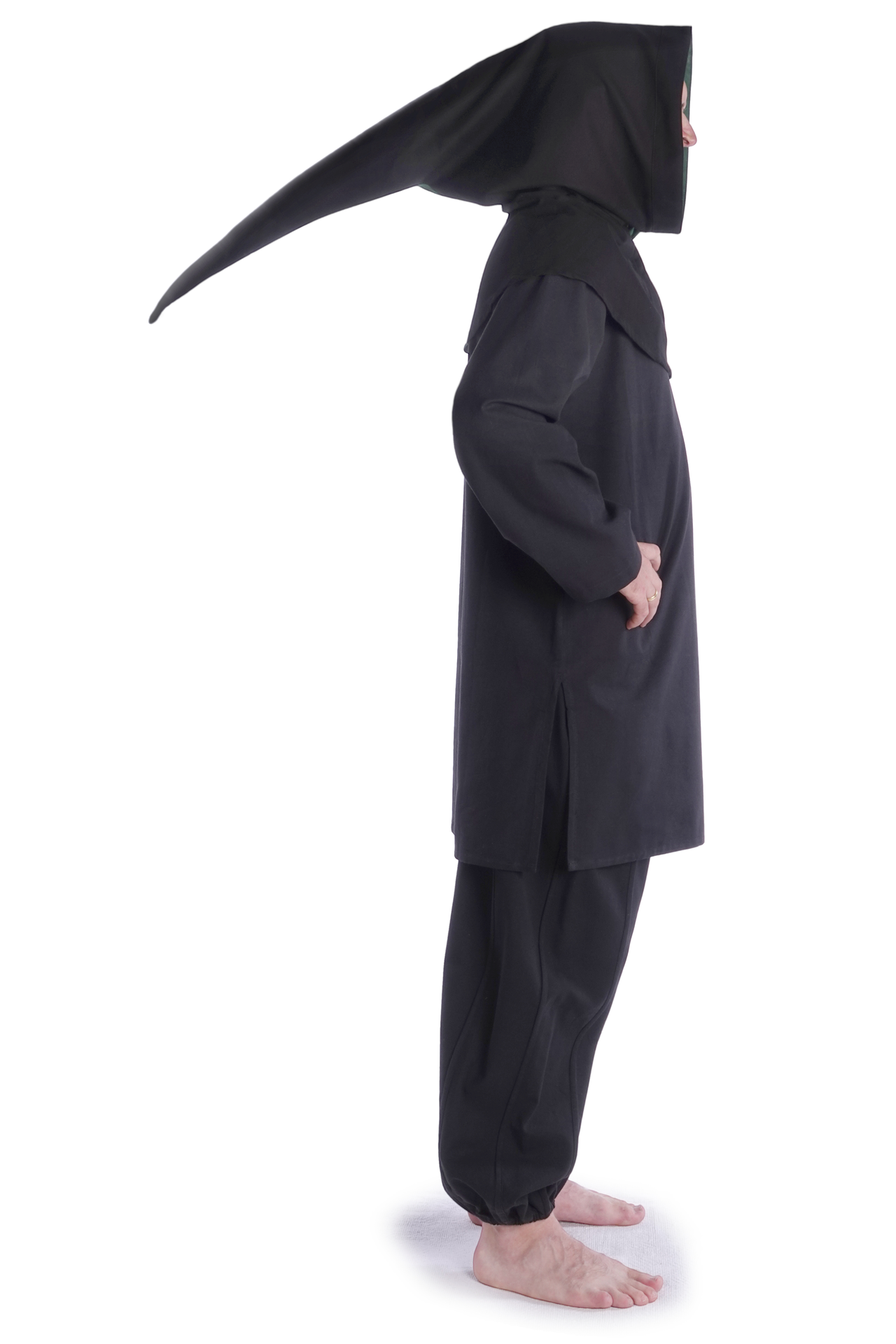 Unsere Gugel „Etzel“ hat eine Kapuze mit langem Zipfel. Außerdem weist „Etzel“ eine großzügig geschnittene, runde Schulterpartie auf. Da sie geschlossen ist, ist diese Kopfbedeckung durch Hineinschlüpfen anzuziehen, was aber durch die Weite der Kapuze keinesfalls unkomfortabel ist. Das pelerinenartige Schulterkleid geht in eine kurze Kragenpartie über, die eine optimale Passform des mittelalterlichen Kleidungsstücks gewährleistet. Des Weiteren entspringt am Kragen eine weite Kapuze, die in einem spitzen Zipfel ausläuft. Die Kapuze ist so geschnitten, dass sie bequem in die Stirn gezogen werden kann. Eine Besonderheit der Gugel liegt in ihrer zweifarbigen Farbgebung. Diese steht in der zweifarbigen Tradition der höfischen mi-parti - Mode (franz. für „halb geteilt“).