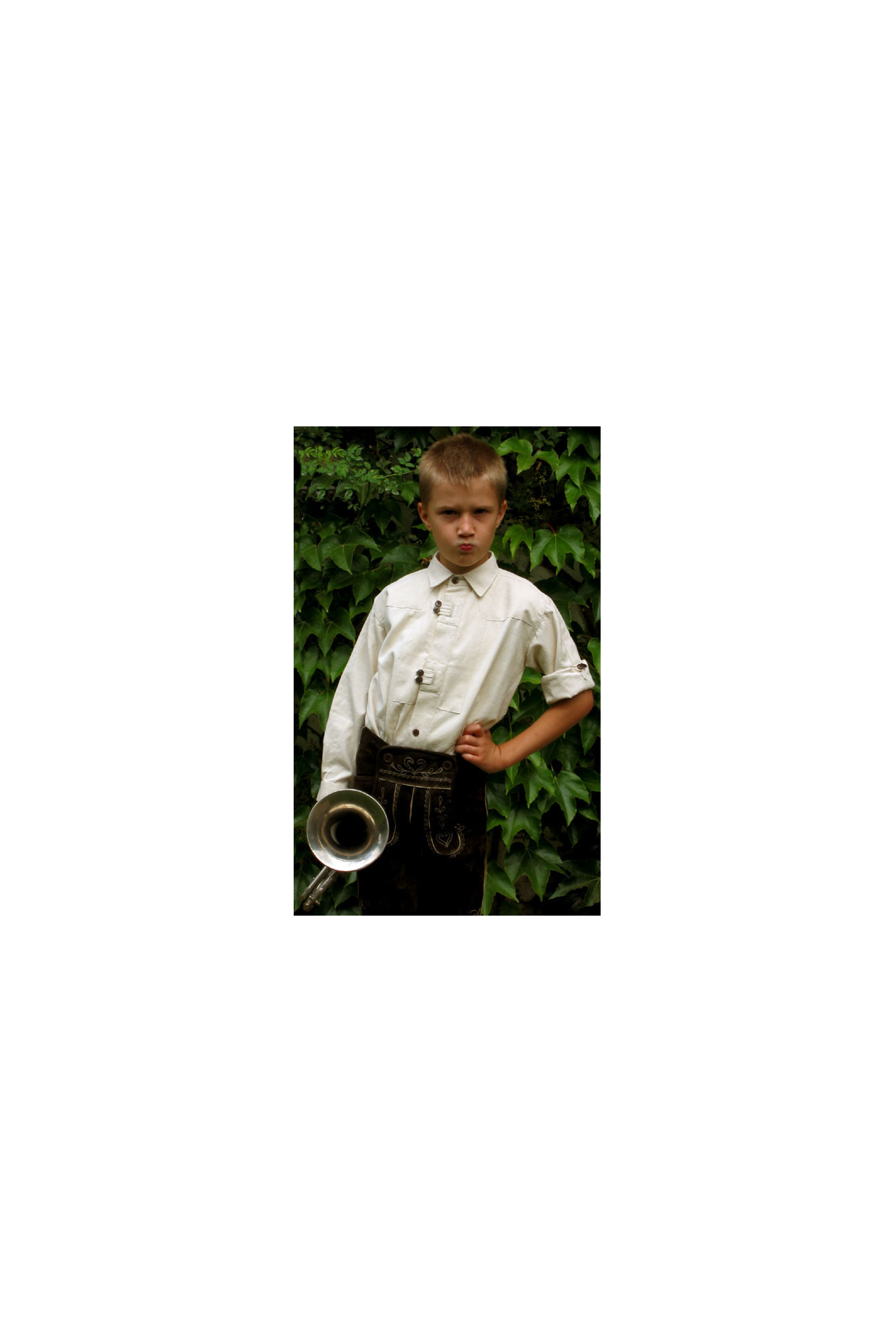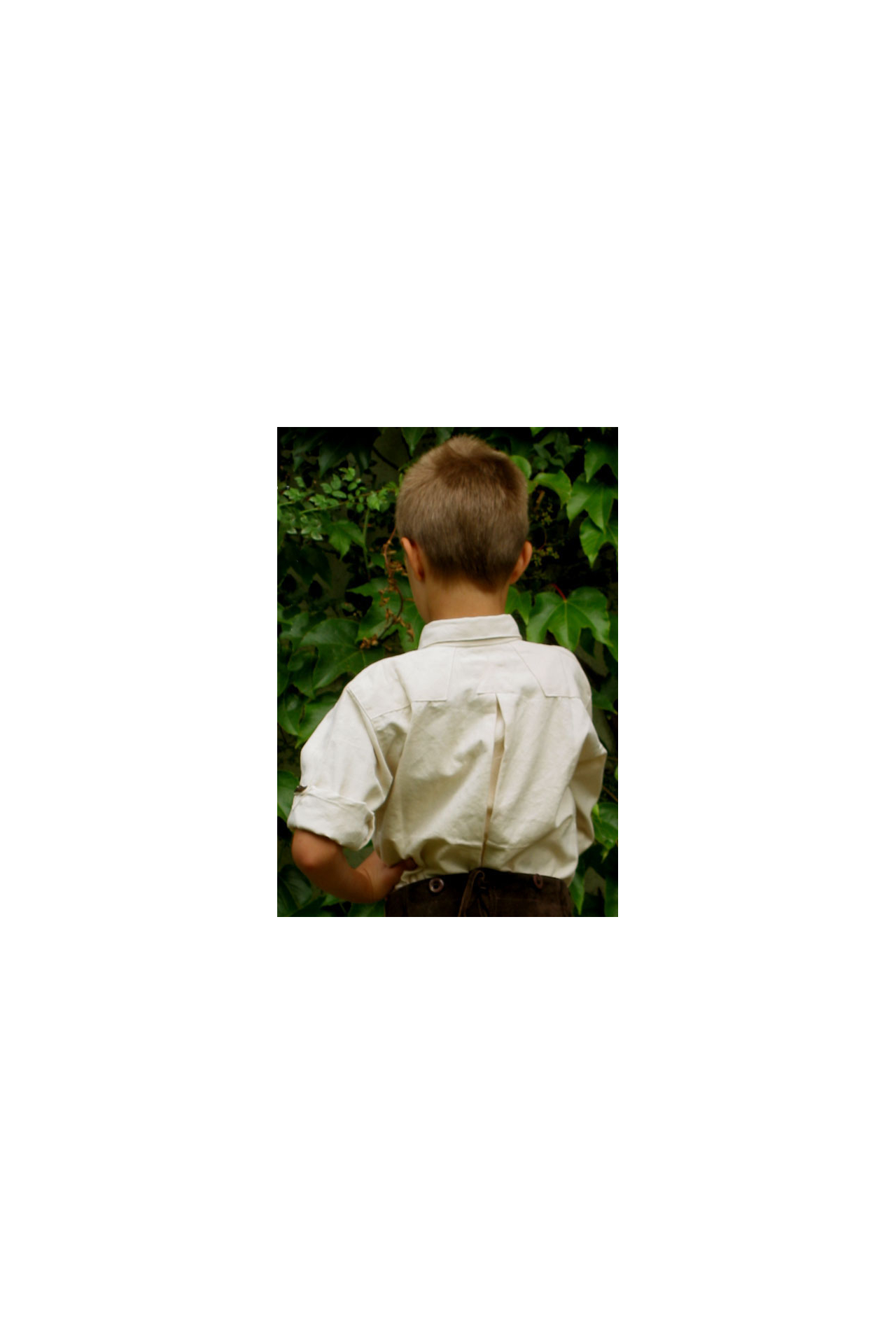 Unser Hemd „Grandin“ für Kinder wurde von der traditionellen bayerischen Tracht inspiriert. Es verfügt über eine durchgehende Brustknöpfung mit je zwei dekorativen Doppelschlaufen an der Knopfleiste. Darüber hinaus hat „Grandin" einen Kragen. Die Ärmel sind lang und weit geschnitten. Sie enden in Manschetten, die mit jeweils einem Knopf geschlossen werden können. Außerdem kann dieses Hemd auch gut mit hochgekrempelten Ärmeln getragen werden, da im Arm innen auf Höhe des Ellenbogens eine zusätzliche Knöpfung angebracht ist. So kann der gekrempelte Ärmel bequem mit einem weiteren ansprechenden Detail fixiert werden. Die Knöpfe bestehen aus Kokosnuss-Schale. Auf der Rückseite befindet sich ein klassischer Rückensattel mit mittiger Falz, um eine körpernahe Passform an der oberen Rückenpartie zu garantieren.