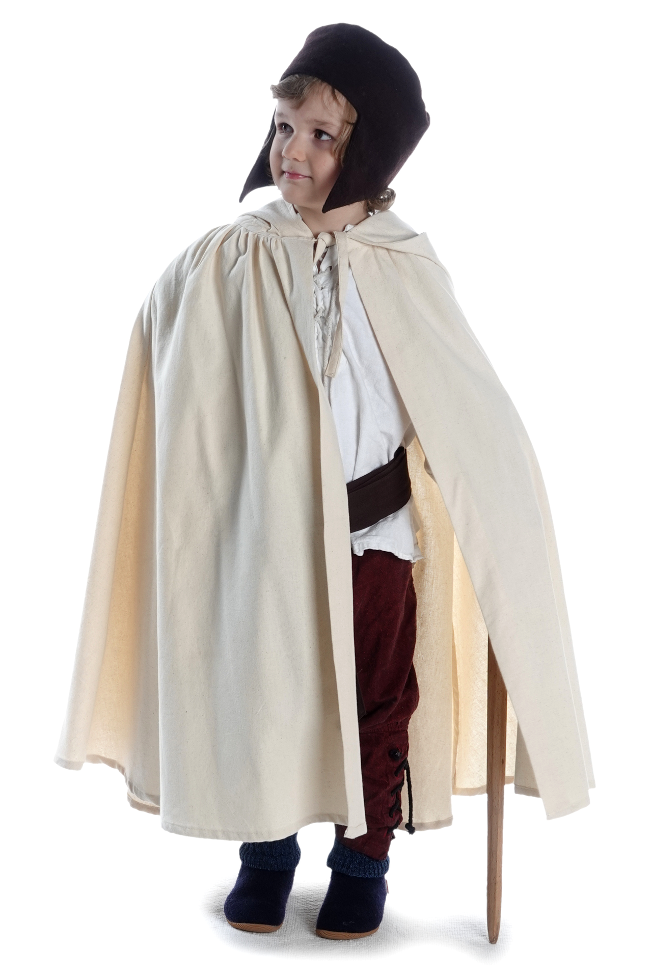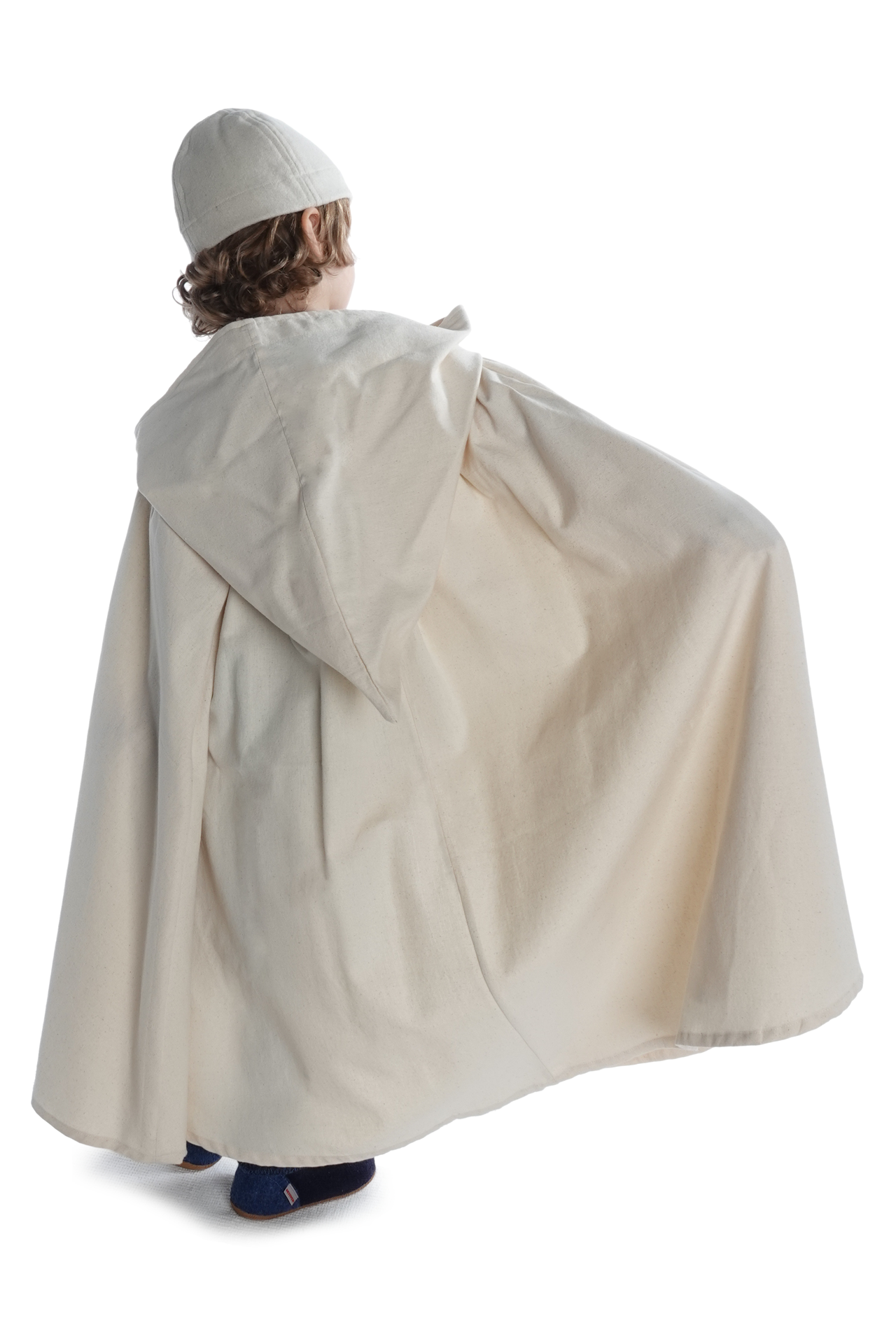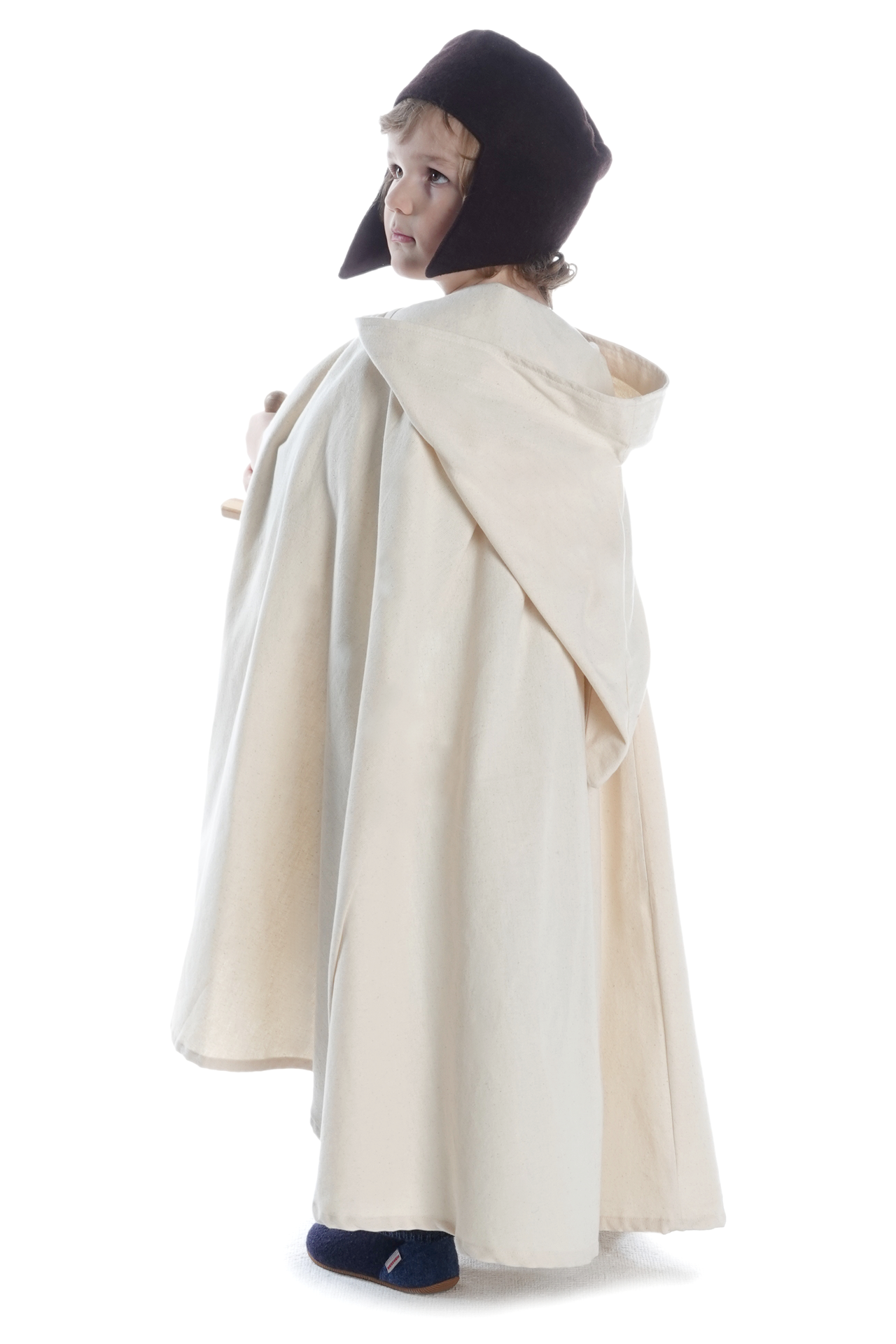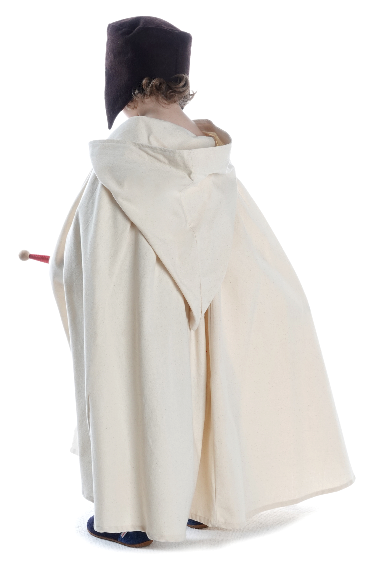 Unser Kinderumhang „Gandiluz“ ist ein historisch authentischer, langer Halbkreismantel mit Kapuze. Wie auch seine geschichtlichen Vorbilder kann er auf der Brust durch eine Schnürung und Knöpfe geschlossen werden.