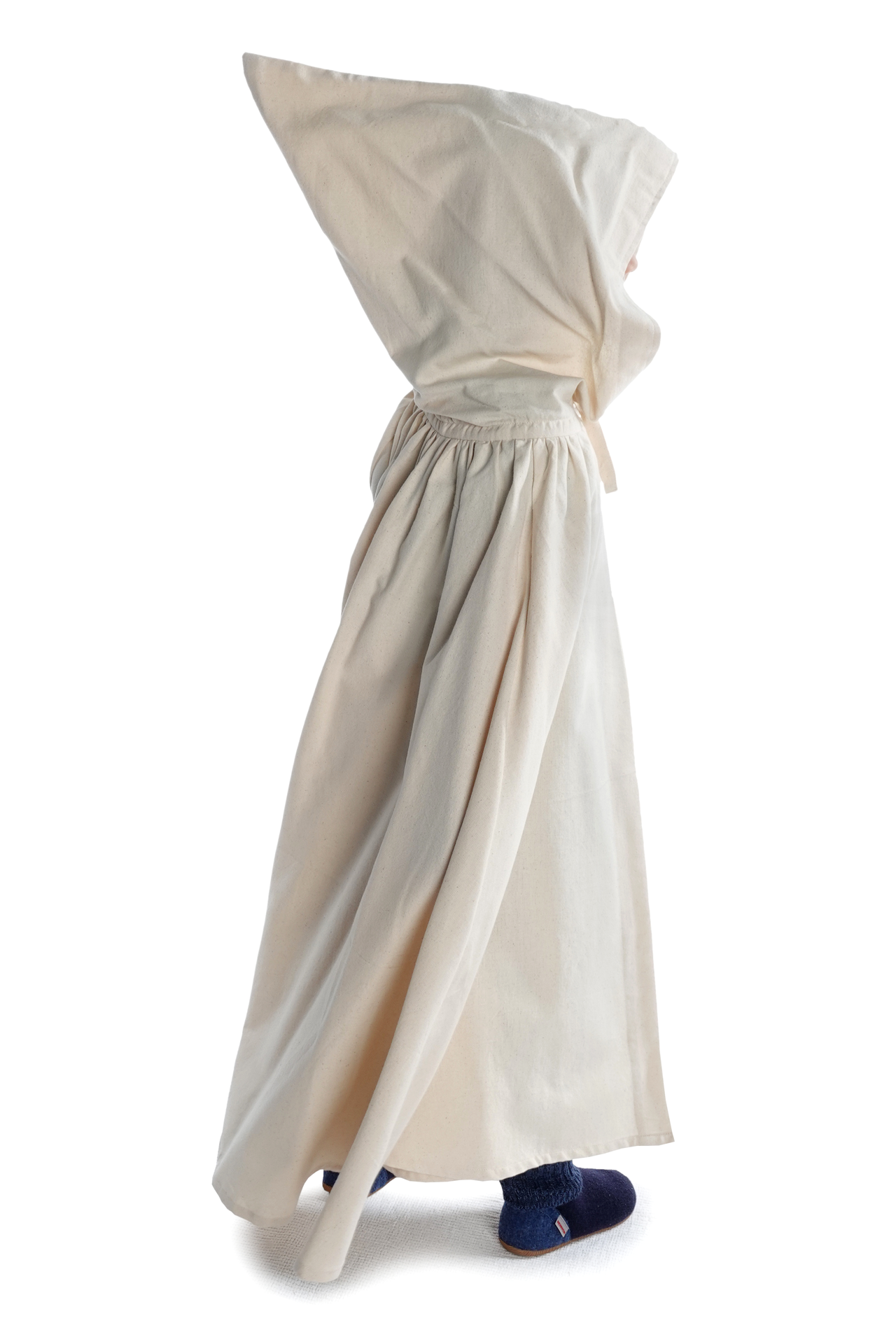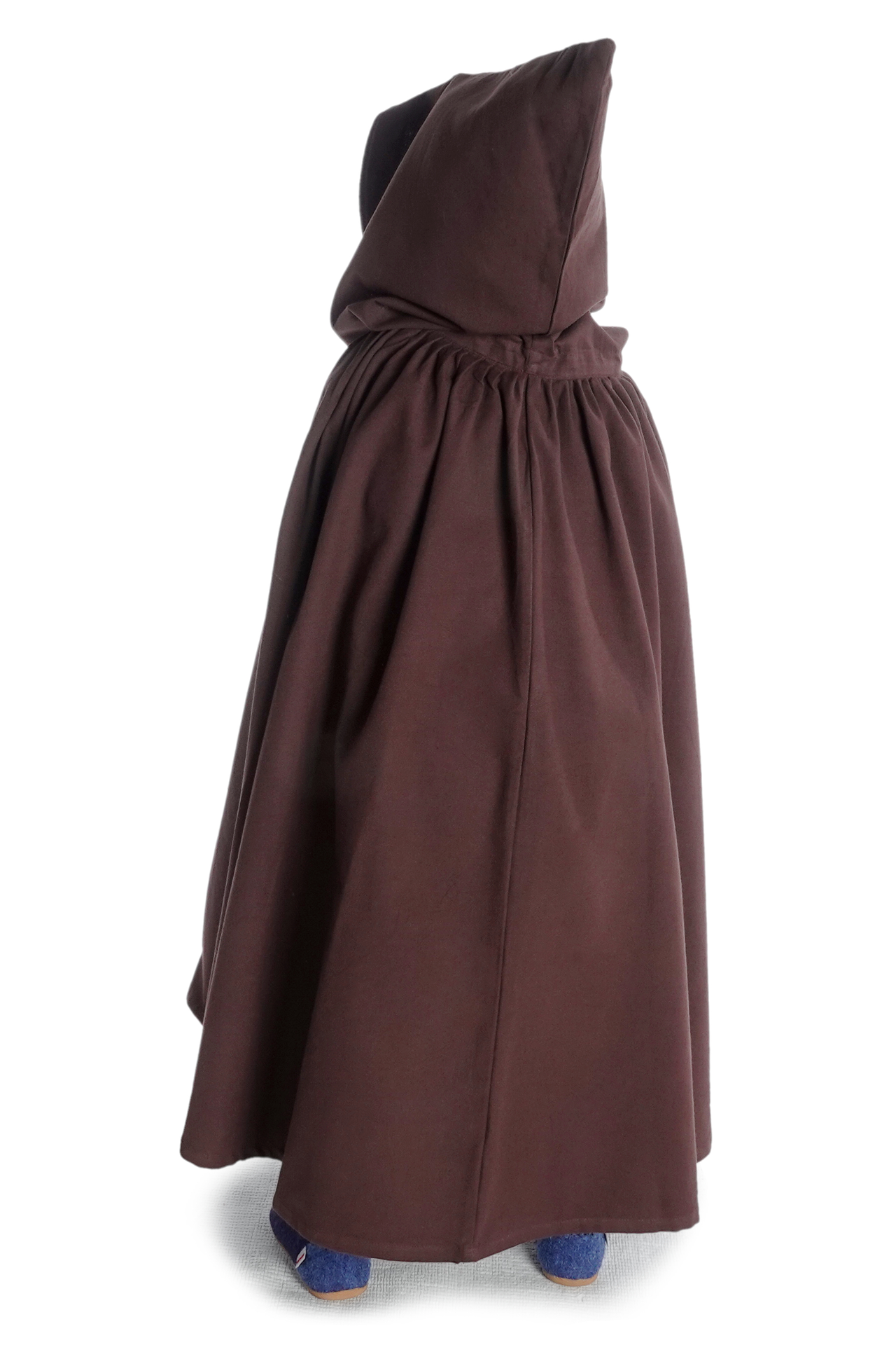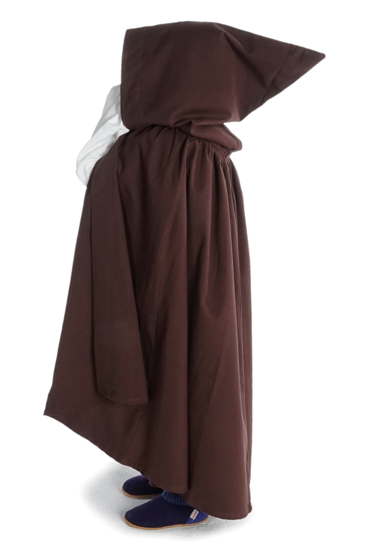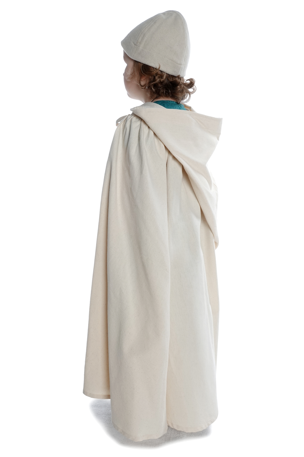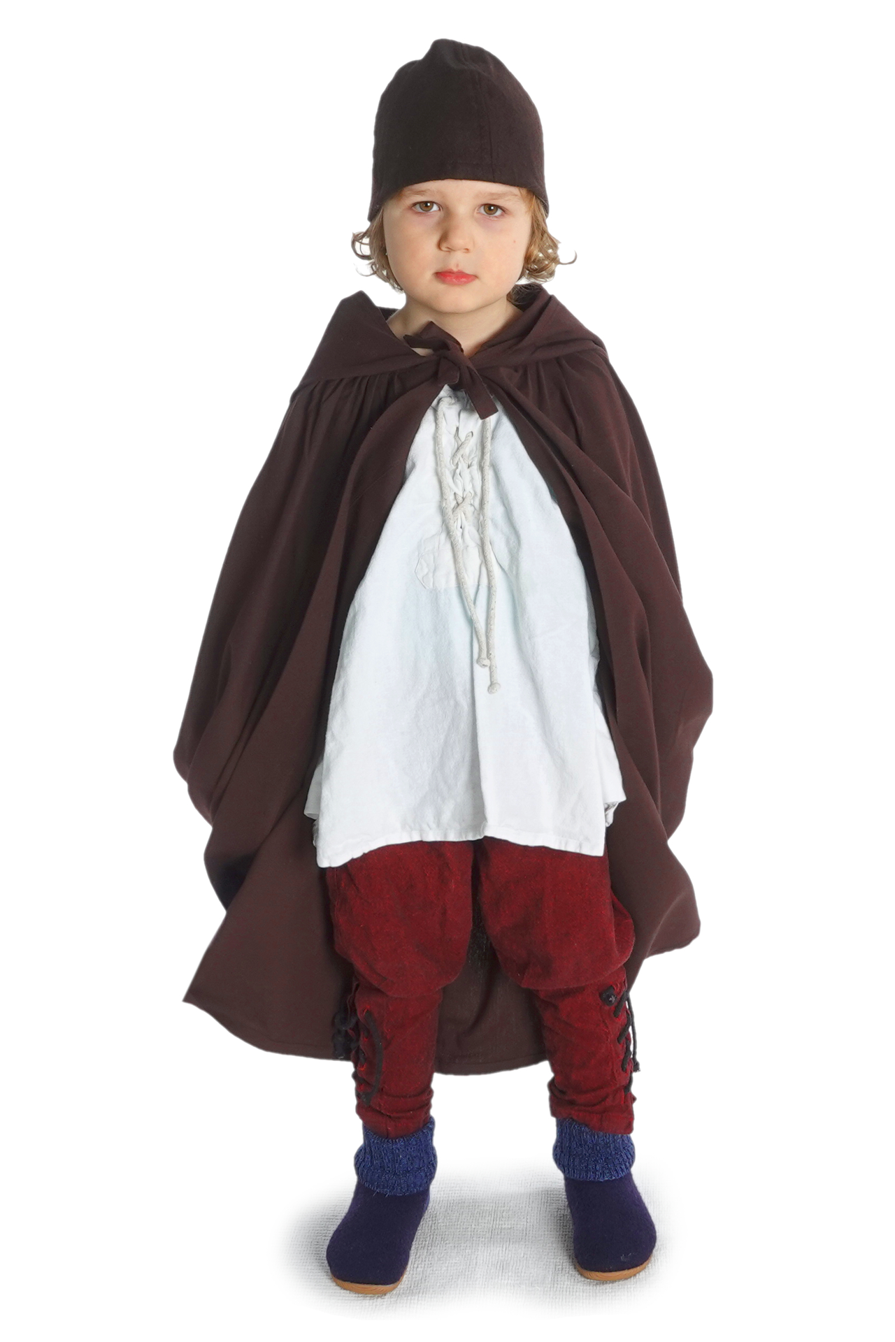 Unser Kinderumhang „Gandiluz“ ist ein historisch authentischer, langer Halbkreismantel mit Kapuze. Wie auch seine geschichtlichen Vorbilder kann er auf der Brust durch eine Schnürung und Knöpfe geschlossen werden.