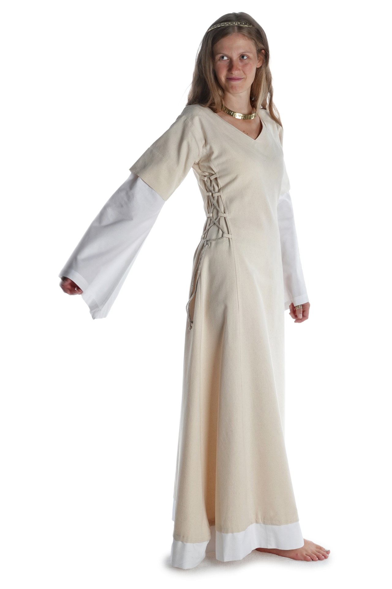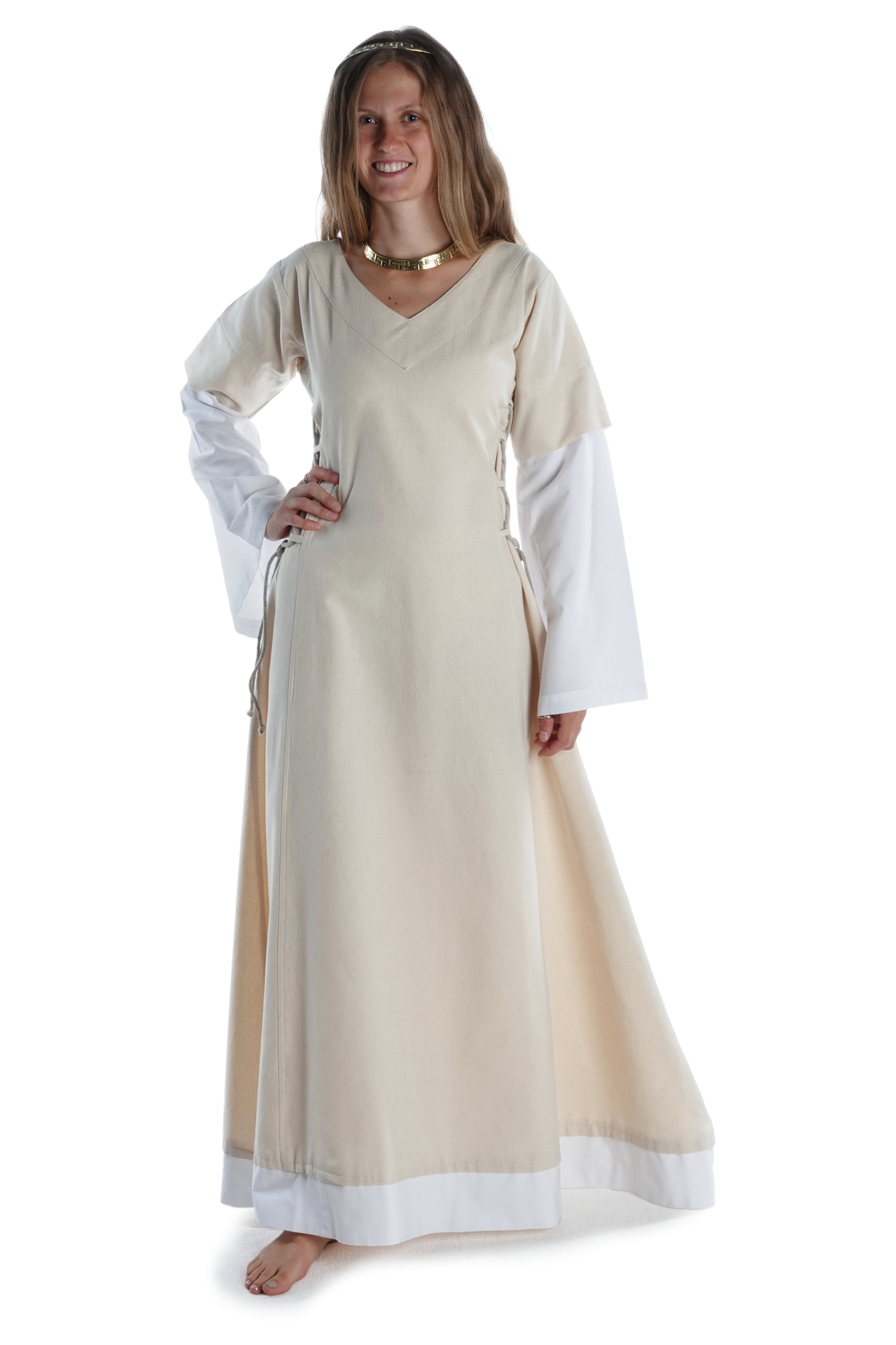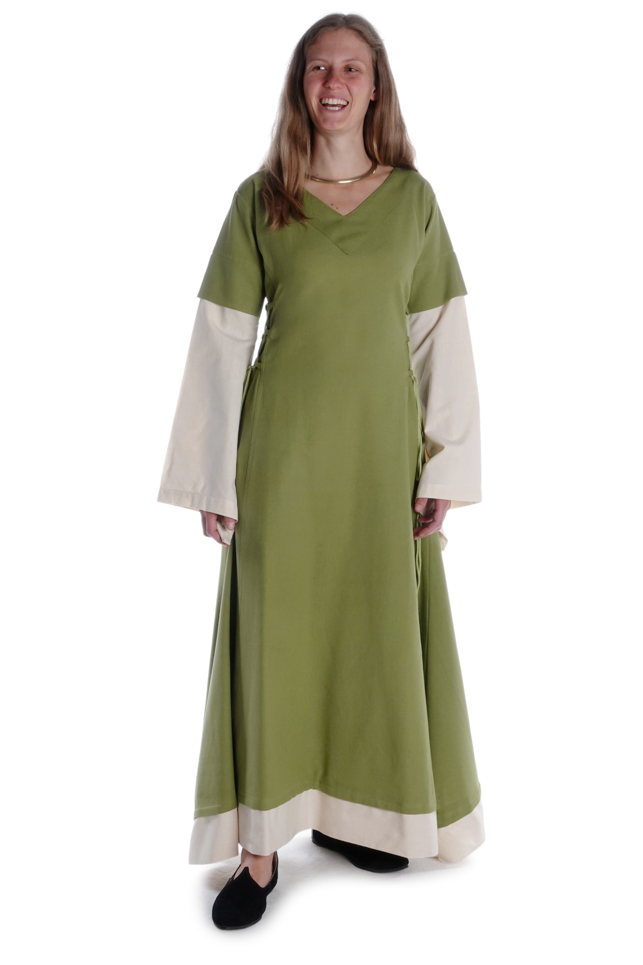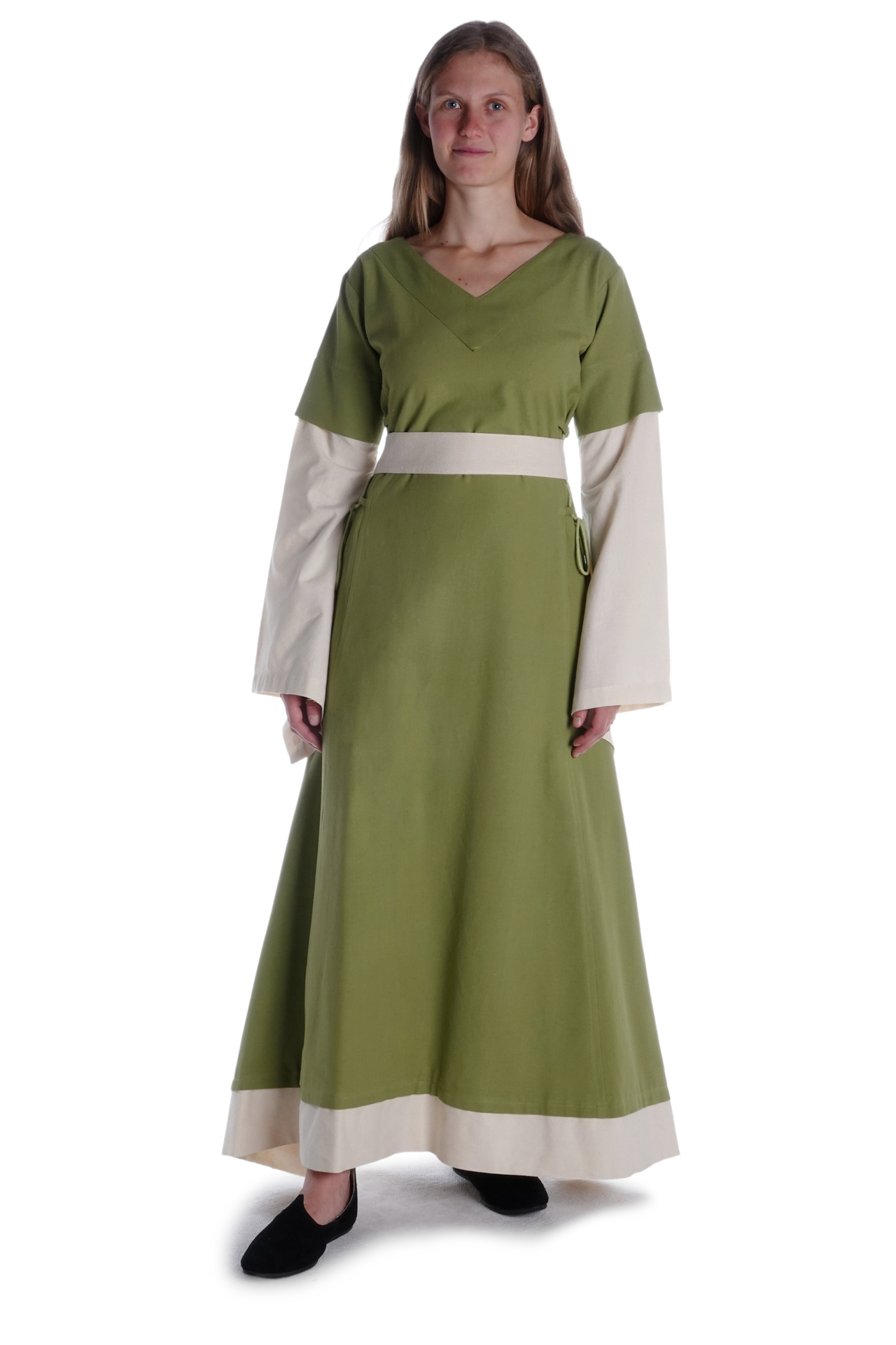 Der historische und bequeme Schnitt von Kleid „Saelde“ ohne störende Taschen, Knöpfe oder Reißverschlüsse machen diese historische Gewandung zum zur perfekten Begleiter für Mittelaltermärkte und andere Veranstaltungen wie LARP-Events, Rollenspiel, Reenactment oder Karnevalsfeierlichkeiten.