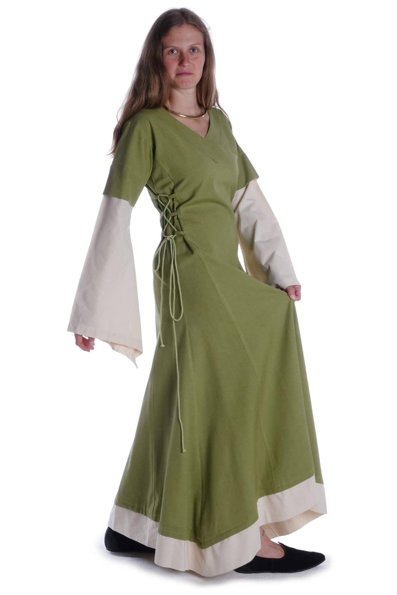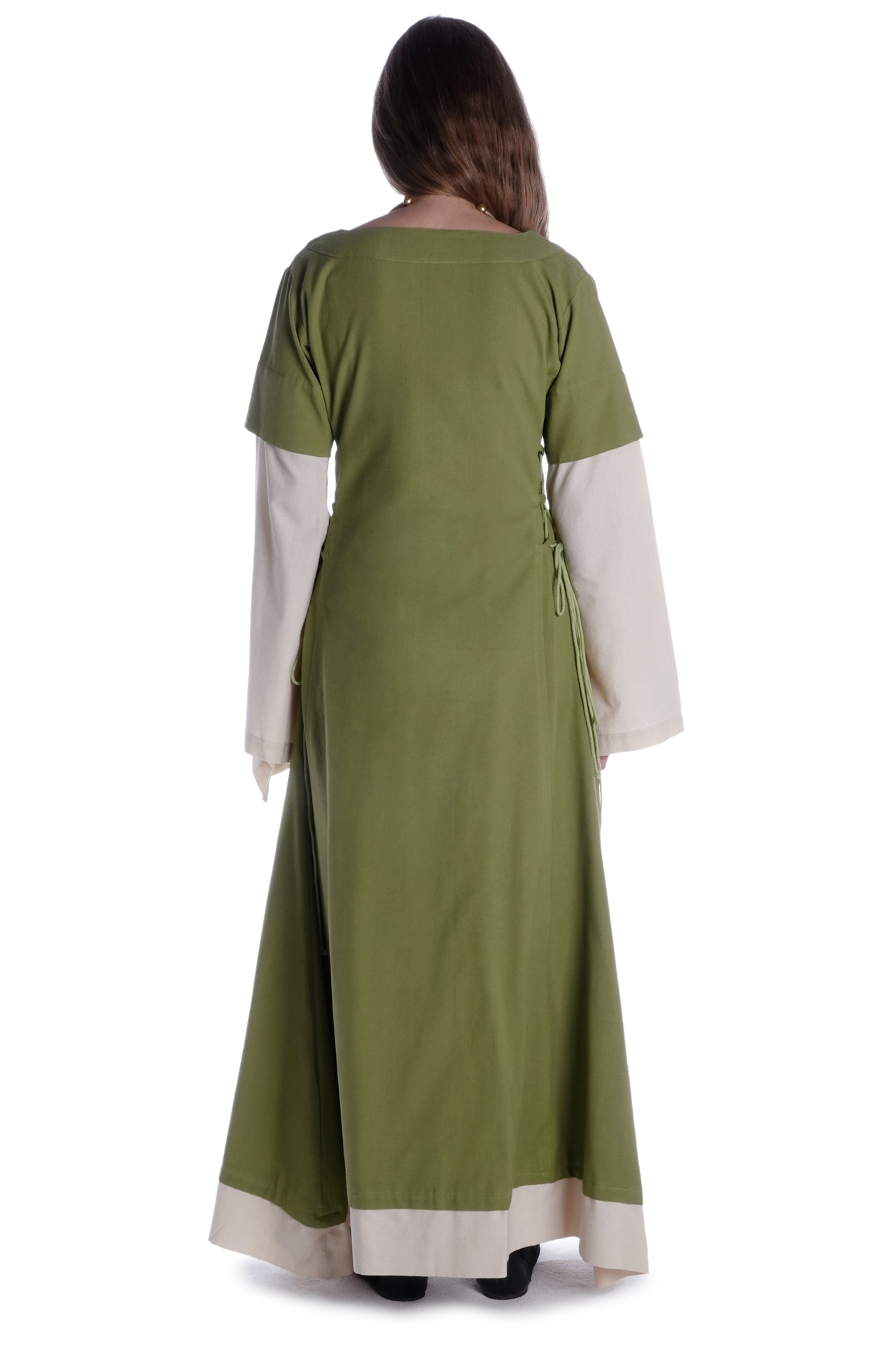Dieses mittelalterliche Kleid „Saelde“ ist aus authentischem Naturstoff gefertigt. Die reine Baumwolle trägt sich äußerst angenehm, zudem ist die Verwendung von natürlichem Material kennzeichnend für die Ära des Mittelalters. Außerdem ist die robuste Baumwolle, die mit Leinenstruktur gewebt wurde, Garant für die Langlebigkeit und Nachhaltigkeit der Kleidungsstücke.