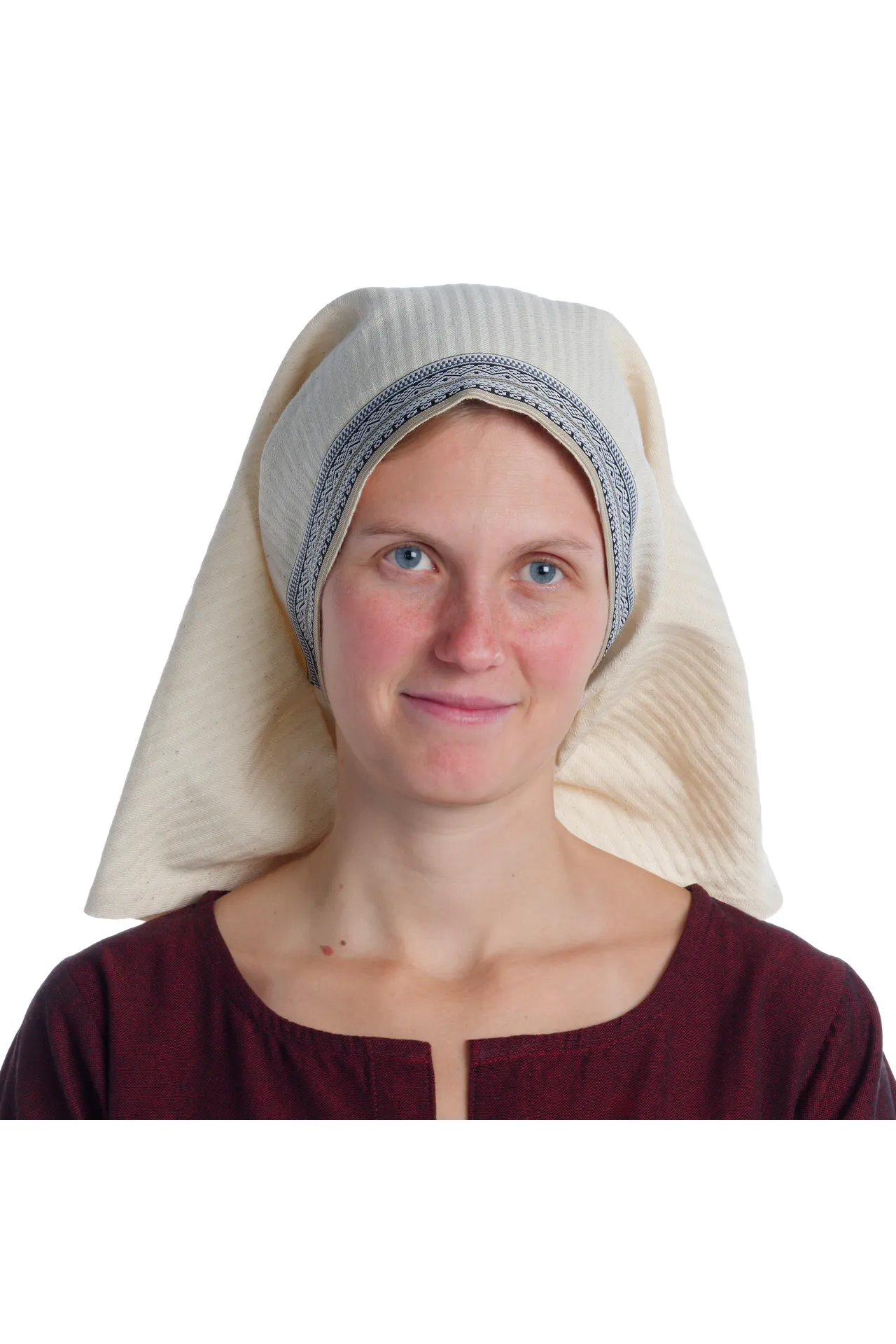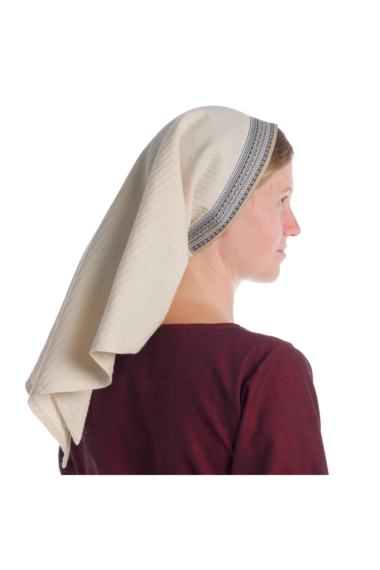 Diese mittelalterliche Kopftuch mit Bodüre "Florimel" besteht aus naturbelassener Baumwolle. Dieses Textil besticht nicht nur mit einem ihrer leichten und feinen Stoffqualität geschuldeten hohen Tragekomfort, sondern auch durch ihre Originalgetreue. Denn die ausschließliche Verwendung von natürlichen Stoffmaterial war typisch für die Epoche des Mittelalters.