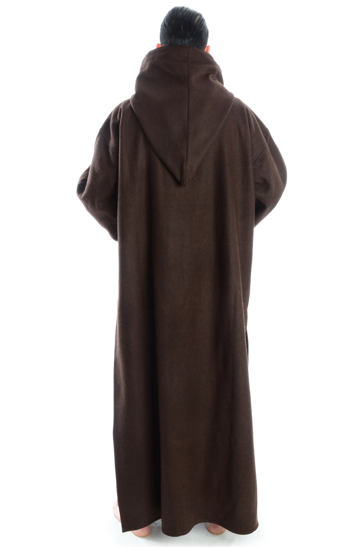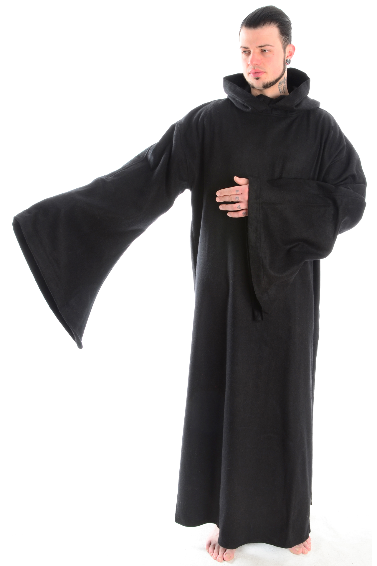 Das historische Mönchsgewand verfügt über Kapuze und lange Ärmel, die großzügig in einem Trompetenärmel enden. Die weite Schnittform garantiert einen hohen Tragekomfort für jeden Figurentyp. Am Rocksaum verfügt der Ordenshabit über zwei seitliche Beinöffnungen, die Spielraum für Bewegung erlauben. Des Weiteren wird das Modell „Heimrich“ mit einer praktischen Schnur geliefert, die um die Taille gebunden werden kann. Diese Kutte eignet sich vor allem für die kältere Jahreszeit, da der dicke Schafwollfilz einen hervorragenden Schutz gegen Kälte bietet.
