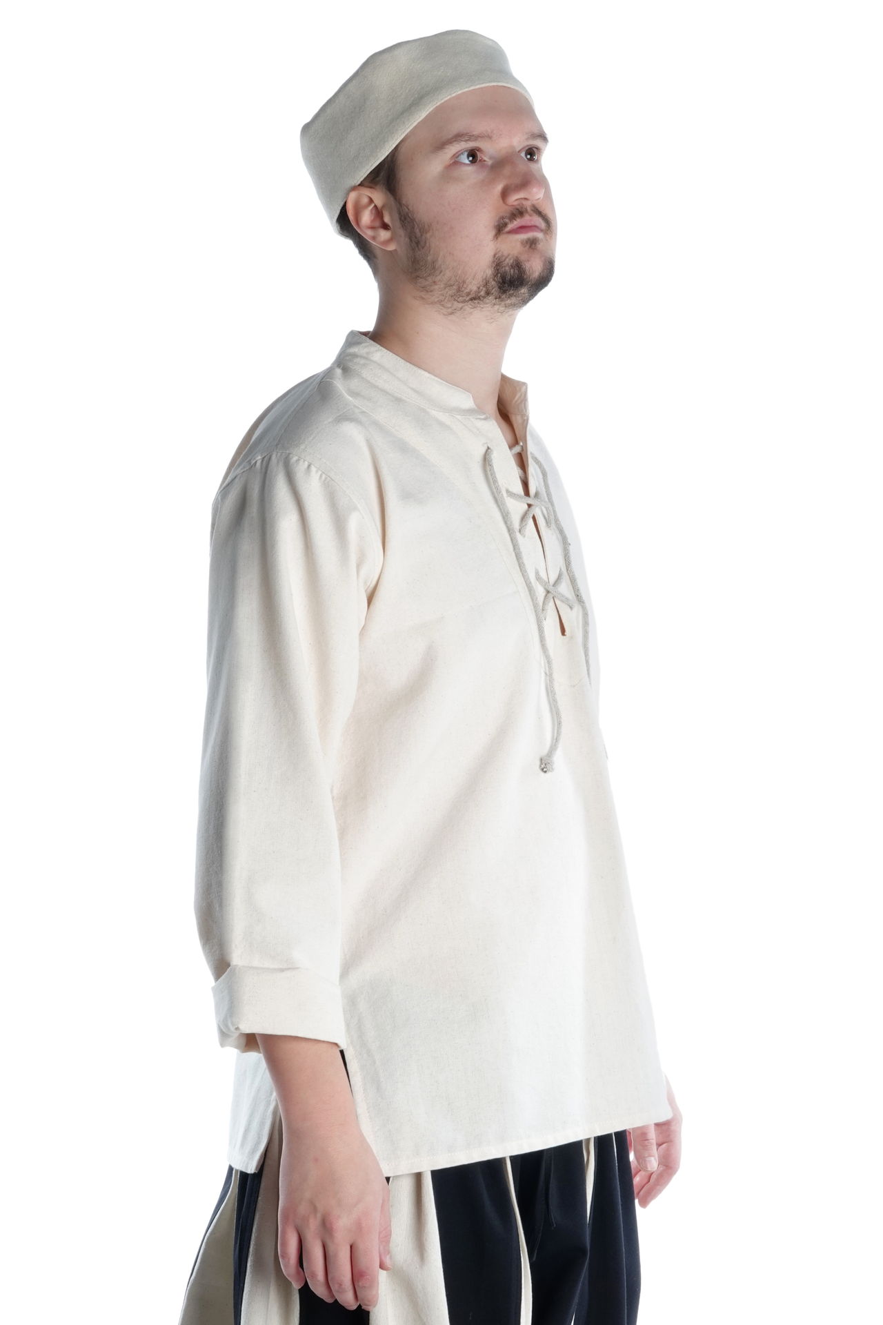 Dieses mittelalterliche Hemd wurde aus handgewebten Baumwollstoff hergestellt. Die Verwendung natürlicher Textilien mutet nicht nur authentisch an, sondern besticht zudem durch die aus ihr resultierende hohe Stoffqualität. Denn der reine Baumwollstoff, der mit Leinenstruktur gewebt wurde, ist ein robustes Material. Dieses wiederum verspricht ein nachhaltiges und langlebiges Kleidungsstück.