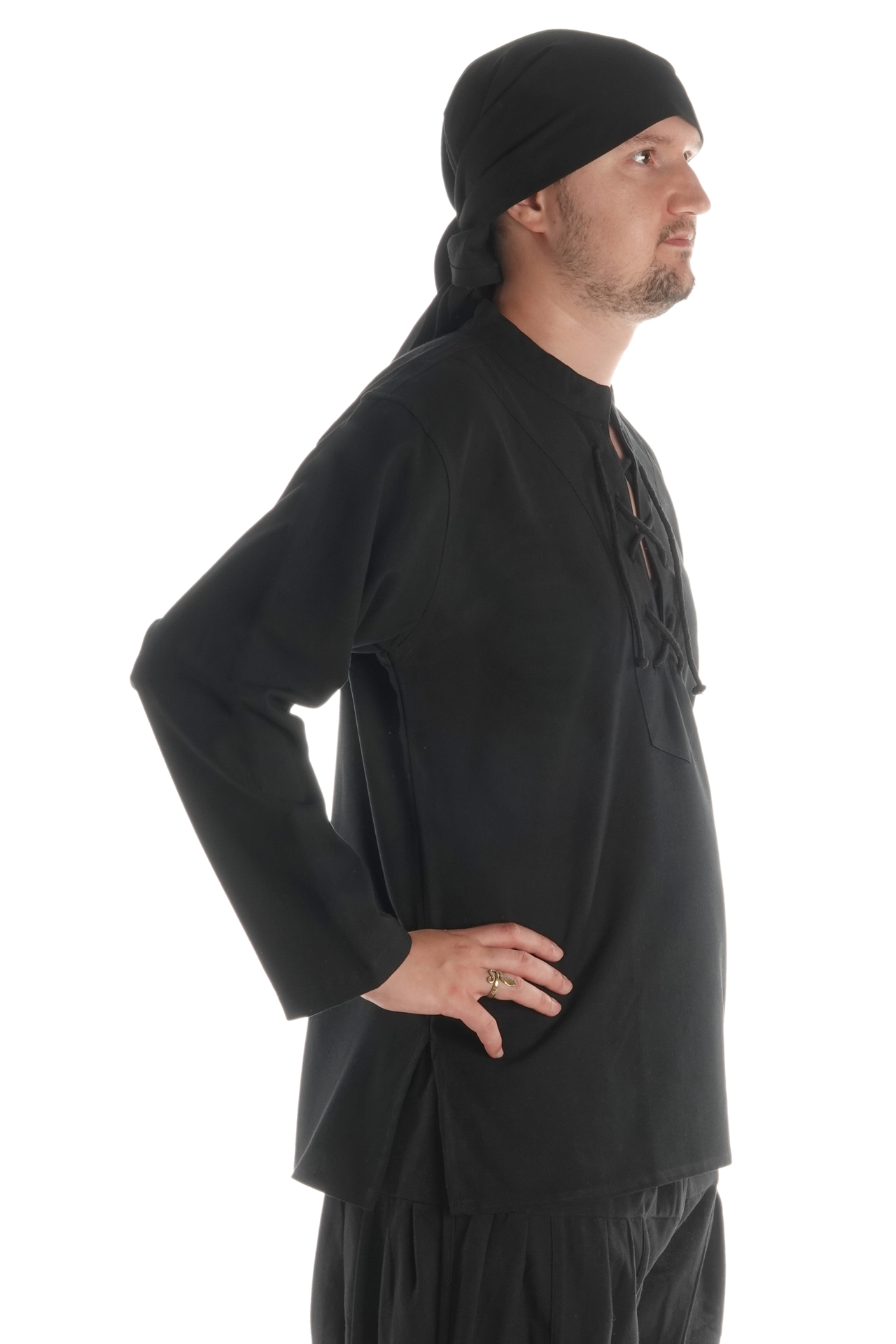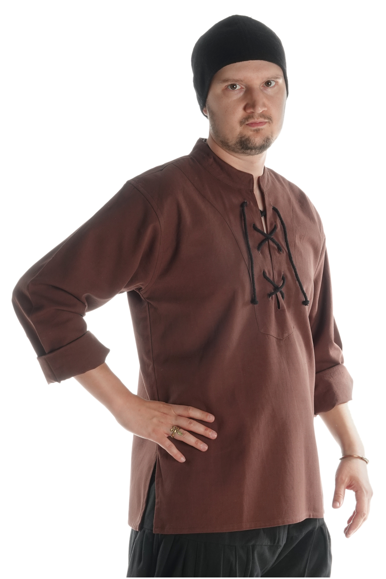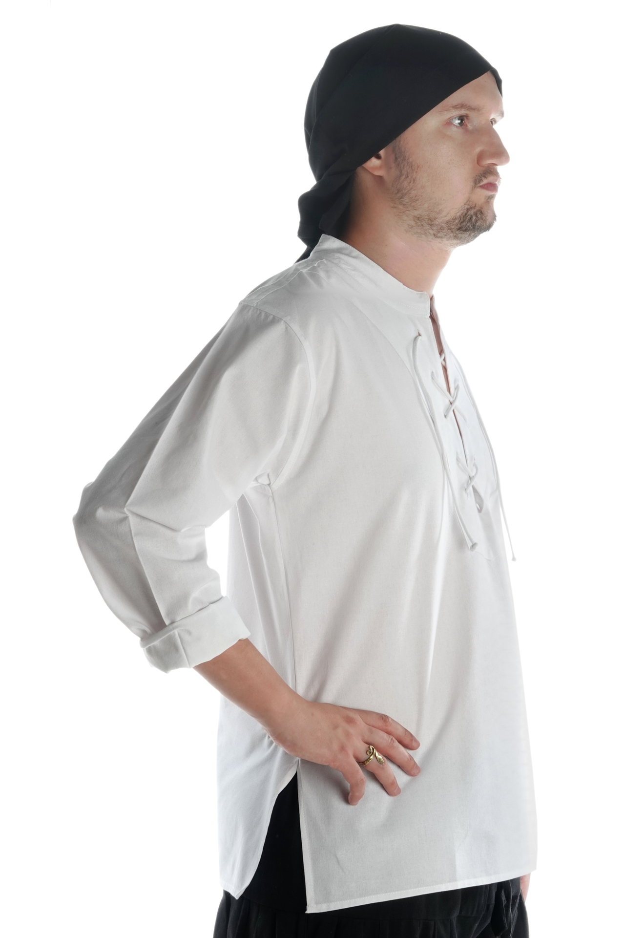 Unser Modell „Edward“ ist ein Klassiker unseres Hemdensortiments. Das historisch wirkende Hemd verfügt über eine Brustschnürung (ohne störende Details wie Metallösen). Des Weiteren hat das Stehkragenhemd eine schöne Verblendung an der Front. Die Ärmel selbst sind gerade konzipiert, ohne Manschette. Das Hemd kann entweder über oder in der Hose tragen. Ein einfaches Stehkragenhemd mit Schnürung passt zui vielen Anlässen.