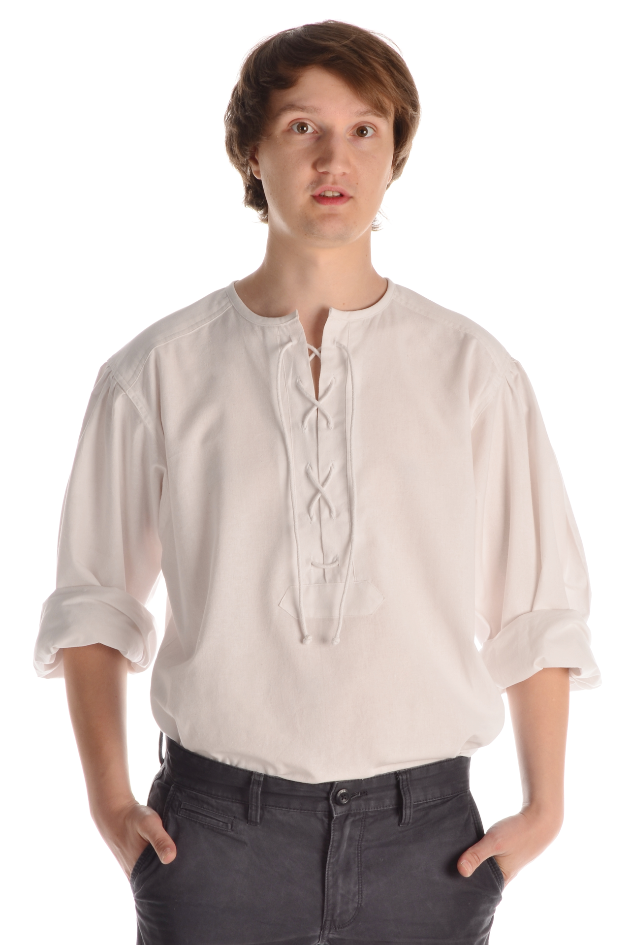 Unser Modell „Parzival“ ist der langjährige Klassiker unseres Hemdensortiments. Das historisch wirkende Hemd verfügt über eine Brustschnürung (ohne störende Details wie Metallösen) mit darunter befindlichem Riegel. Des Weiteren hat das kragenlose Hemd dekorative Fältchen am Schulteransatz des Ärmelausschnitts. Die Ärmel selbst sind großzügig und voluminös als Puffärmel konzipiert, welche in einer engen Manschette mit je einem Kokos-Knopf enden. Ferner ist der Saum des Hemdes an Vorder- wie Rückseite abgerundet. So kann man das Hemd entweder über oder in der Hose tragen. Falls Sie das Hemd in der Hose tragen, lässt sich das Hemd durch den weiten Schnitt hervorragend an der Taille raffen, wodurch das Hemd dekorativ aus der Hose pludert. Auf der Rückseite befindet sich ein klassischer Rückensattel. Entlang des Rückensattels finden sich wiederholt Bliesen, die eine körpernahe Passform an der oberen Rückenpartie garantieren. Schließlich wurde seitlich jeweils ein dreieckiges Stoffelement in den Saum integriert, um maximale Bewegungsfreiheit zu gewährleisten.