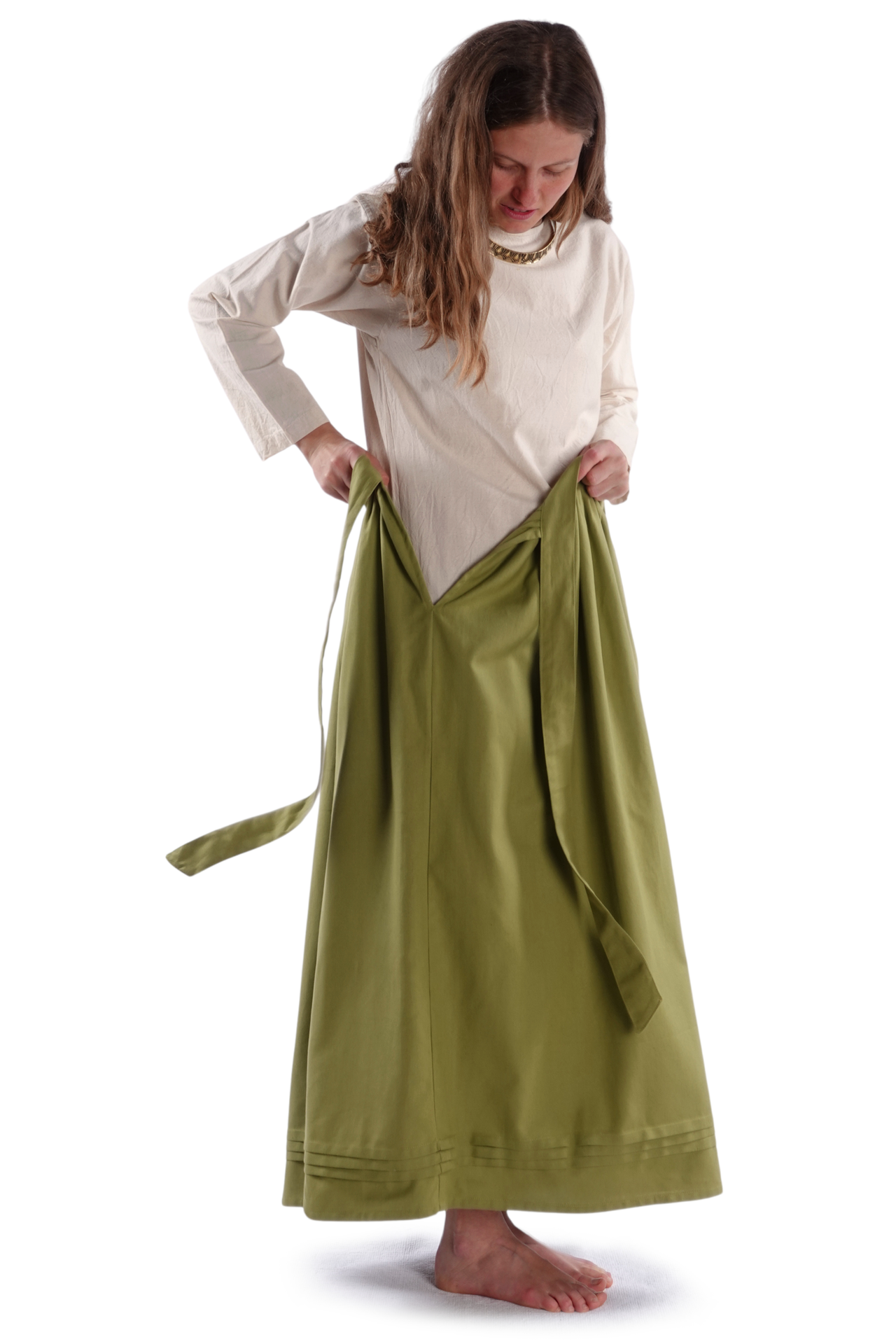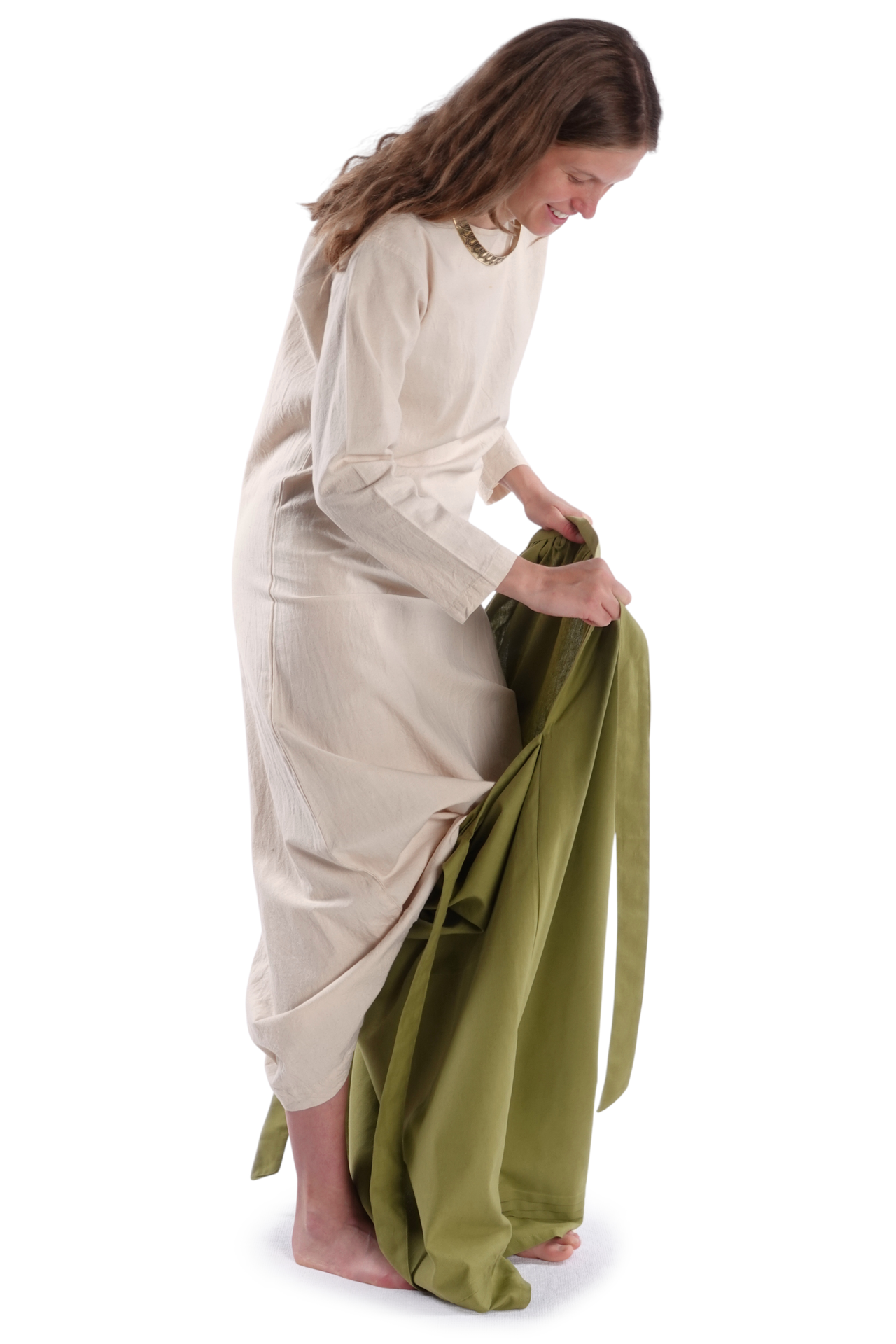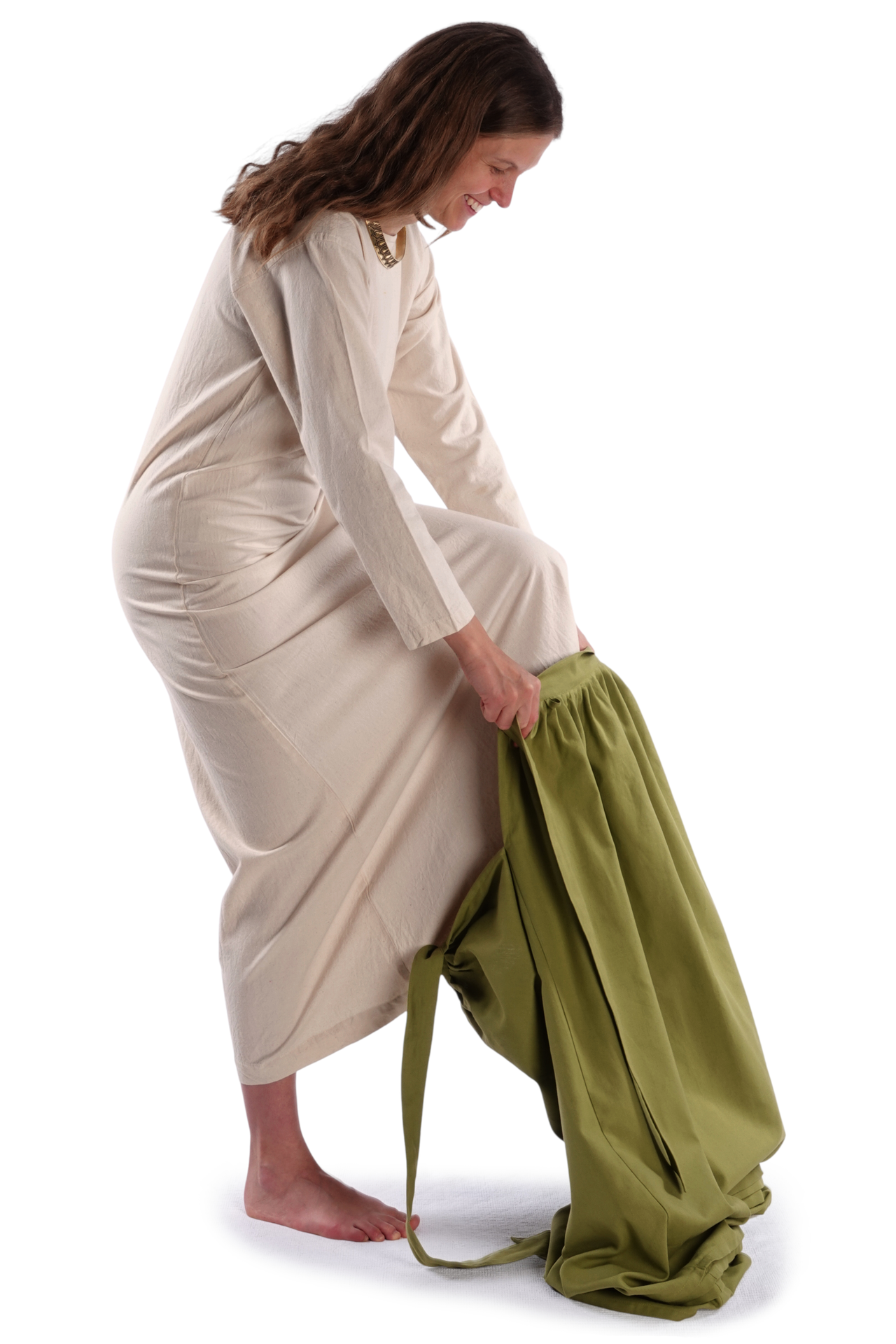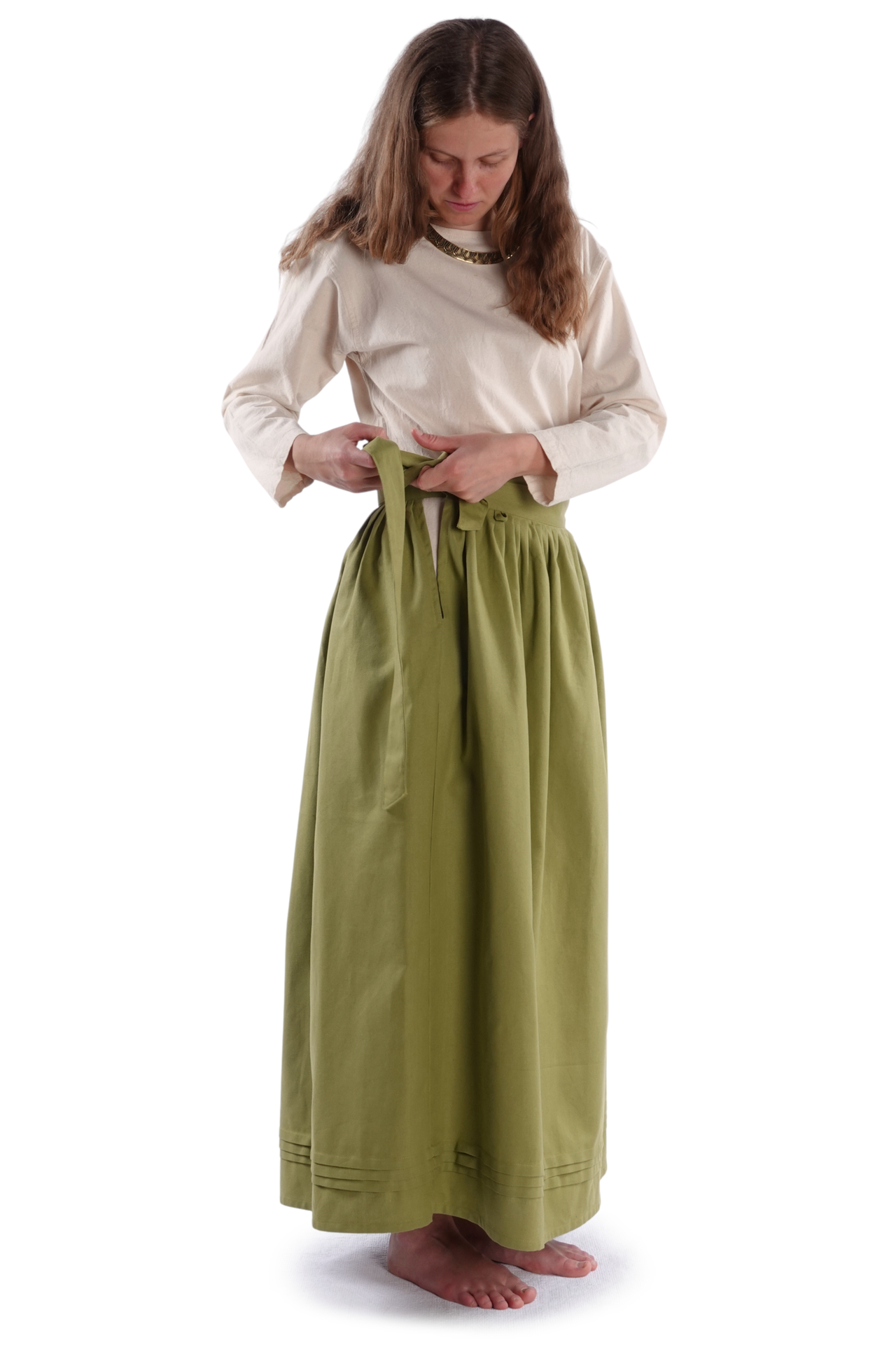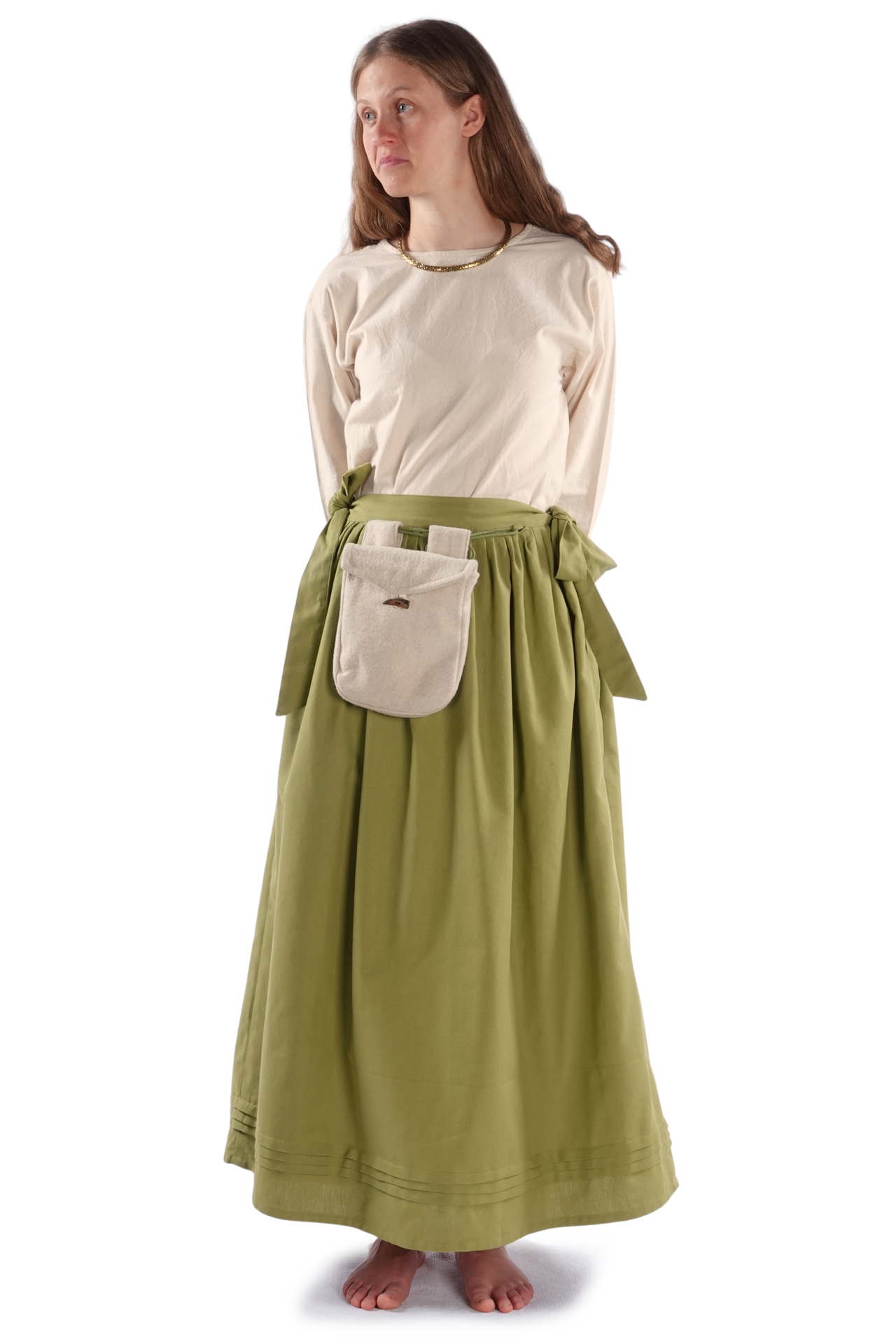 Unser Schürzen-Rock „Widga“ wurde von der traditionellen mittelalterlichen Kleidung inspiriert. Er verfügt über beidseitige langen Bändern an der Taille zum seitlichen Zubinden. Desweiteren befinden sich zwei kleine Schlaufen vorne außen und vorne innen, damit die vier beigelegten Schnüre fixiert werden können, um den Rock auch hochgerafft tragen zu können. So haben Sie genügend Beinfreiheit bei der Arbeit.