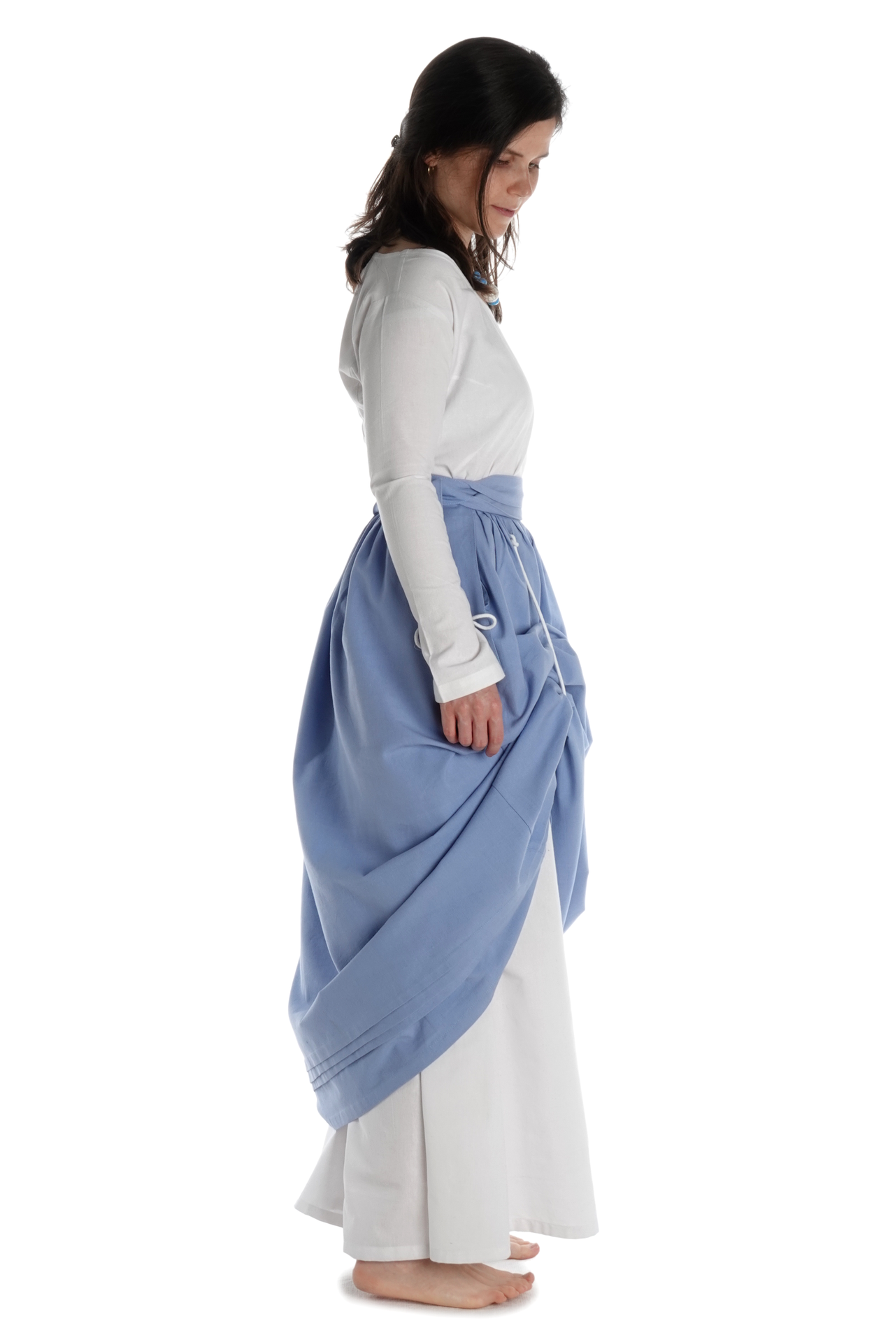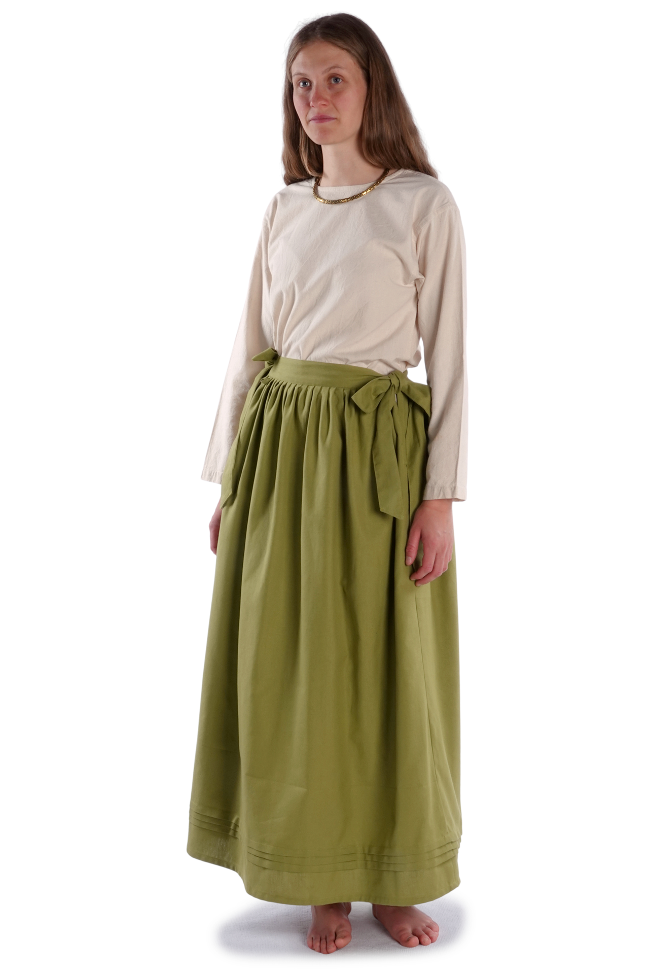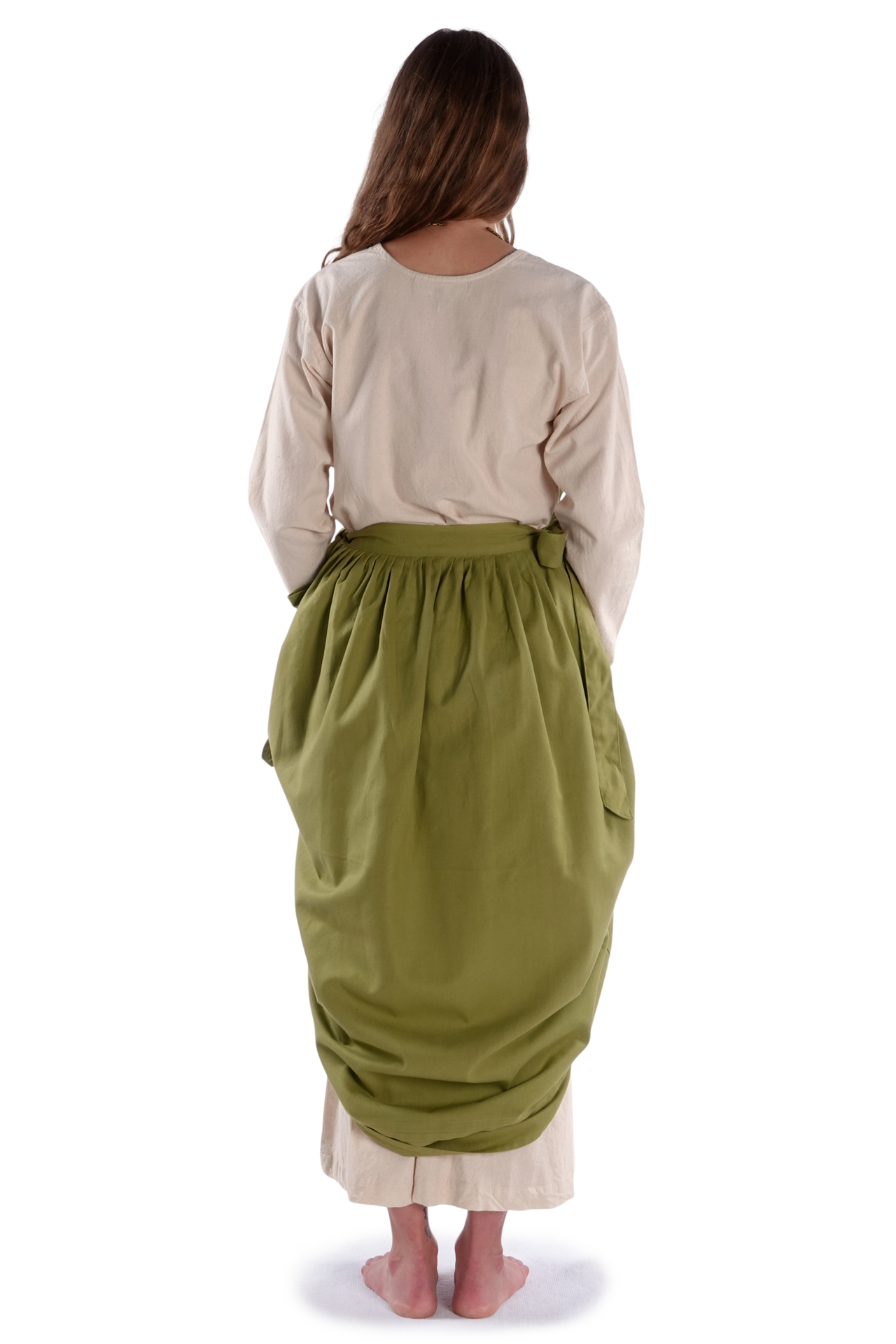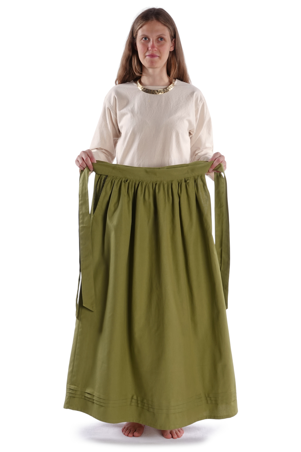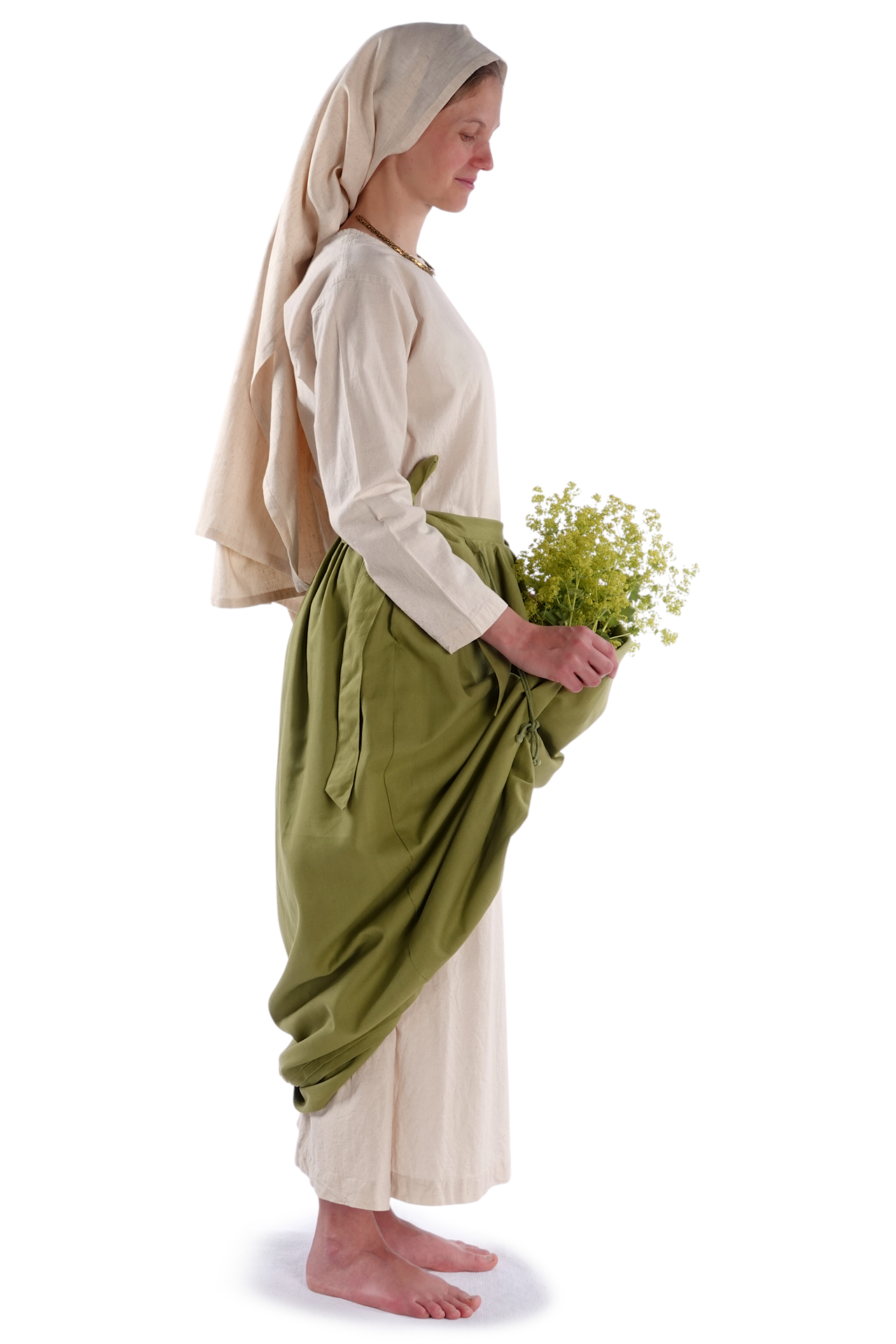 Unser Schürzen-Rock „Widga“ wurde von der traditionellen mittelalterlichen Kleidung inspiriert. Er verfügt über beidseitige langen Bändern an der Taille zum seitlichen Zubinden. Desweiteren befinden sich zwei kleine Schlaufen vorne außen und vorne innen, damit die vier beigelegten Schnüre fixiert werden können, um den Rock auch hochgerafft tragen zu können. So haben Sie genügend Beinfreiheit bei der Arbeit.