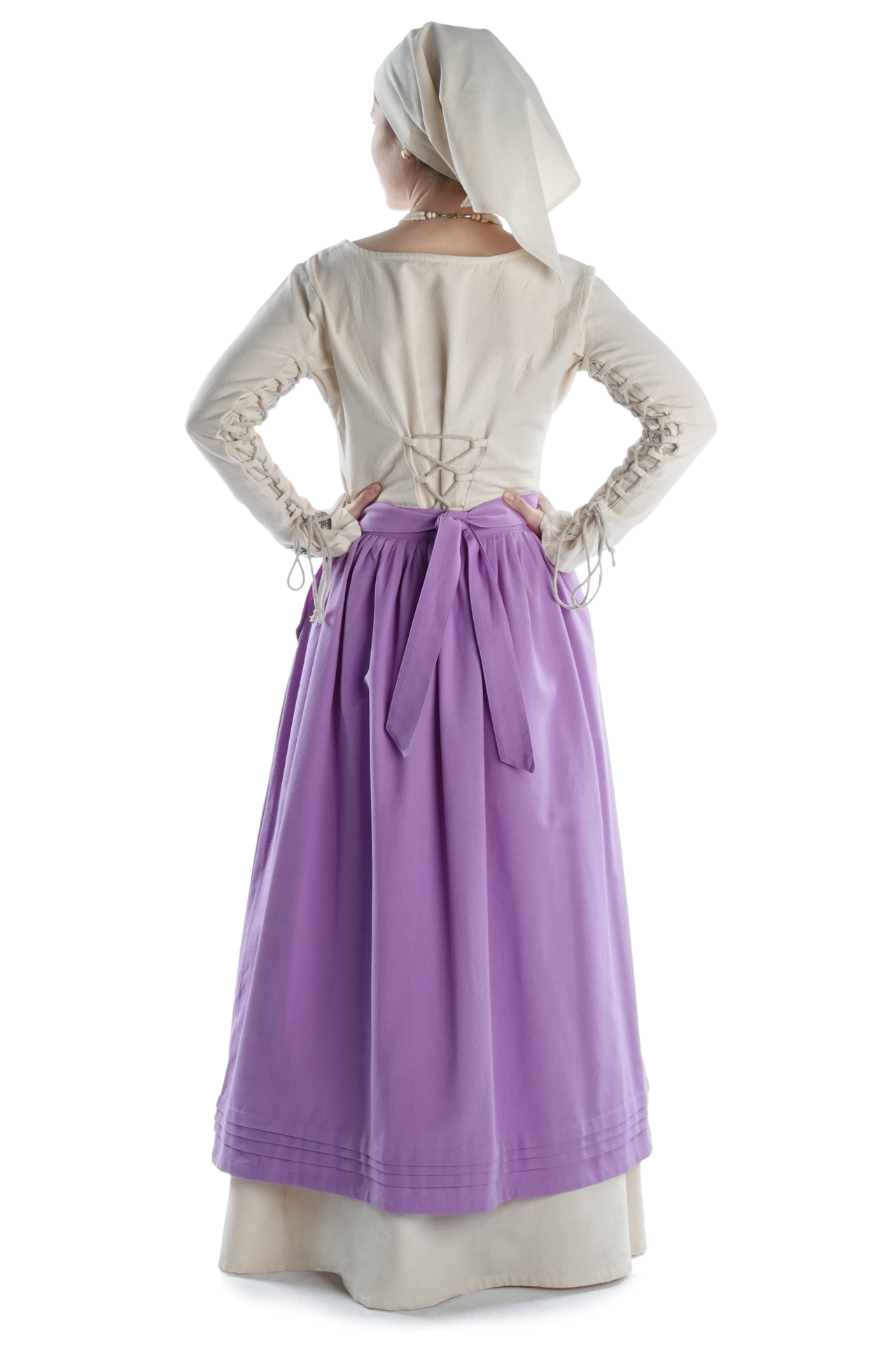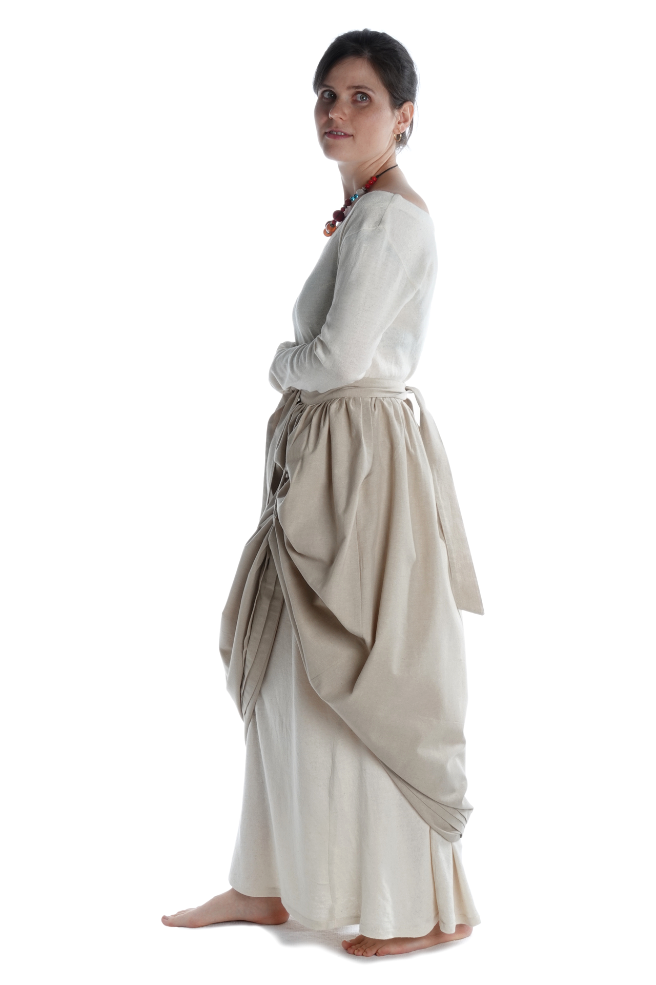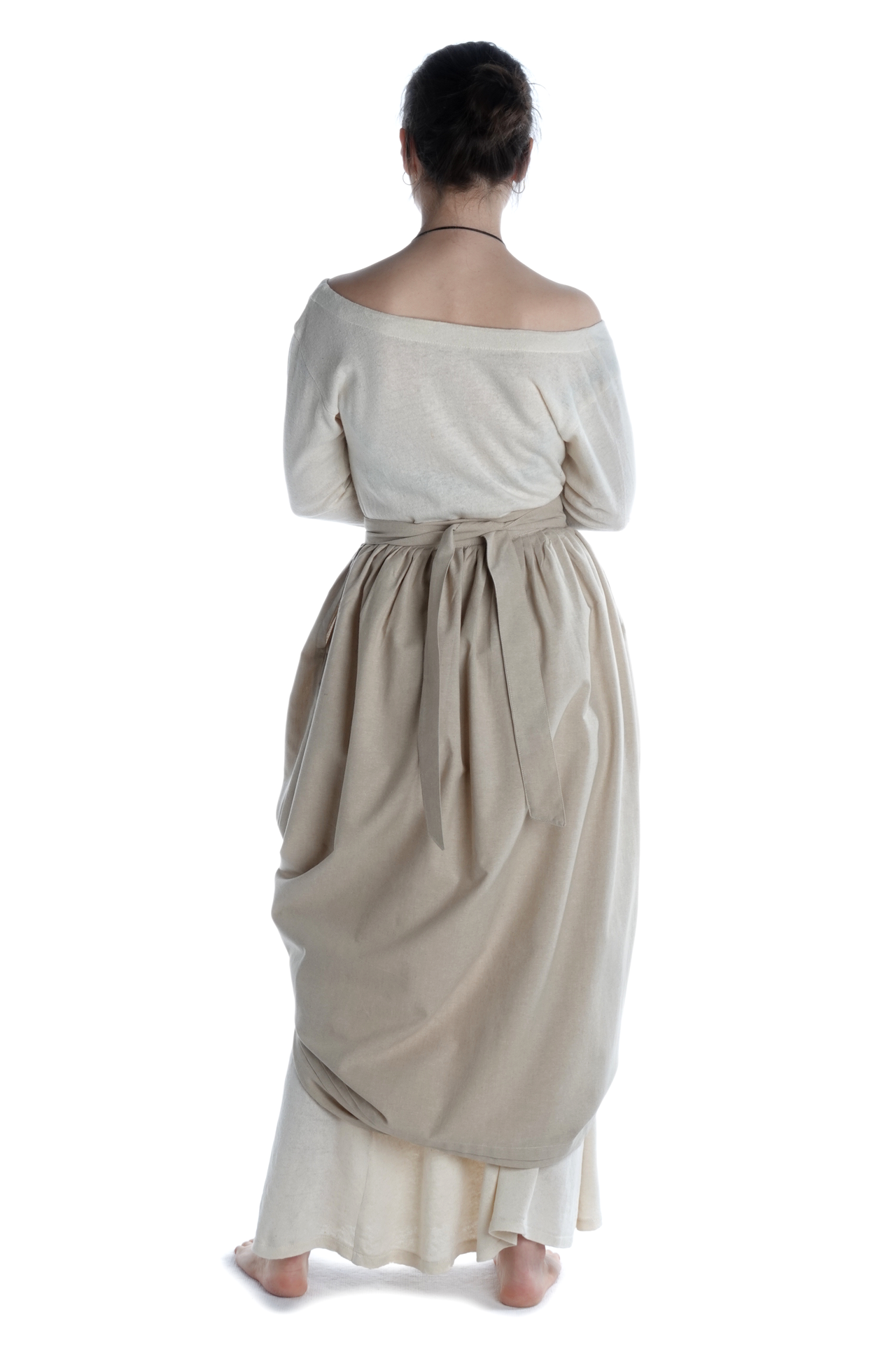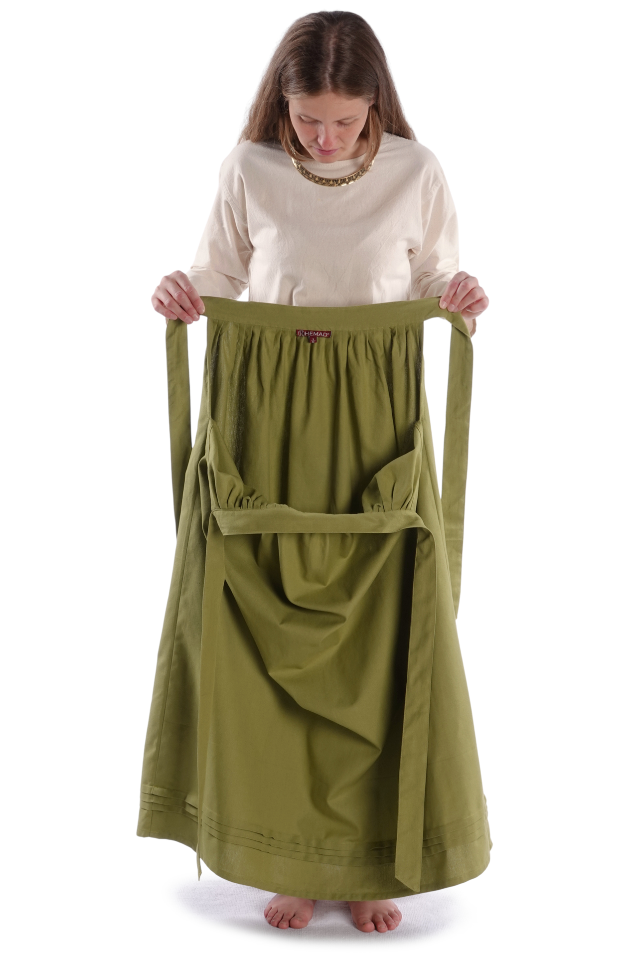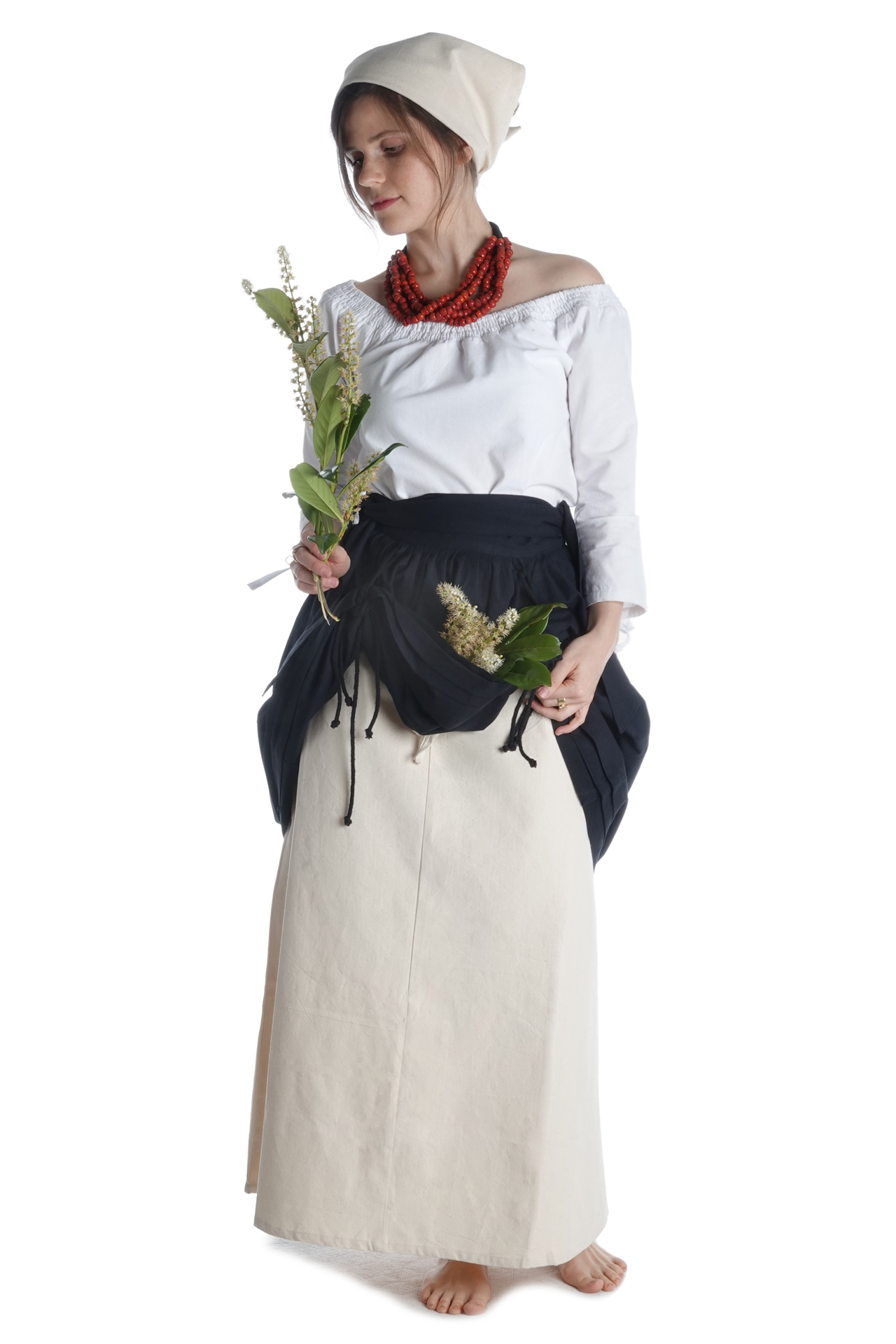 Unser Schürzen-Rock „Widga“ wurde von der traditionellen mittelalterlichen Kleidung inspiriert. Er verfügt über beidseitige langen Bändern an der Taille zum seitlichen Zubinden. Desweiteren befinden sich zwei kleine Schlaufen vorne außen und vorne innen, damit die vier beigelegten Schnüre fixiert werden können, um den Rock auch hochgerafft tragen zu können. So haben Sie genügend Beinfreiheit bei der Arbeit.