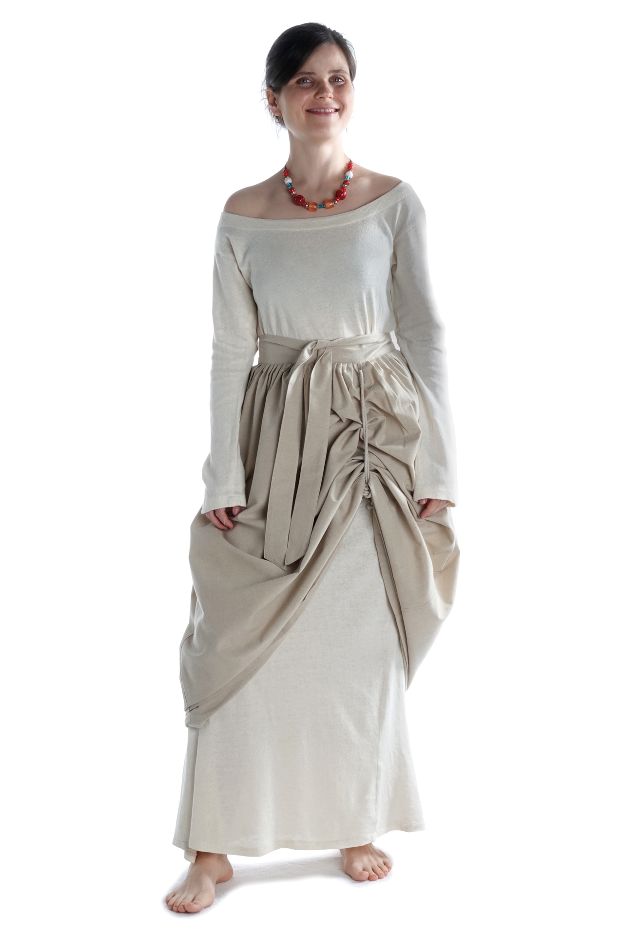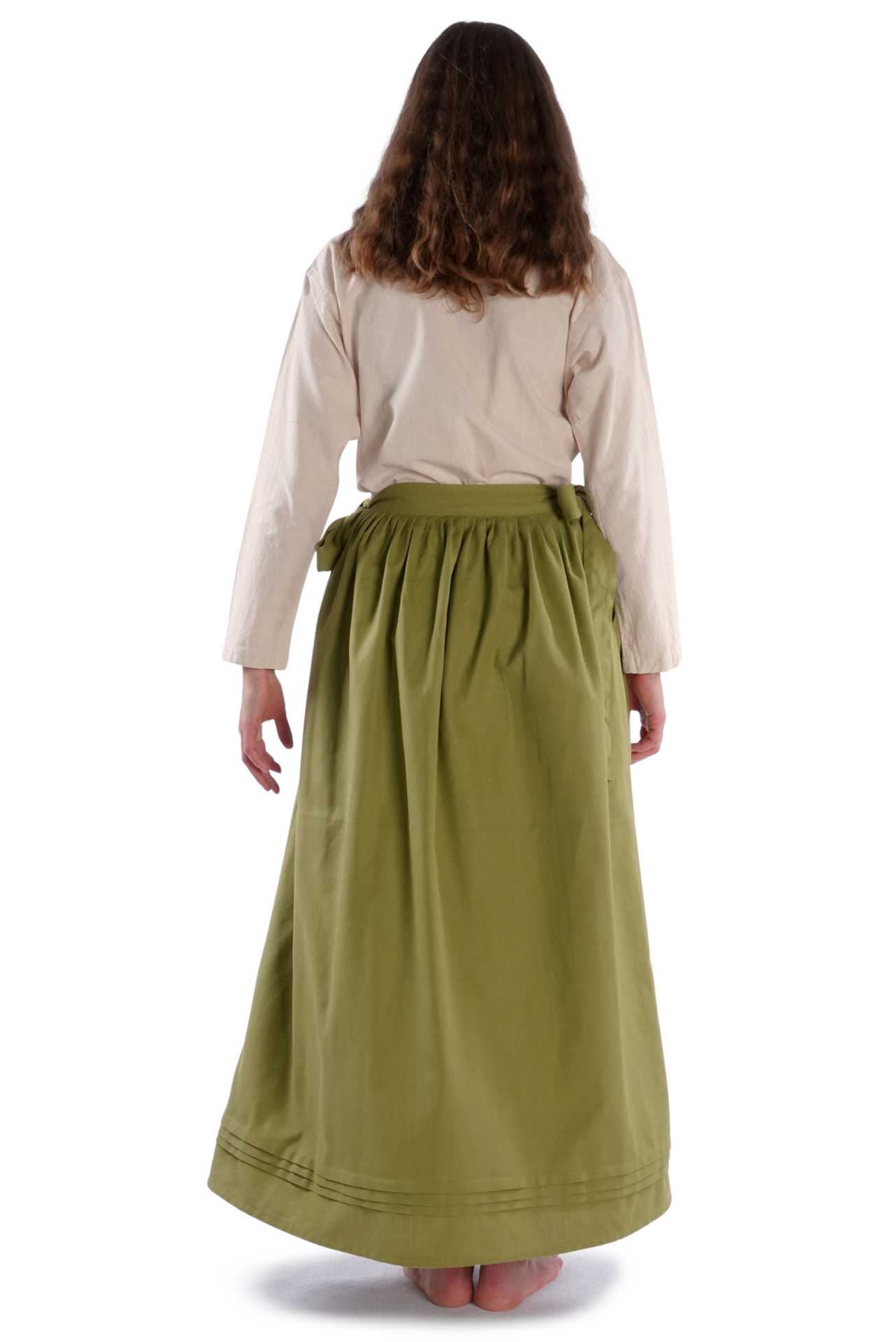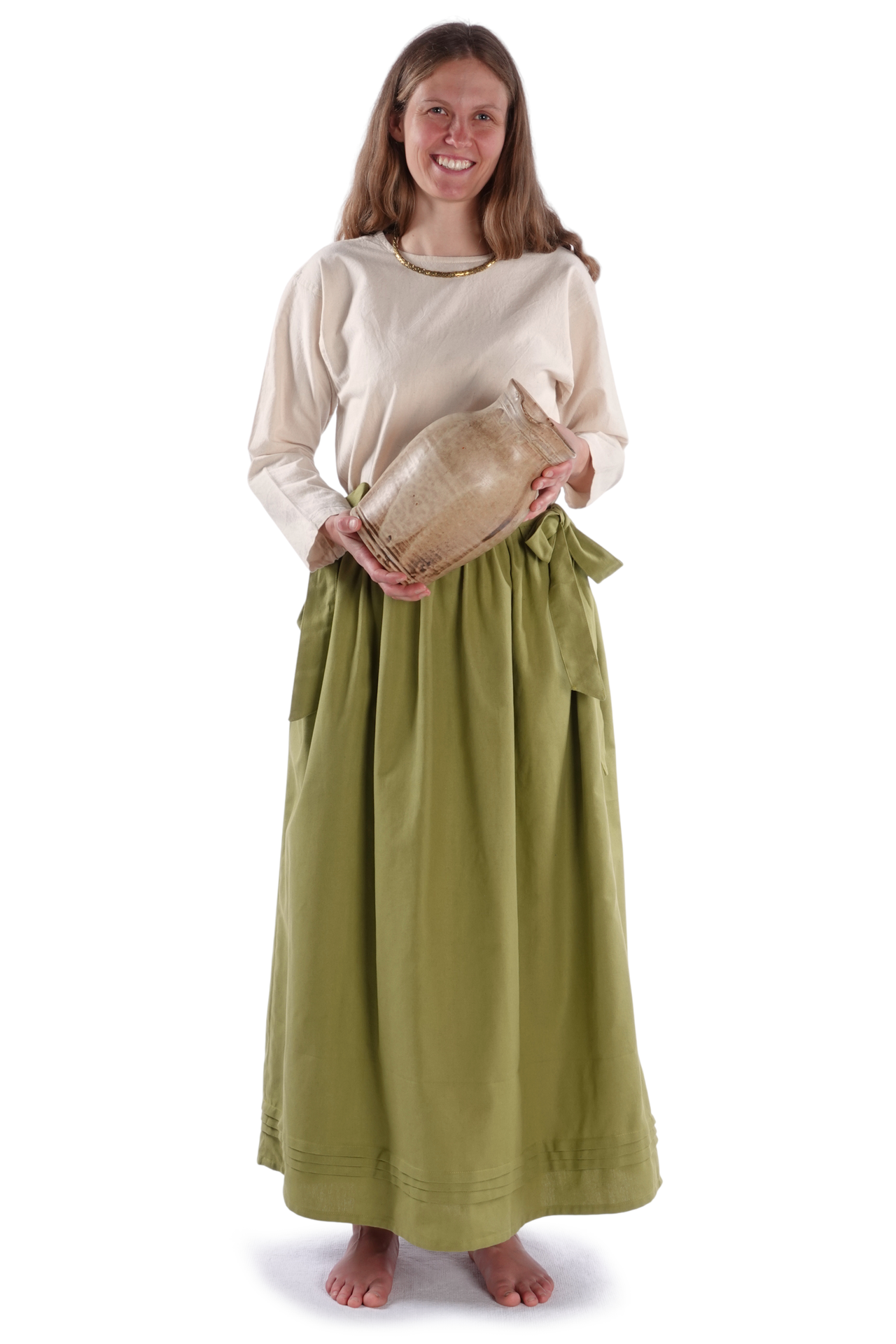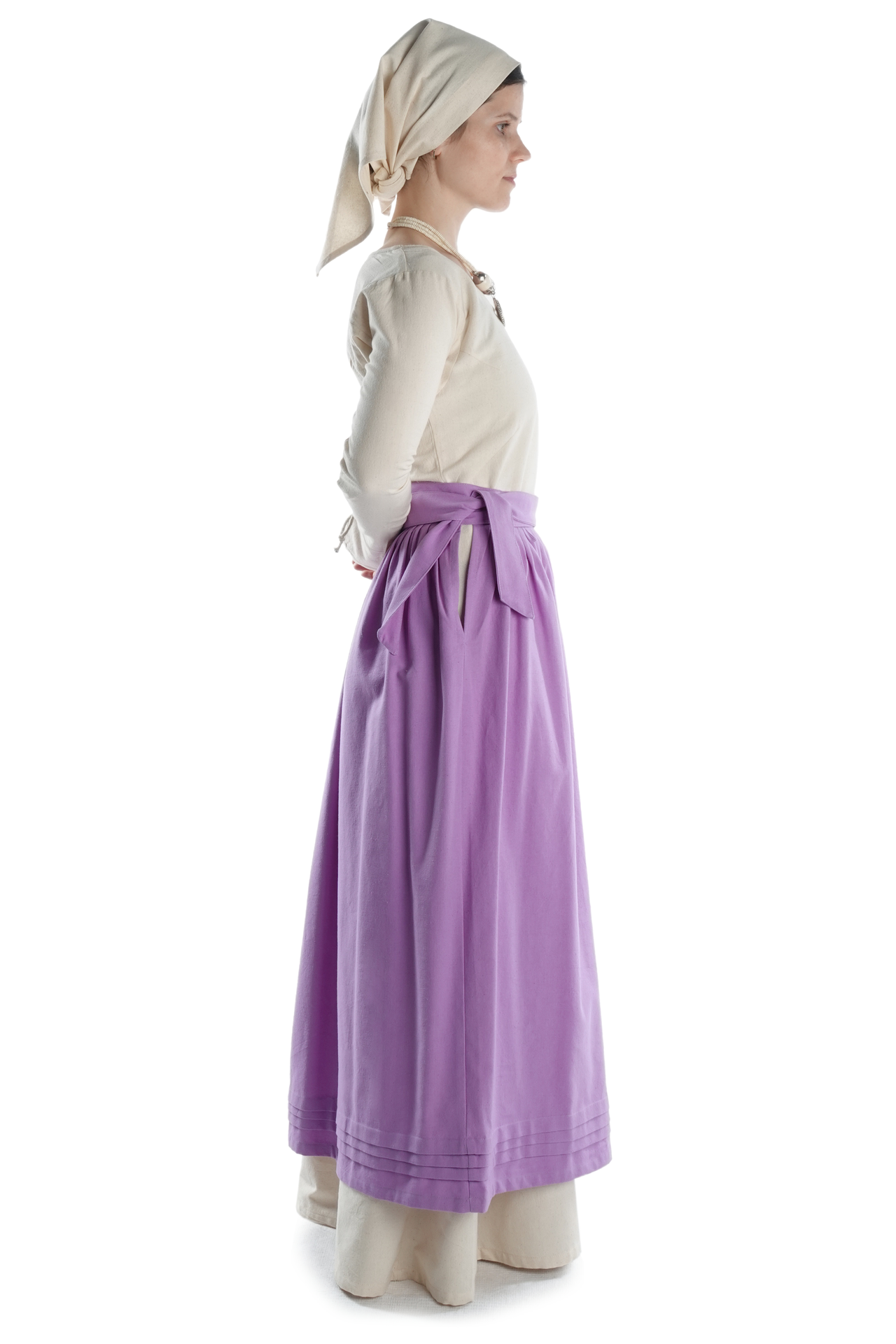 Unser Schürzen-Rock „Widga“ wurde von der traditionellen mittelalterlichen Kleidung inspiriert. Er verfügt über beidseitige langen Bändern an der Taille zum seitlichen Zubinden. Desweiteren befinden sich zwei kleine Schlaufen vorne außen und vorne innen, damit die vier beigelegten Schnüre fixiert werden können, um den Rock auch hochgerafft tragen zu können. So haben Sie genügend Beinfreiheit bei der Arbeit.