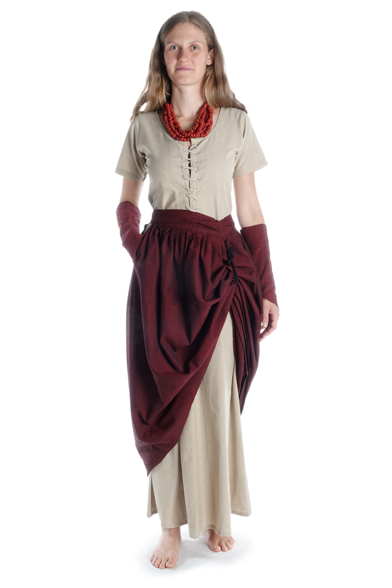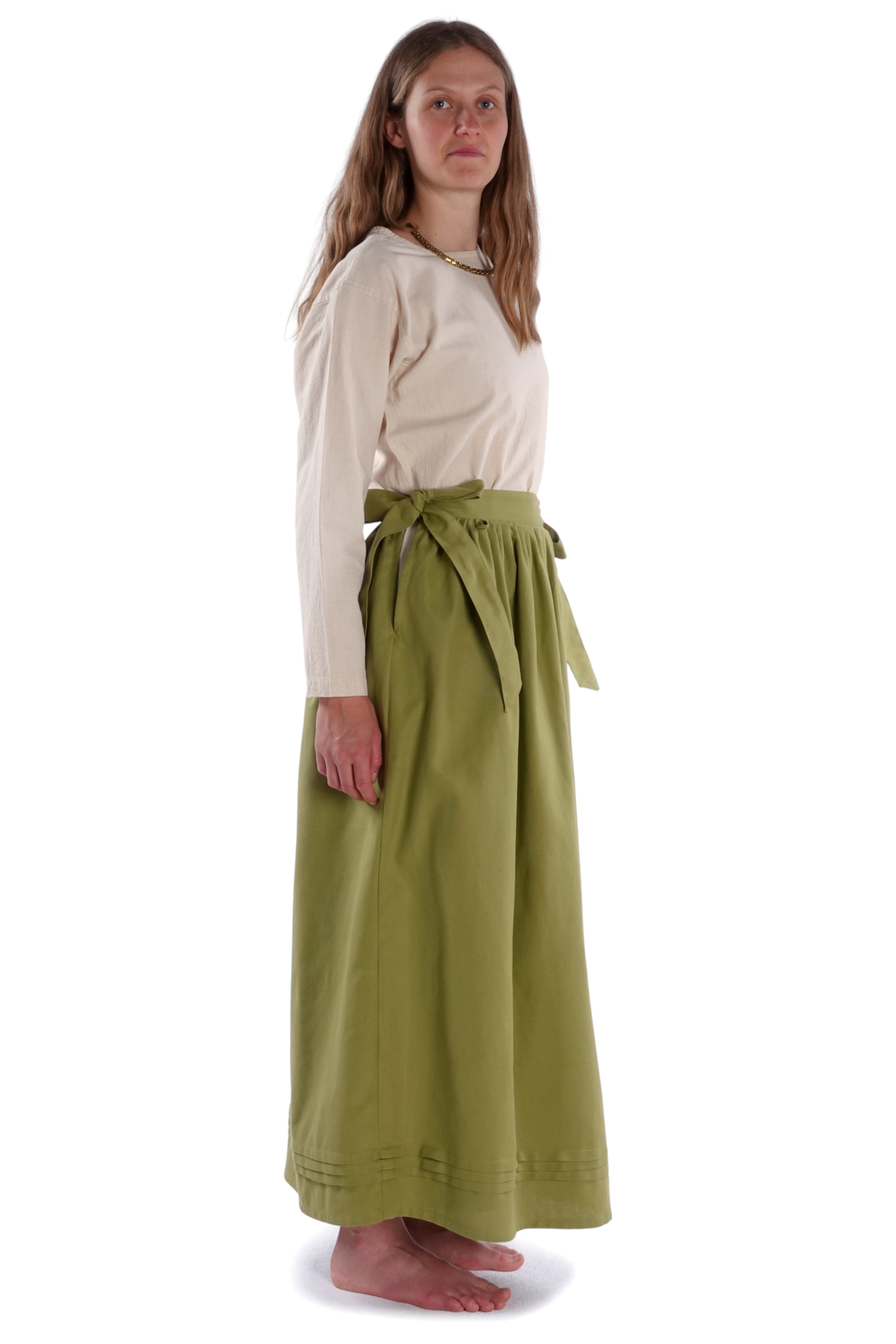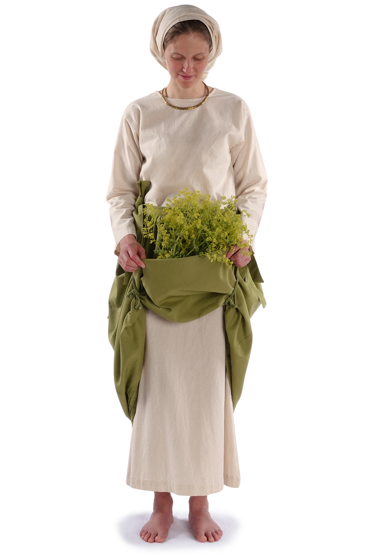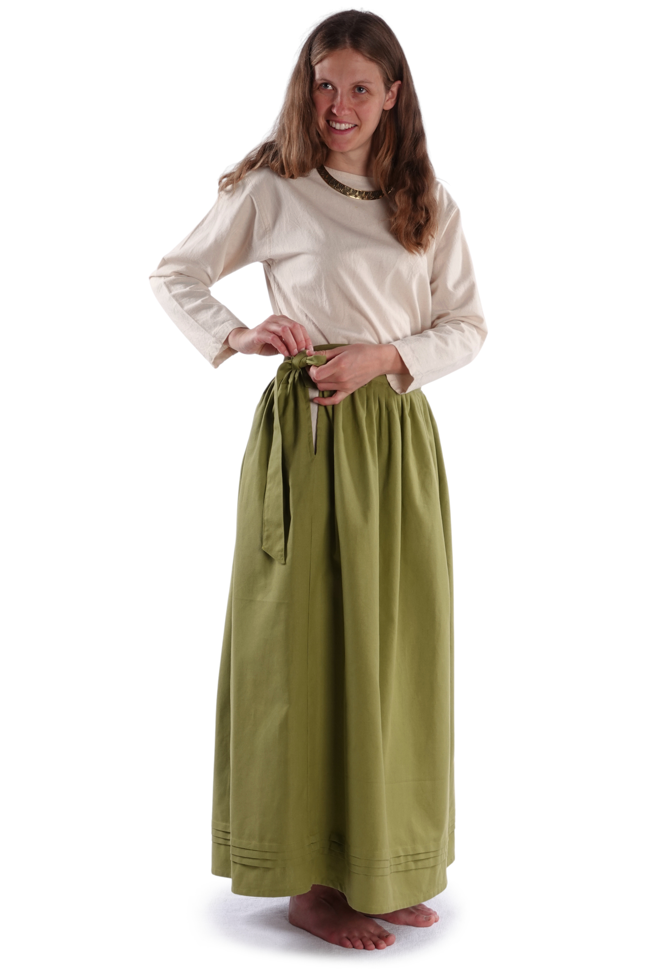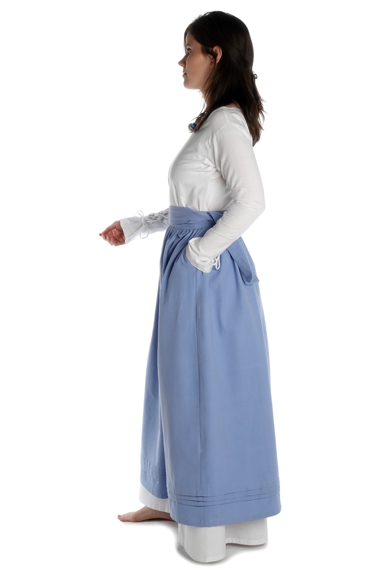 Unser Schürzen-Rock „Widga“ wurde von der traditionellen mittelalterlichen Kleidung inspiriert. Er verfügt über beidseitige langen Bändern an der Taille zum seitlichen Zubinden. Desweiteren befinden sich zwei kleine Schlaufen vorne außen und vorne innen, damit die vier beigelegten Schnüre fixiert werden können, um den Rock auch hochgerafft tragen zu können. So haben Sie genügend Beinfreiheit bei der Arbeit.