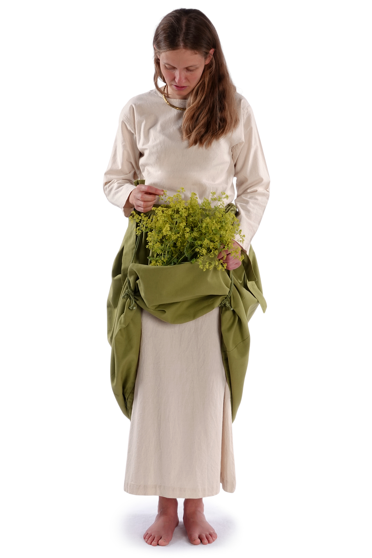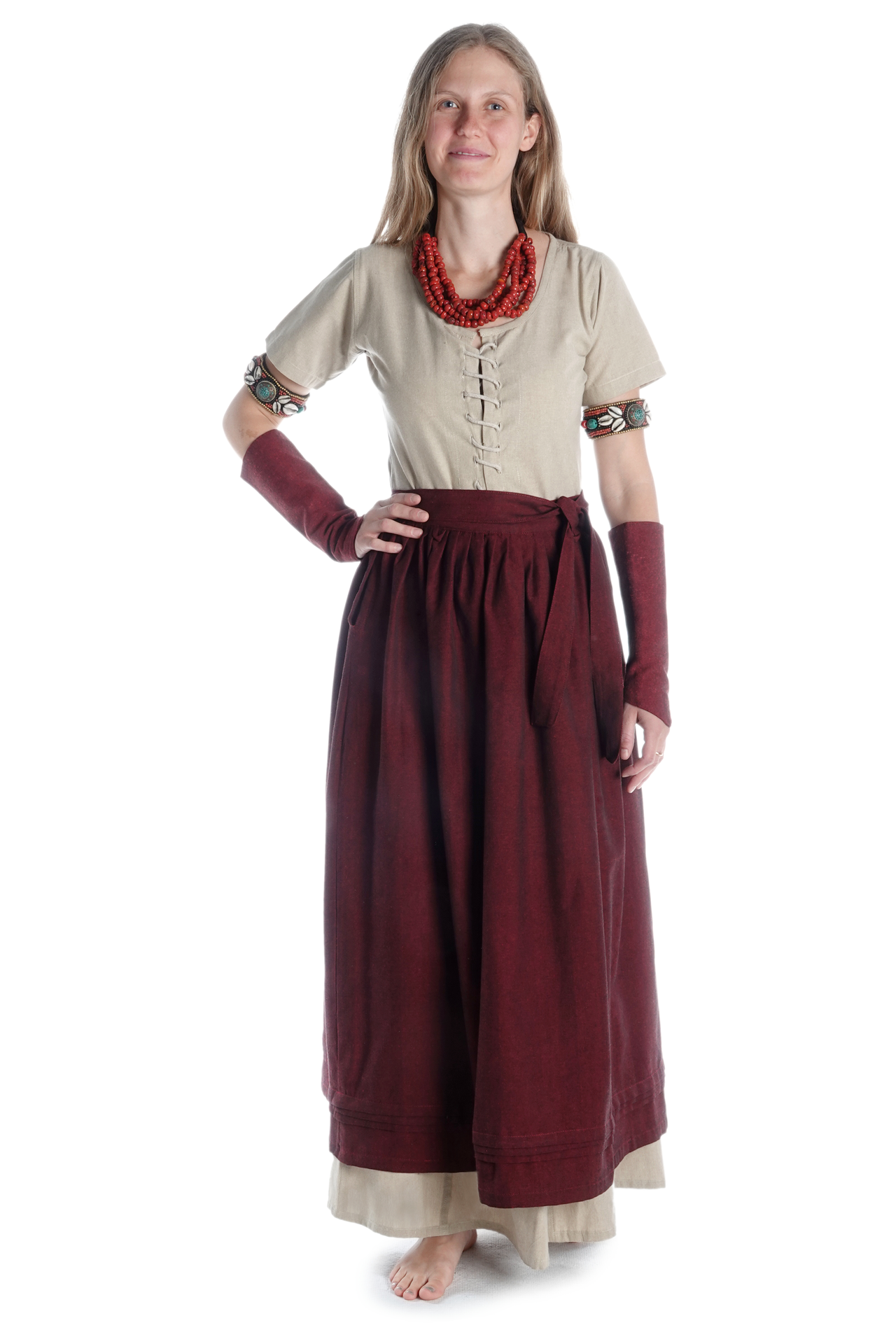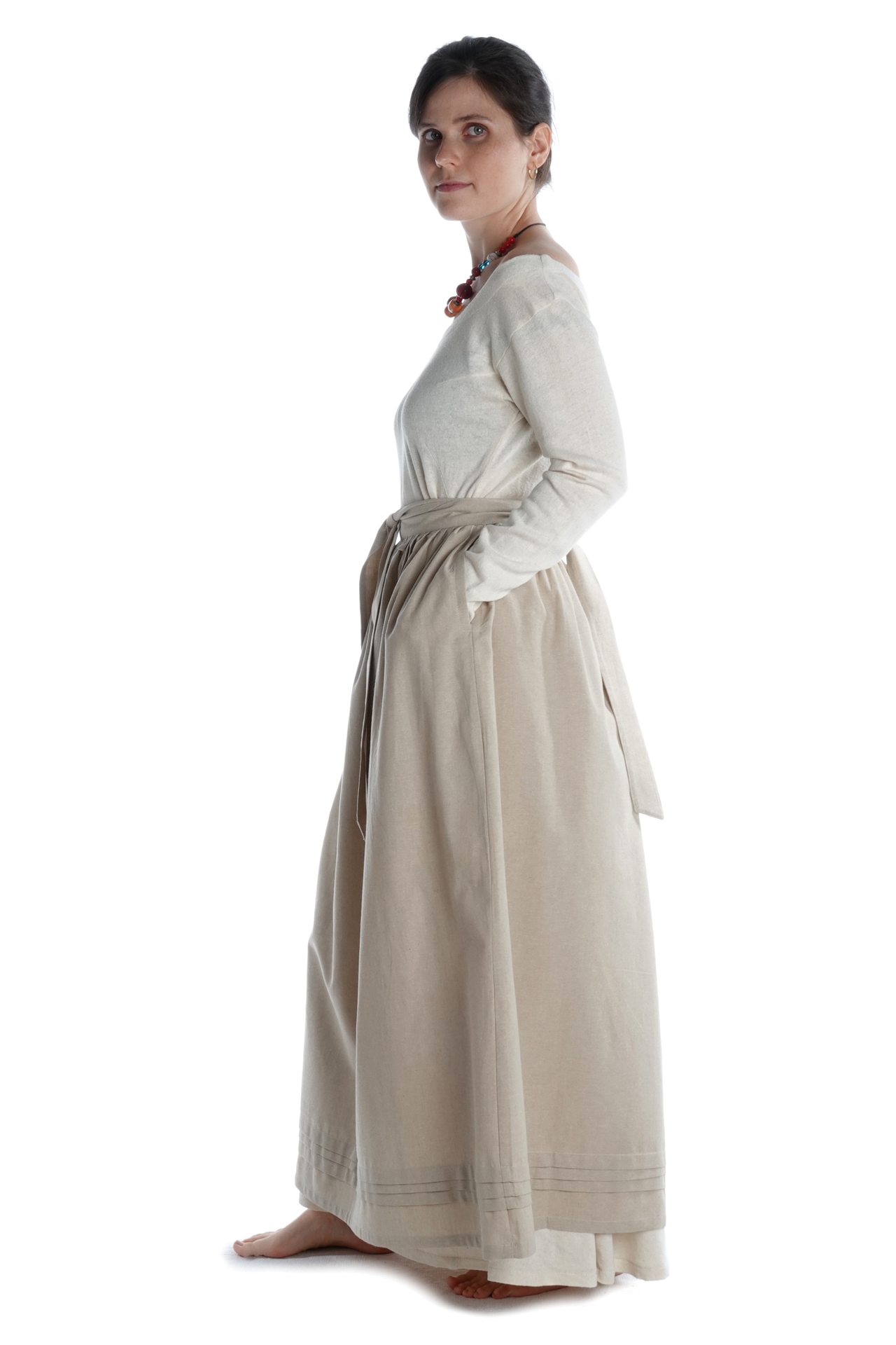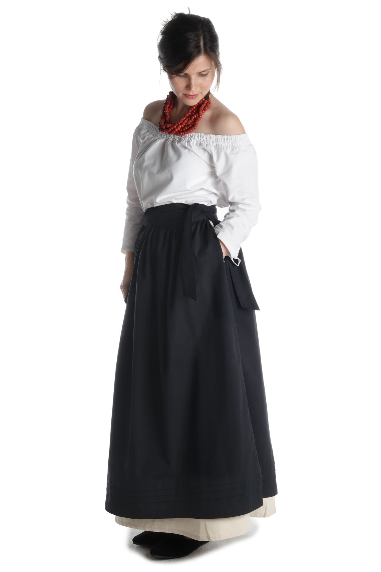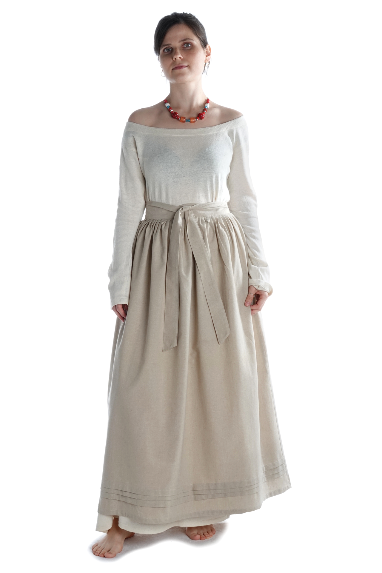 Unser Schürzen-Rock „Widga“ wurde von der traditionellen mittelalterlichen Kleidung inspiriert. Er verfügt über beidseitige langen Bändern an der Taille zum seitlichen Zubinden. Desweiteren befinden sich zwei kleine Schlaufen vorne außen und vorne innen, damit die vier beigelegten Schnüre fixiert werden können, um den Rock auch hochgerafft tragen zu können. So haben Sie genügend Beinfreiheit bei der Arbeit.