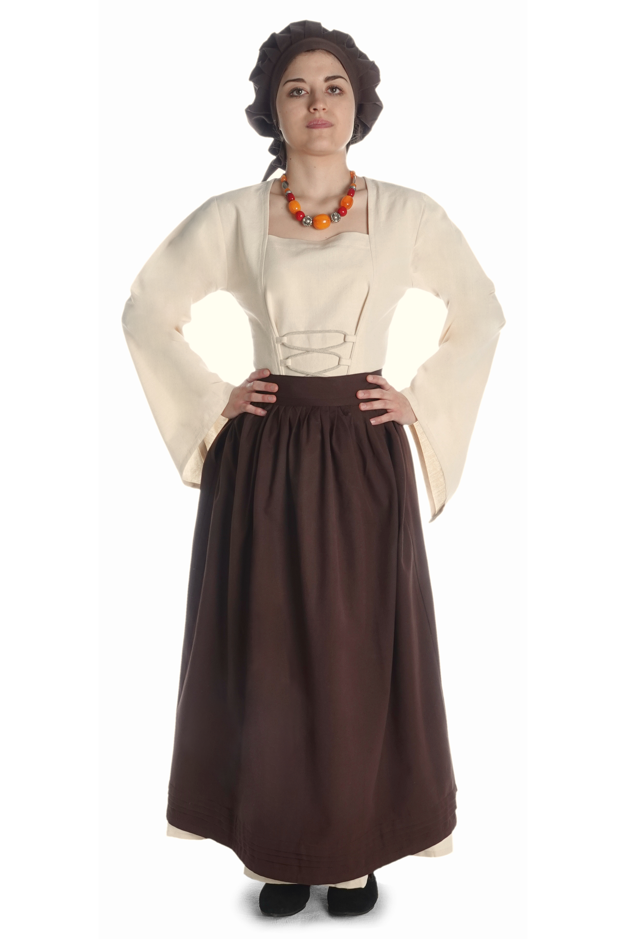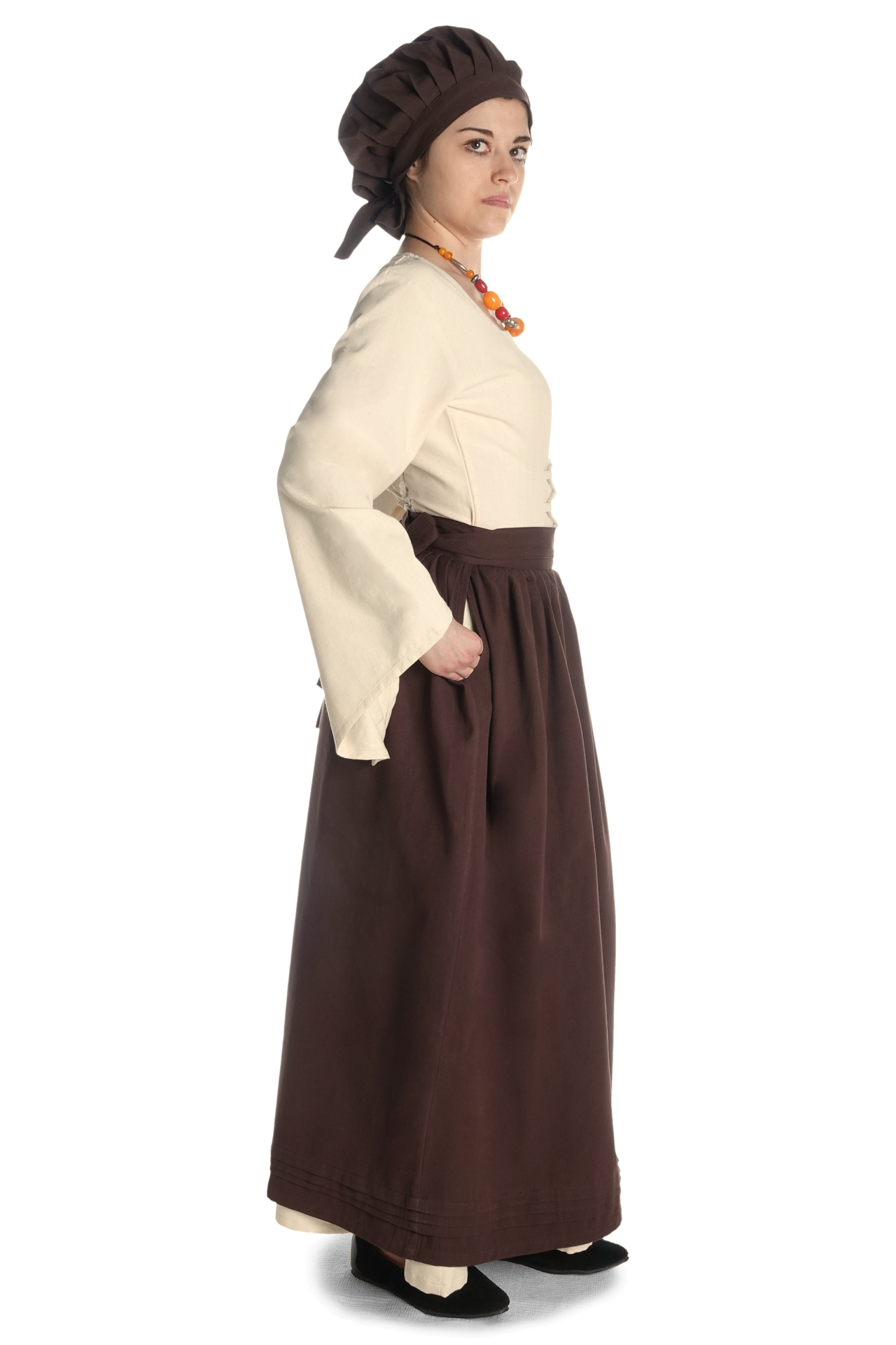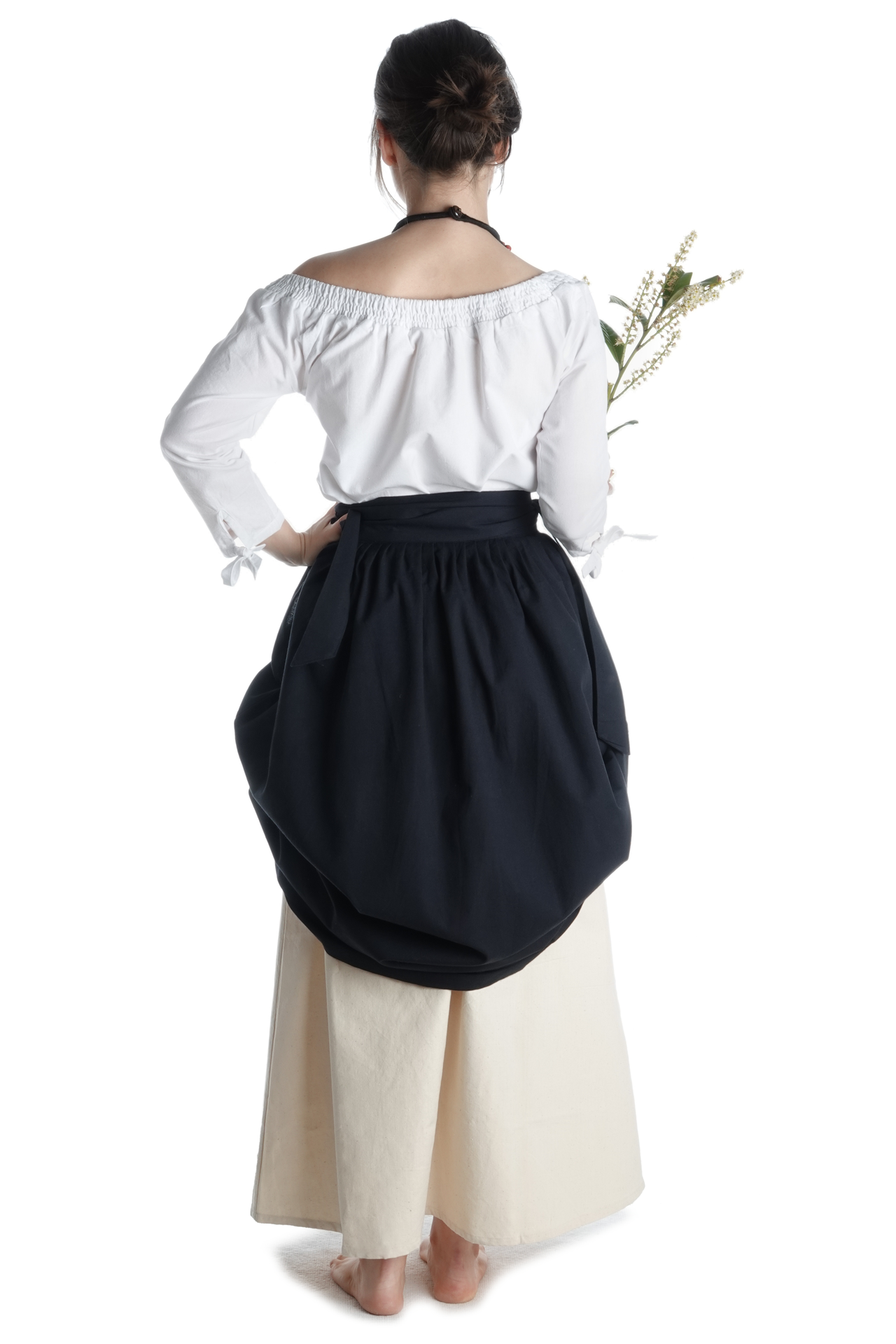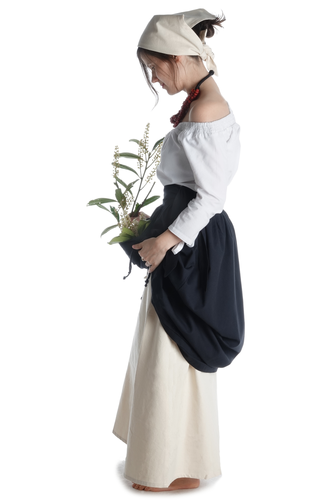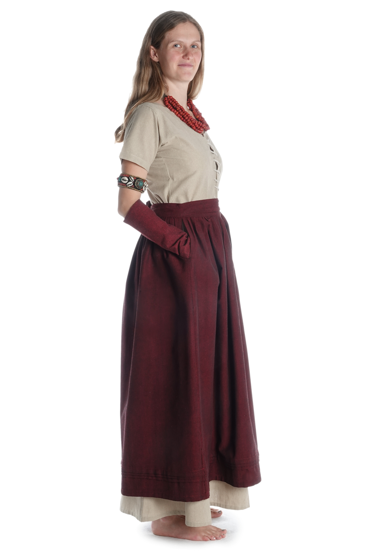 Unser Schürzen-Rock „Widga“ wurde von der traditionellen mittelalterlichen Kleidung inspiriert. Er verfügt über beidseitige langen Bändern an der Taille zum seitlichen Zubinden. Desweiteren befinden sich zwei kleine Schlaufen vorne außen und vorne innen, damit die vier beigelegten Schnüre fixiert werden können, um den Rock auch hochgerafft tragen zu können. So haben Sie genügend Beinfreiheit bei der Arbeit.