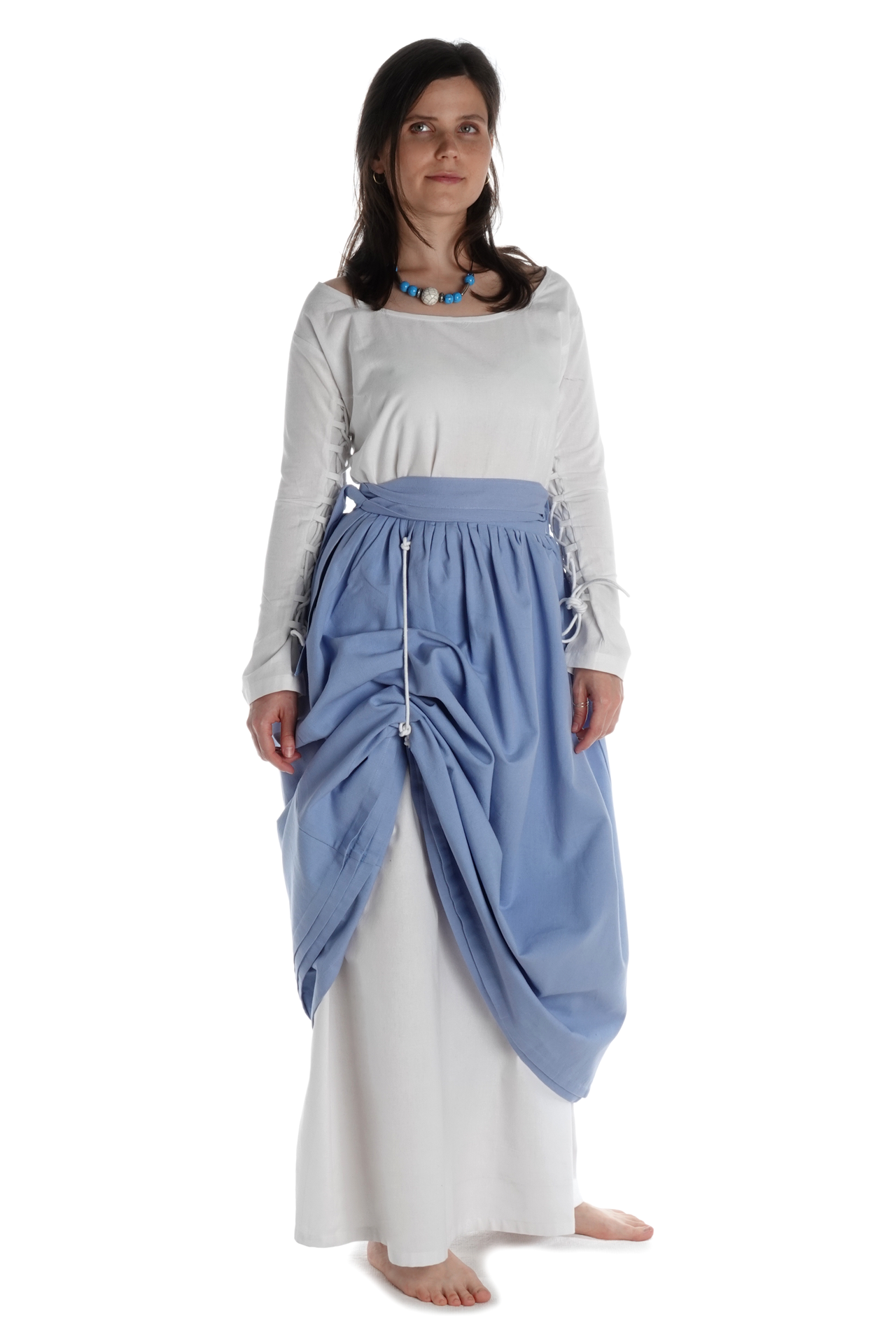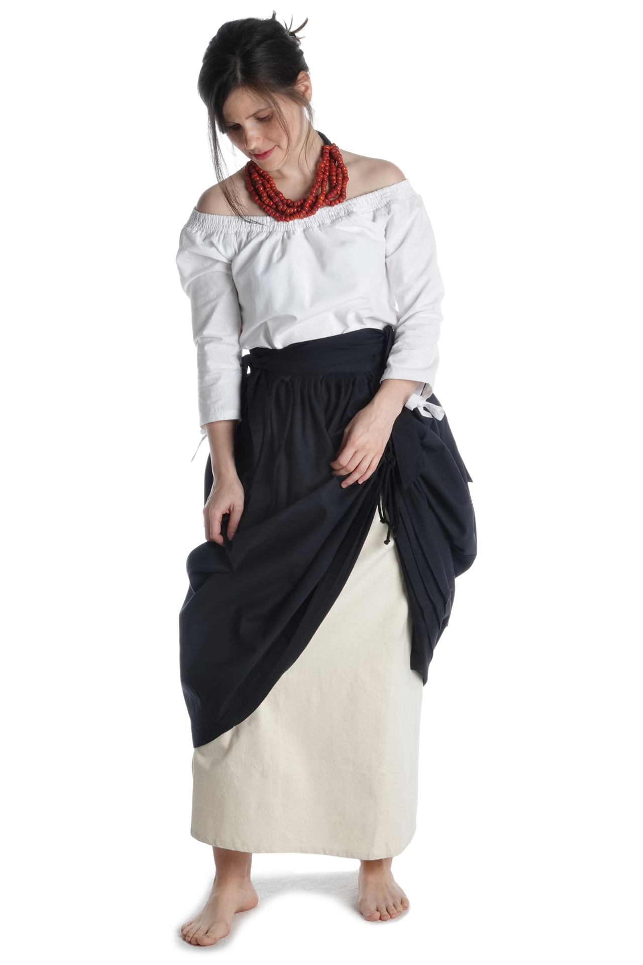 - Langer Schürzen-Rock kann durch Schnüre hochgerafft werden