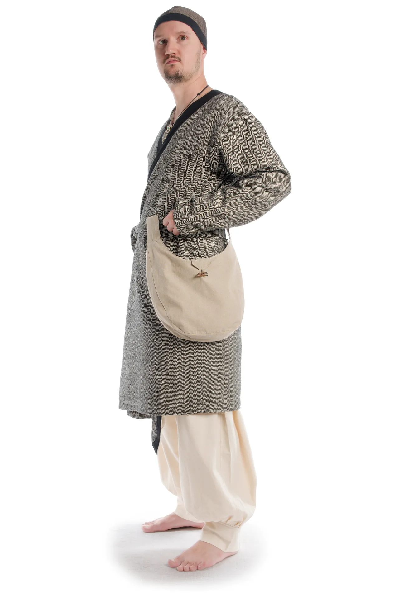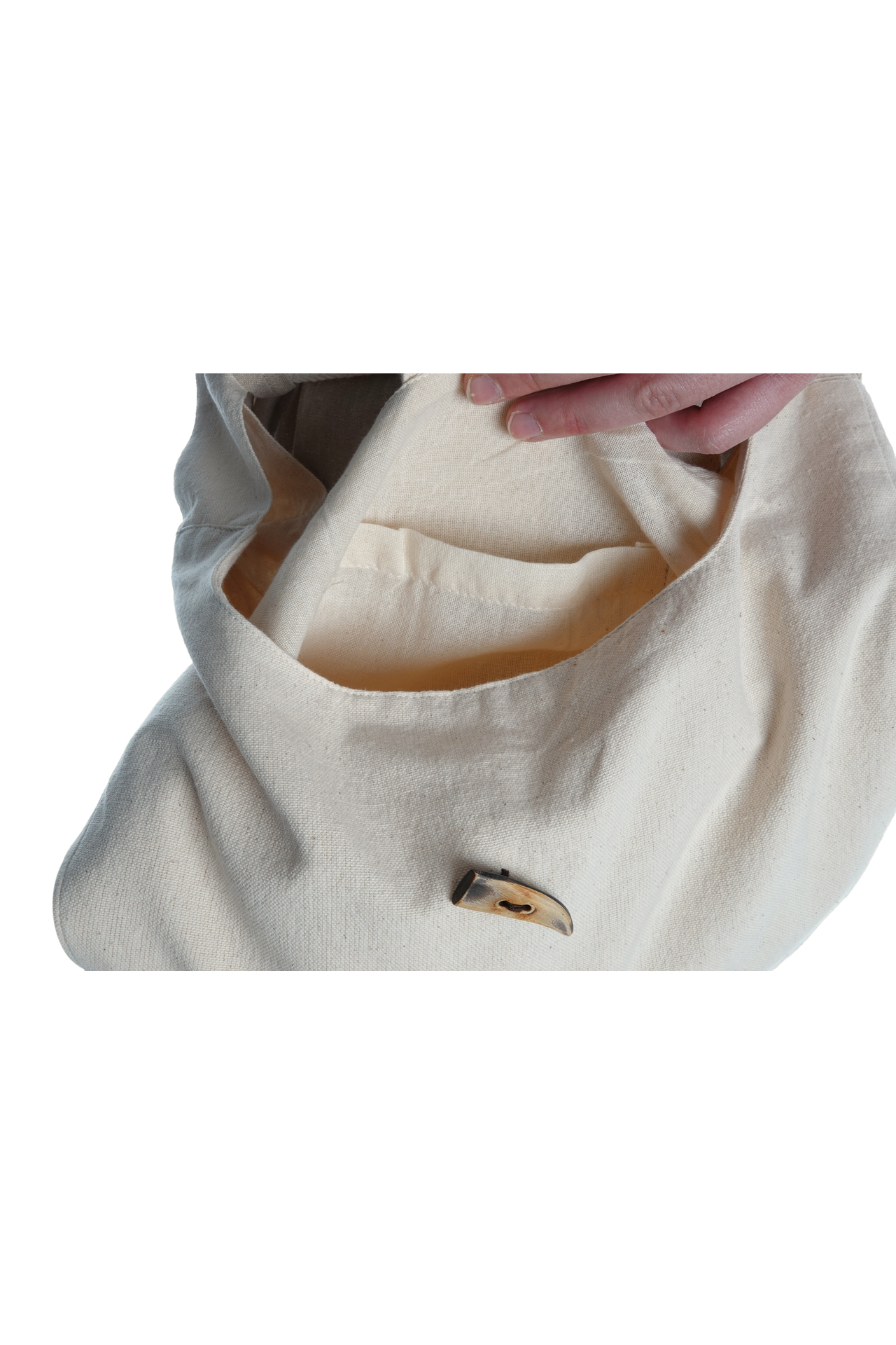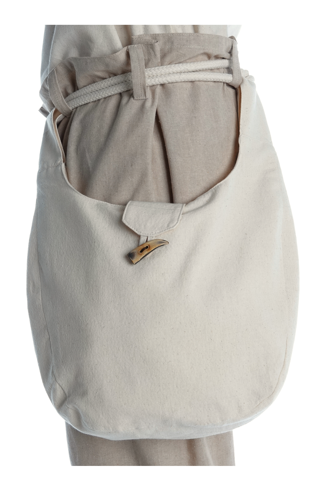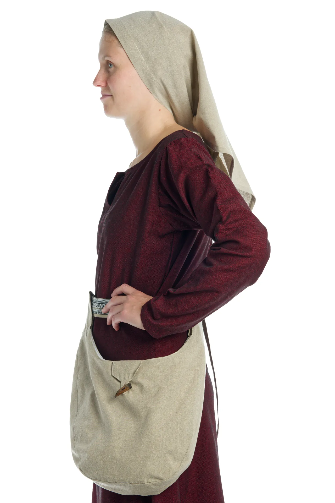 Diese große mittelalterliche Gürteltasche besteht aus reiner Baumwolle. Der naturbelassene Stoff wurde mit Leinenstruktur handgewebt, woraus ein robustes und langlebiges Textil mit hoher Gewebequalität resultierte.