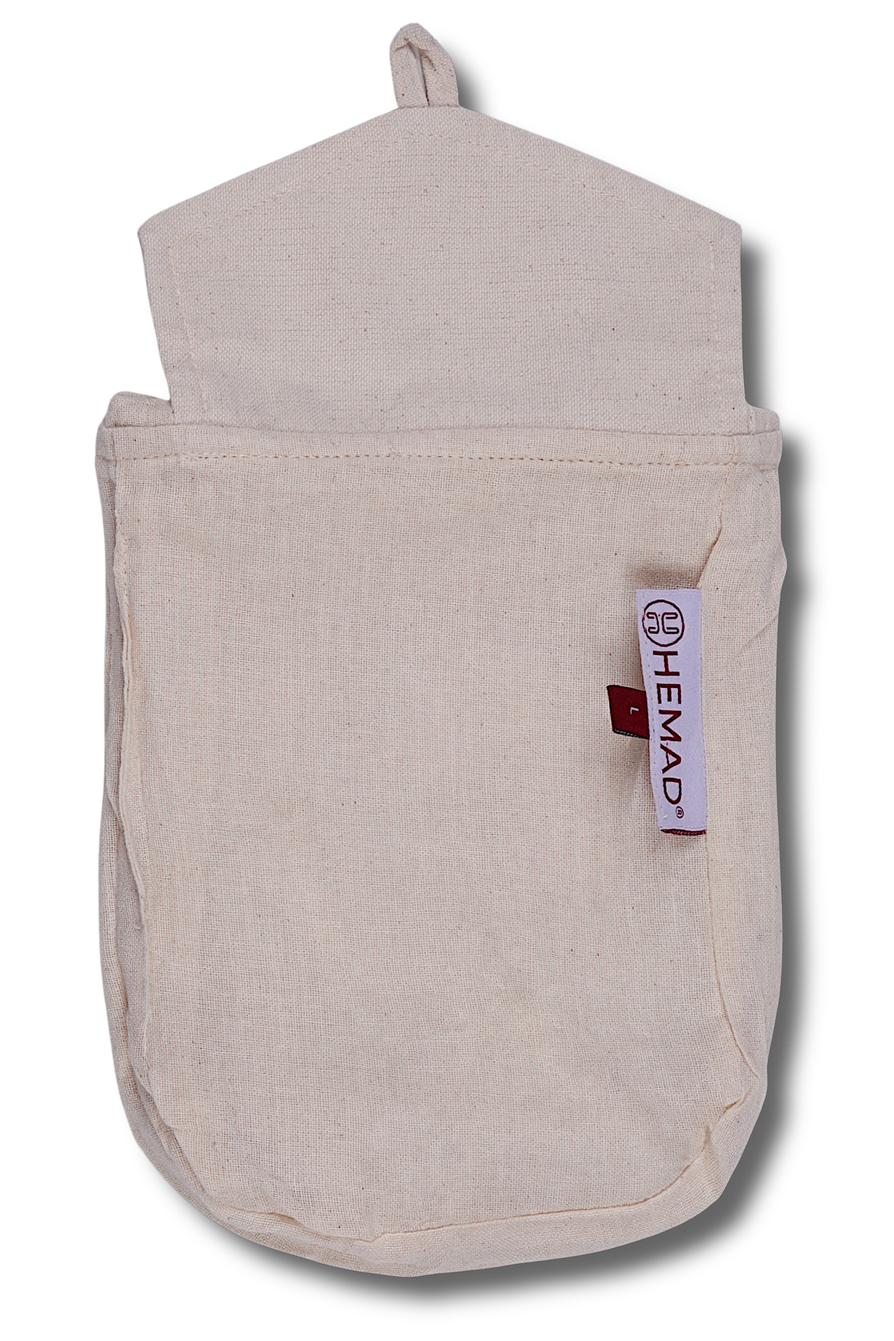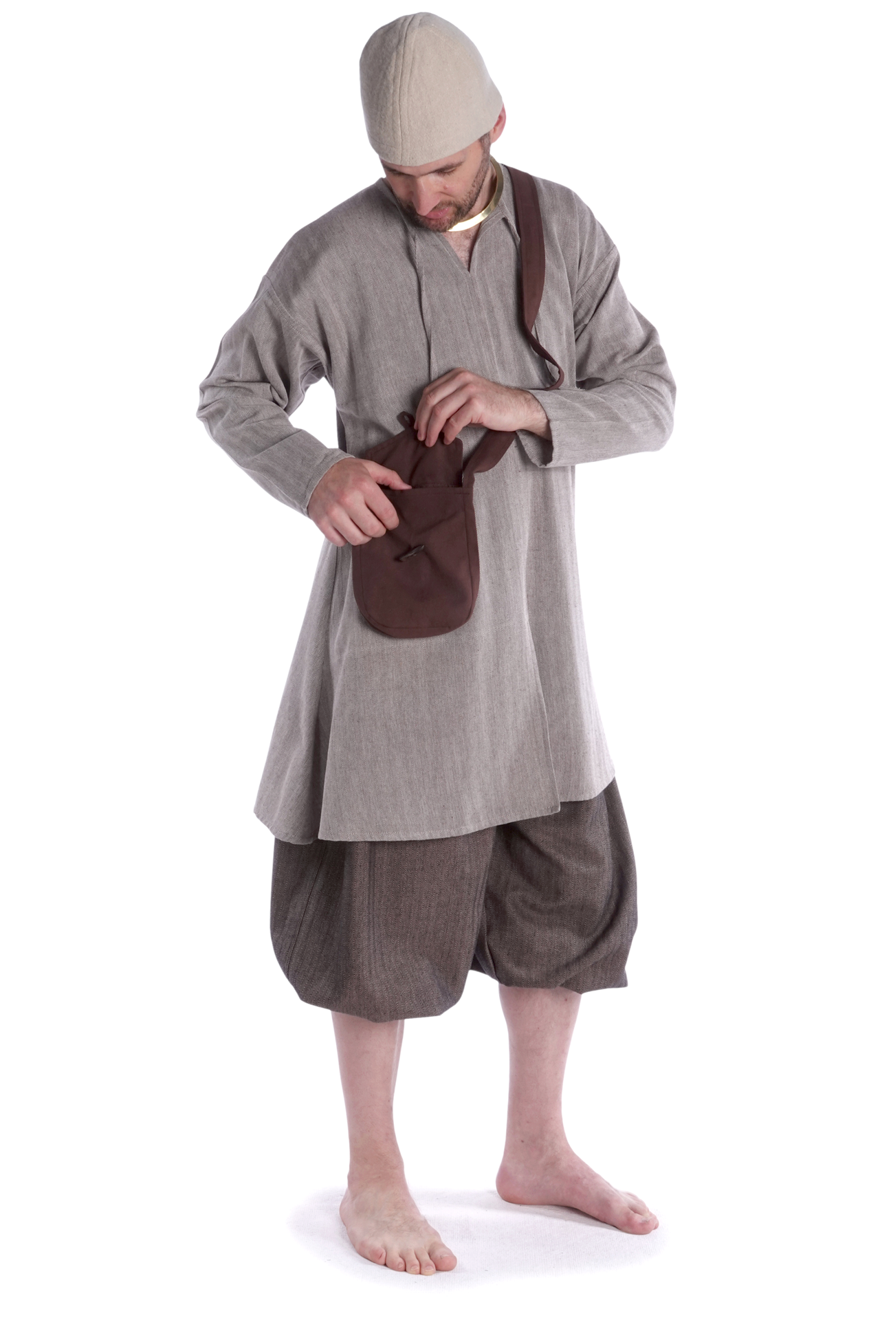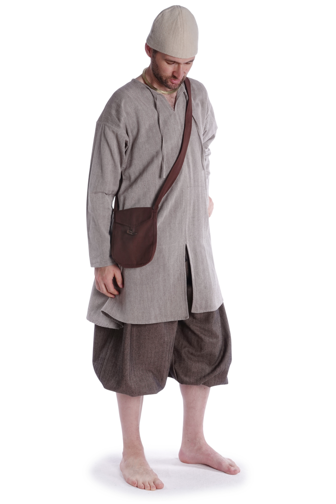 Diese große mittelalterliche Tragetasche besteht aus reiner Baumwolle. Der naturbelassene Stoff wurde mit Leinenstruktur handgewebt, woraus ein robustes und langlebiges Textil mit hoher Gewebequalität resultierte.