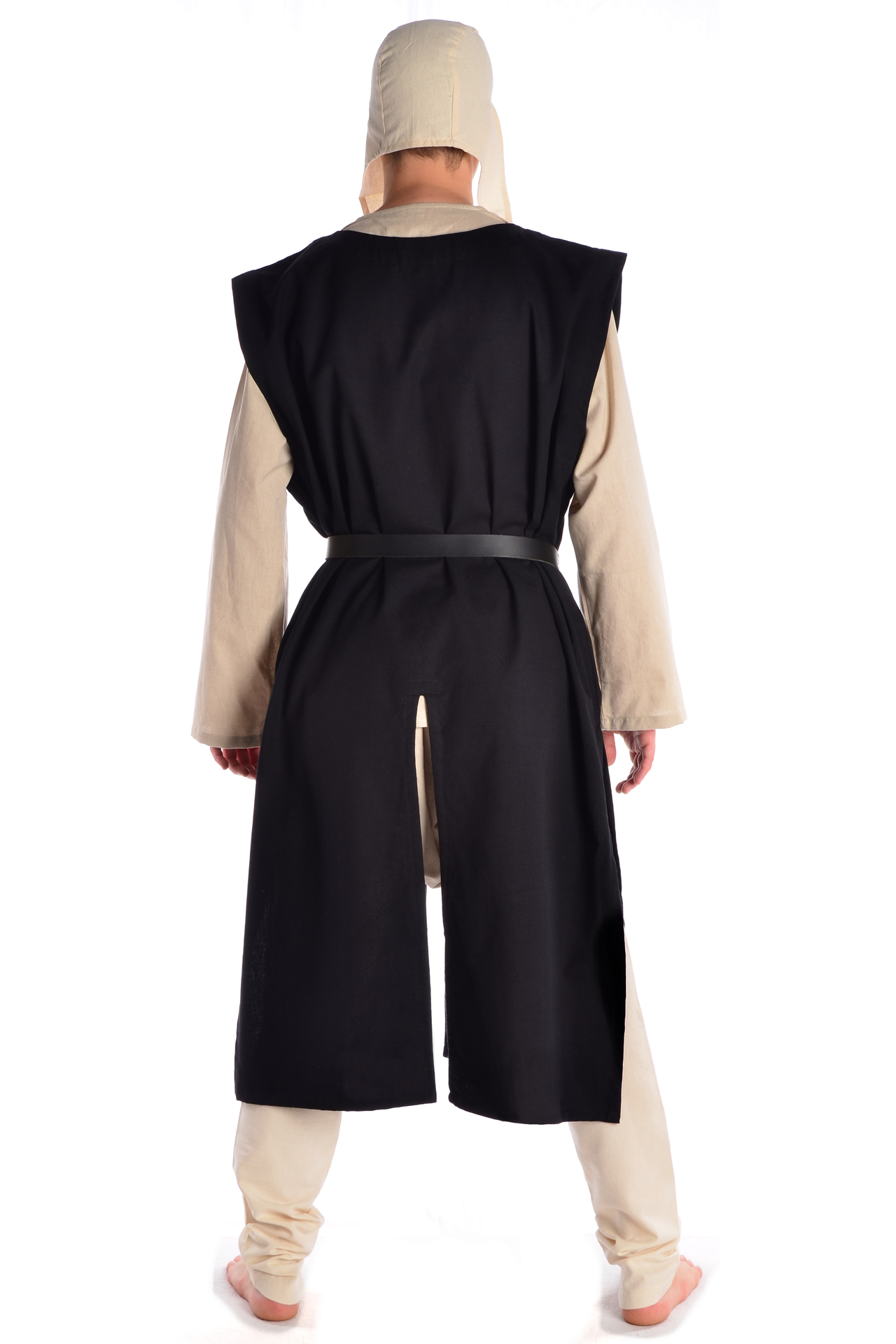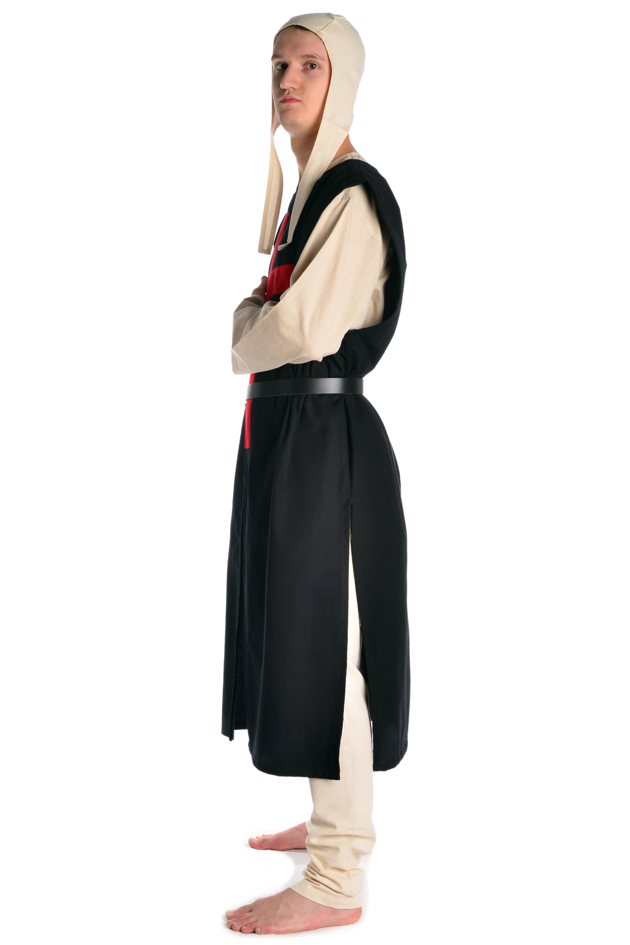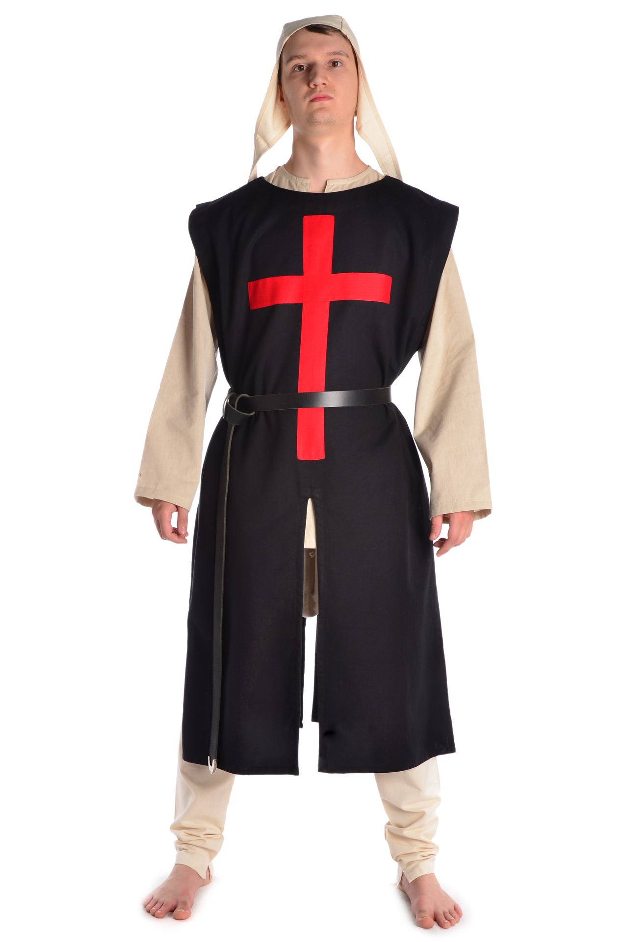 Unser Waffenrock „Eckesachs“ ist ein ärmelloses historisches Obergewand mit rundem Halsausschnitt. Sein langer Rock verfügt über vier Öffnungen (vorne, hinten und seitlich). Diese Gehschlitze gewähren nicht nur maximalen Bewegungsradius, sondern erlauben auch das Reiten zu Pferd. Ferner wird das Kleidungsstück in Einheitsgröße geliefert, die derart geschnitten ist, dass das Tragen des Waffenrocks über Kettenhemd oder Rüstung völlig problemlos ist. Darüber hinaus verfügt die schwarze mittelalterliche Gewandung über ein auf der Brust aufgenähtes rotes lateinisches Kreuz.