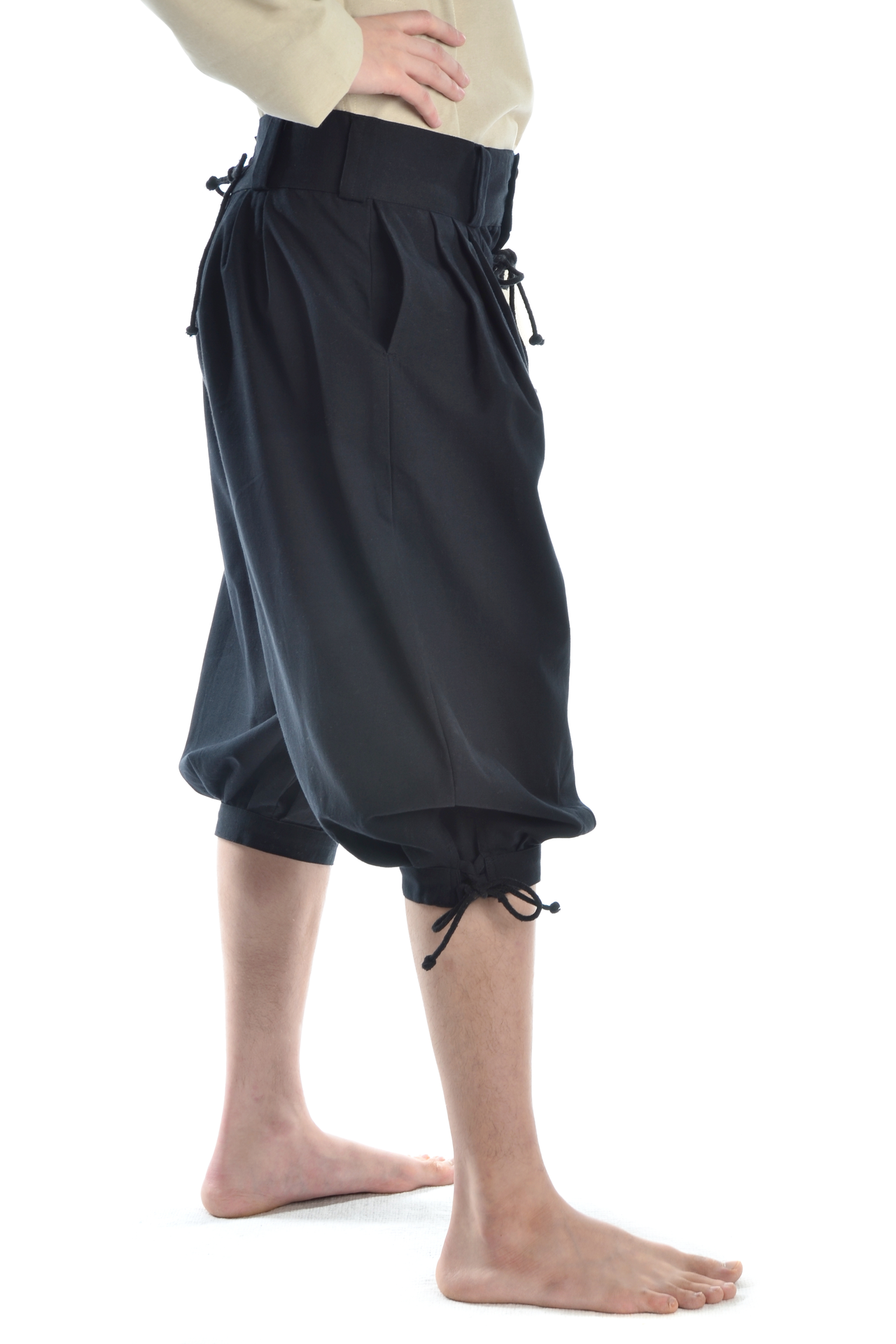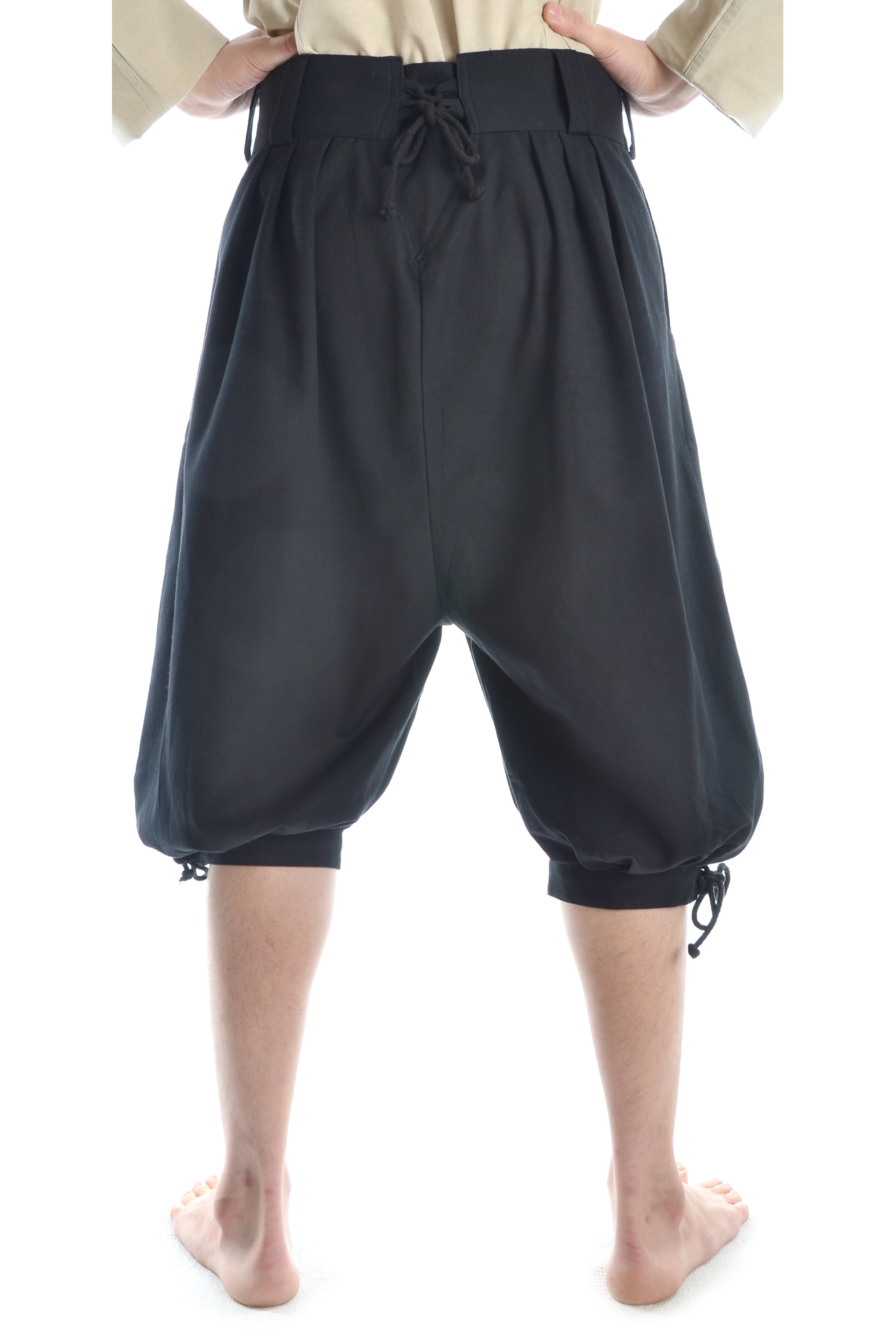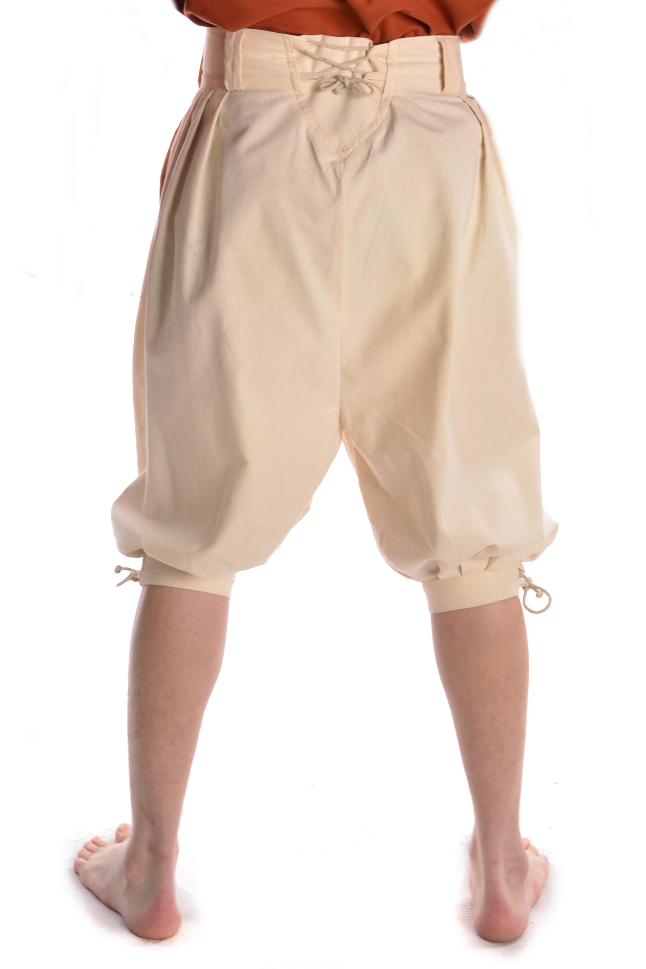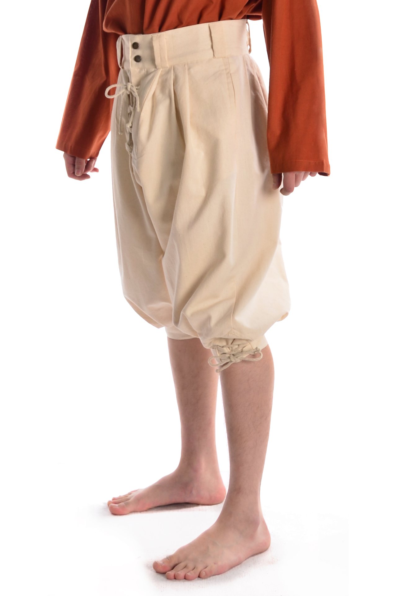 Die historisch wirkende Hose ist pludernd und weit geschnitten. An der Taille befinden sich Metallknöpfe als Verschluss, sowie jeweils vorne und hinten eine Schnürung. Am Bund unter den Knien befindet sich ebenfalls jeweils eine Schnürung. Darüber hinaus ermöglicht der großzügige Schritt völlige Bewegungsfreiheit. Ferner befindet sich auf der Vorderseite seitlich je eine praktische Eingriffstasche. Auch verfügt die Hose über Gürtelschlaufen. Durch den weiten Schnitt und die individuell anpassbare Beinschnürung ist die Hose für jeden Figurentyp geeignet.