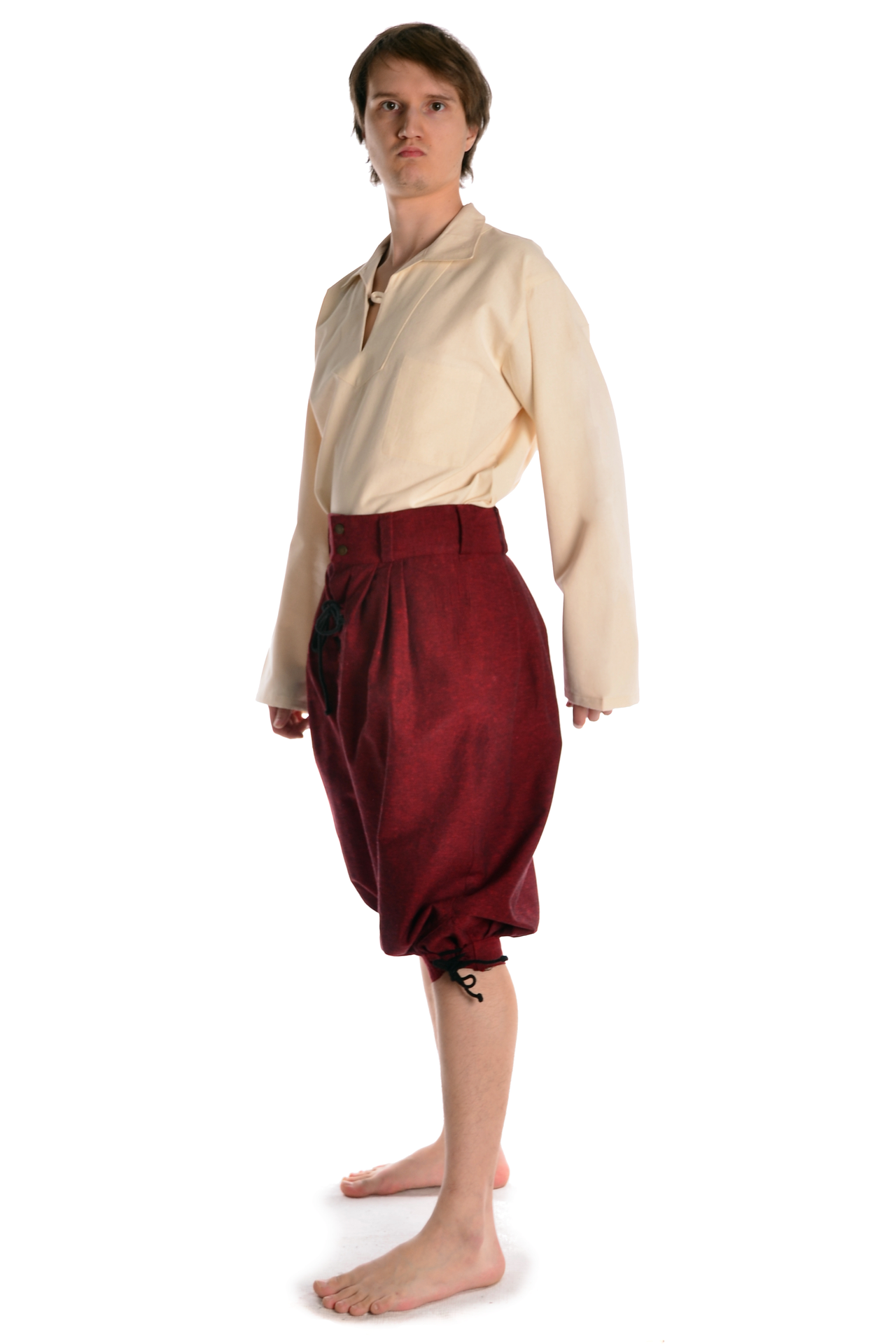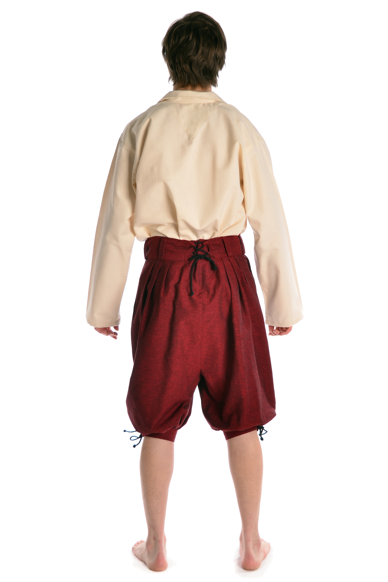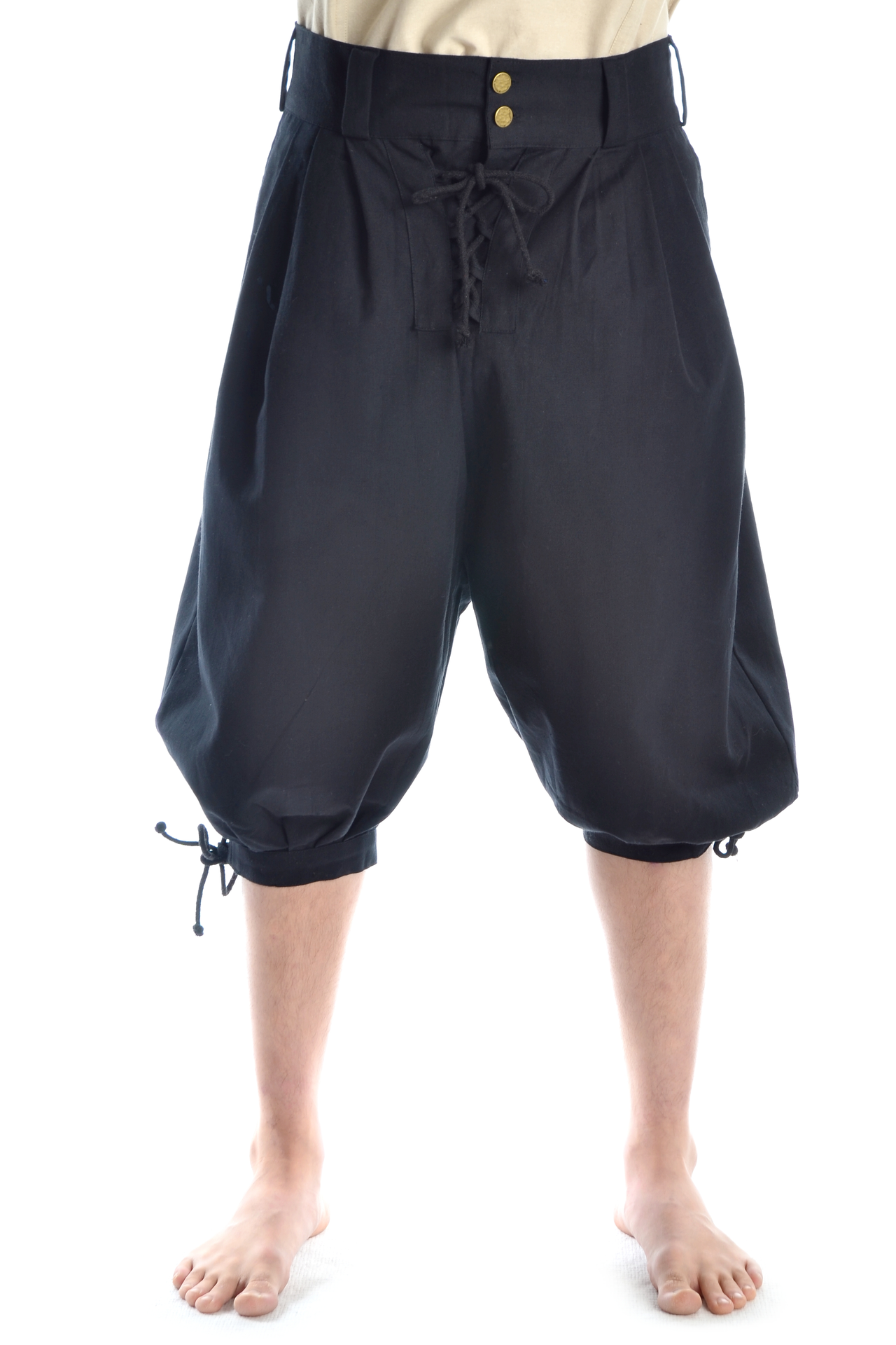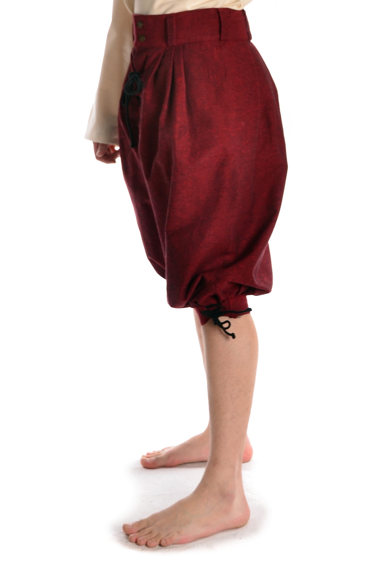 Die historisch wirkende Hose ist pludernd und weit geschnitten. An der Taille befinden sich Metallknöpfe als Verschluss, sowie jeweils vorne und hinten eine Schnürung. Am Bund unter den Knien befindet sich ebenfalls jeweils eine Schnürung. Darüber hinaus ermöglicht der großzügige Schritt völlige Bewegungsfreiheit. Ferner befindet sich auf der Vorderseite seitlich je eine praktische Eingriffstasche. Auch verfügt die Hose über Gürtelschlaufen. Durch den weiten Schnitt und die individuell anpassbare Beinschnürung ist die Hose für jeden Figurentyp geeignet.
