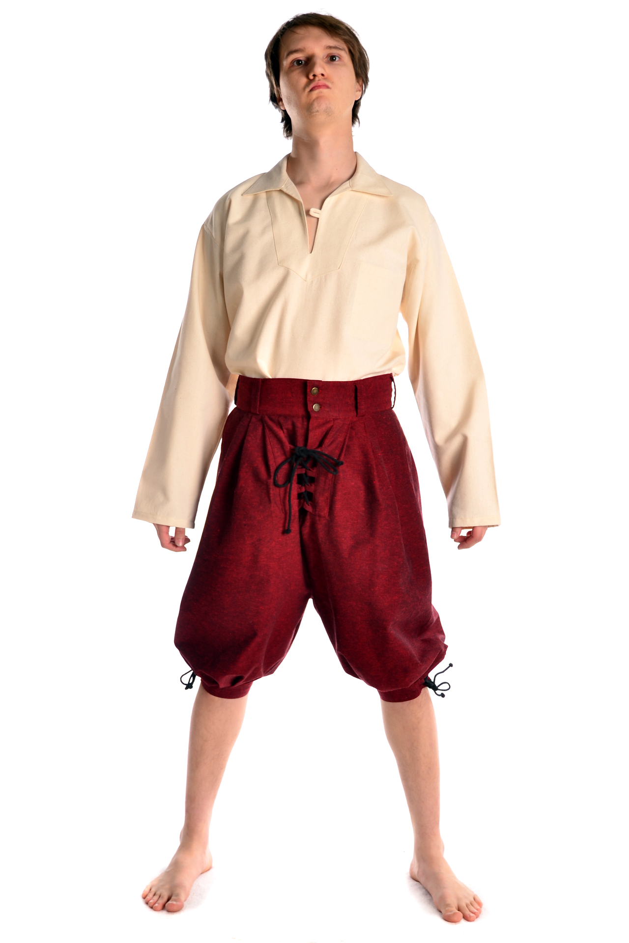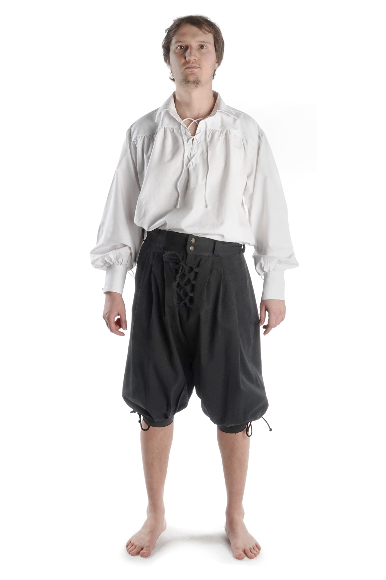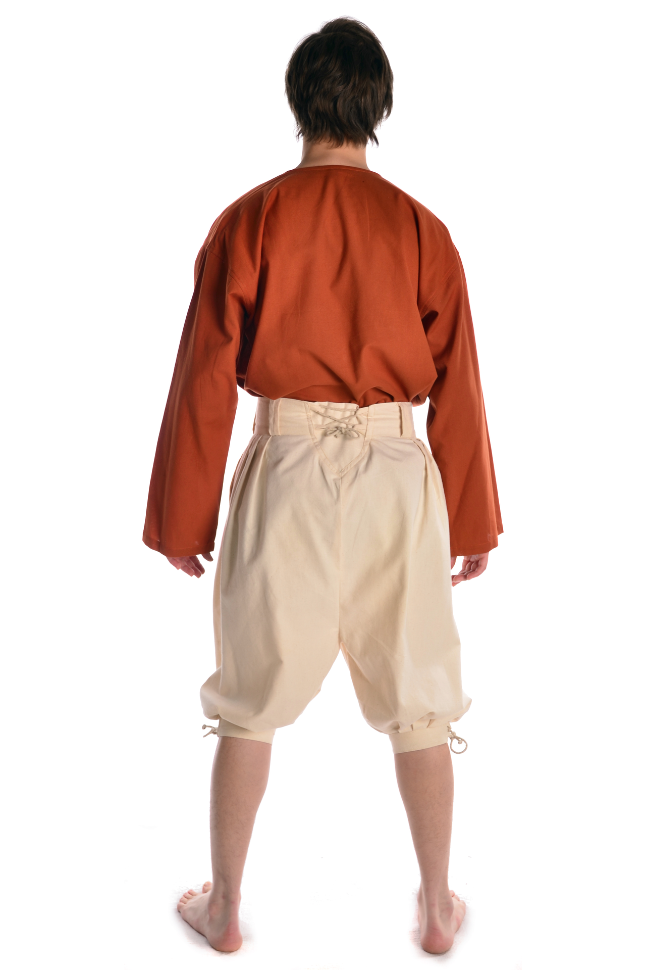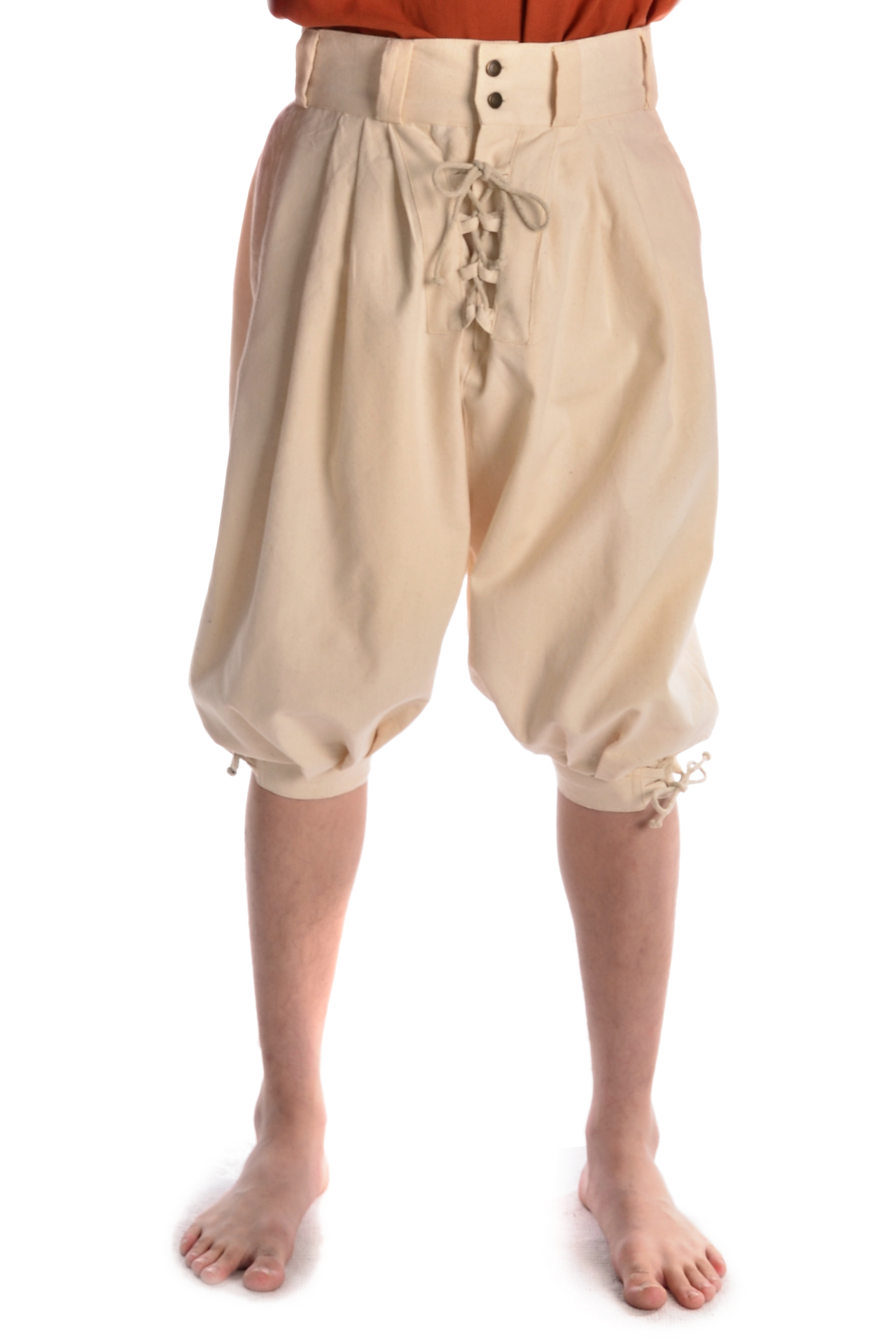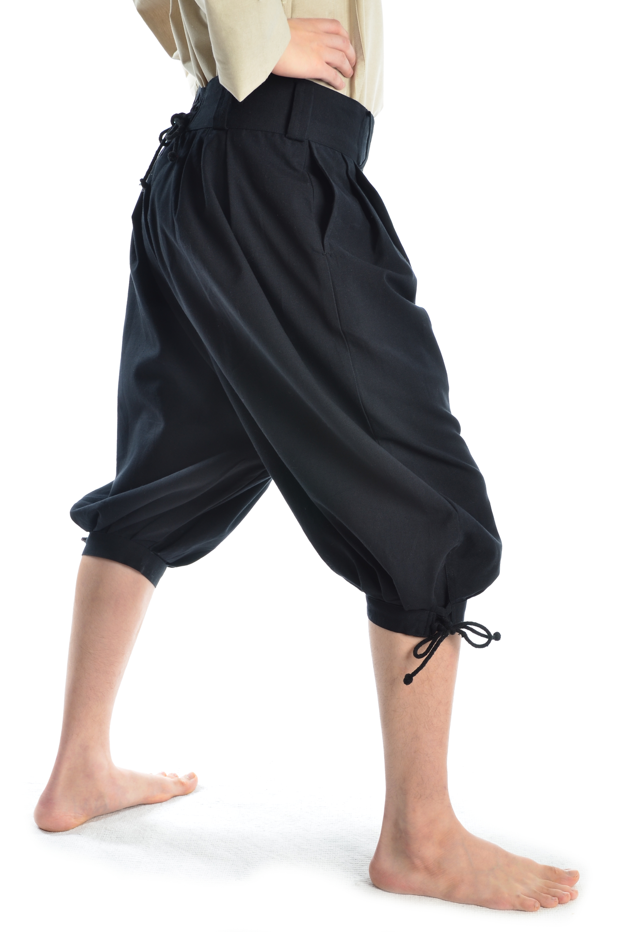 Die historisch wirkende Hose ist pludernd und weit geschnitten. An der Taille befinden sich Metallknöpfe als Verschluss, sowie jeweils vorne und hinten eine Schnürung. Am Bund unter den Knien befindet sich ebenfalls jeweils eine Schnürung. Darüber hinaus ermöglicht der großzügige Schritt völlige Bewegungsfreiheit. Ferner befindet sich auf der Vorderseite seitlich je eine praktische Eingriffstasche. Auch verfügt die Hose über Gürtelschlaufen. Durch den weiten Schnitt und die individuell anpassbare Beinschnürung ist die Hose für jeden Figurentyp geeignet.