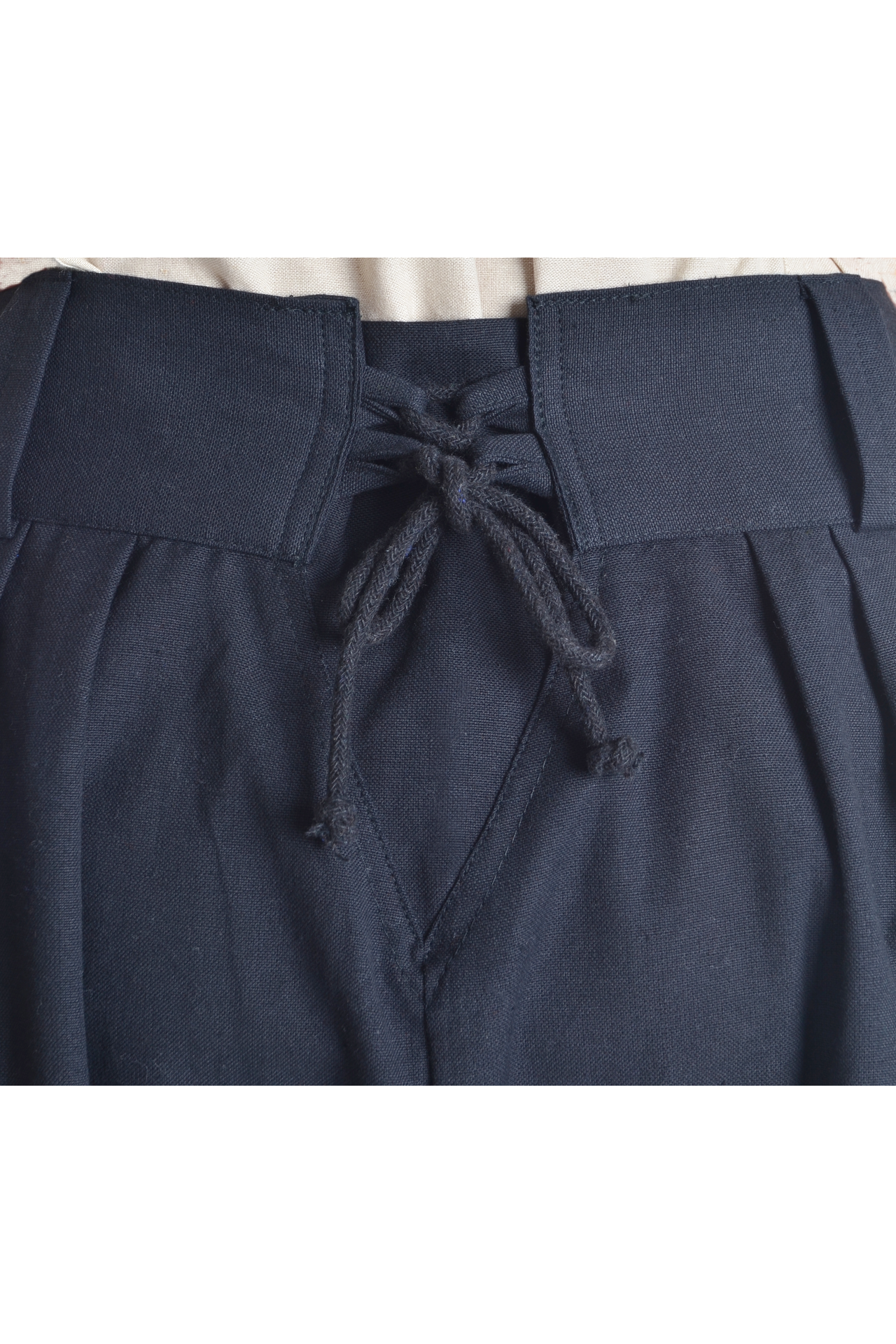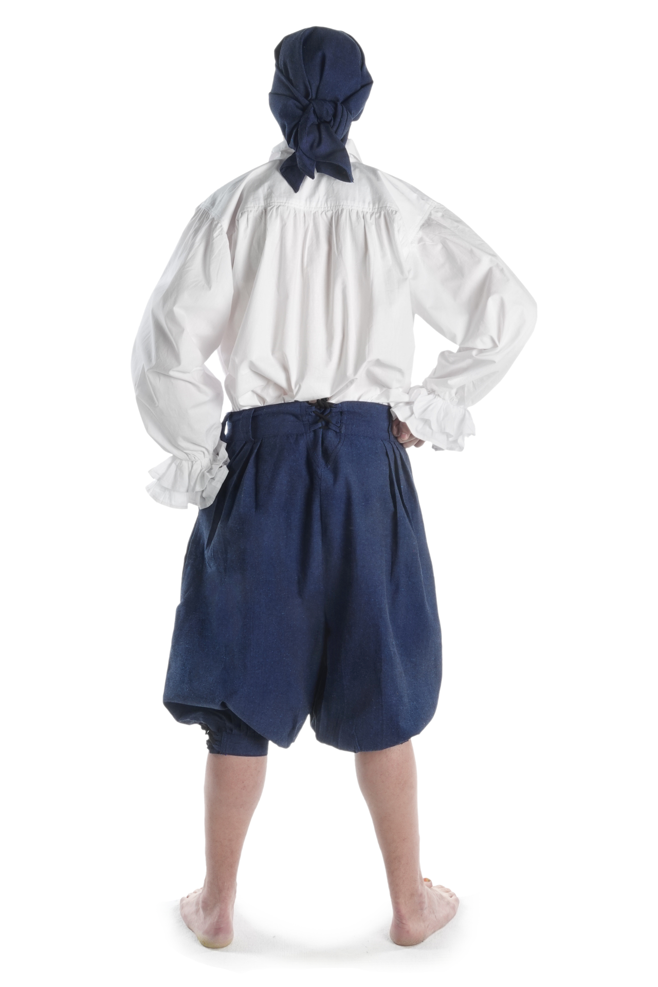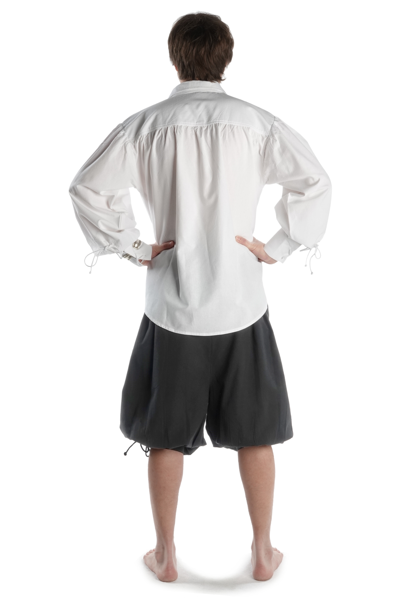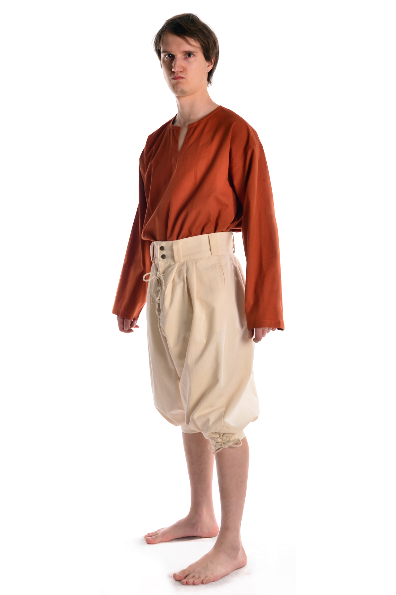 Die historisch wirkende Hose ist pludernd und weit geschnitten. An der Taille befinden sich Metallknöpfe als Verschluss, sowie jeweils vorne und hinten eine Schnürung. Am Bund unter den Knien befindet sich ebenfalls jeweils eine Schnürung. Darüber hinaus ermöglicht der großzügige Schritt völlige Bewegungsfreiheit. Ferner befindet sich auf der Vorderseite seitlich je eine praktische Eingriffstasche. Auch verfügt die Hose über Gürtelschlaufen. Durch den weiten Schnitt und die individuell anpassbare Beinschnürung ist die Hose für jeden Figurentyp geeignet.