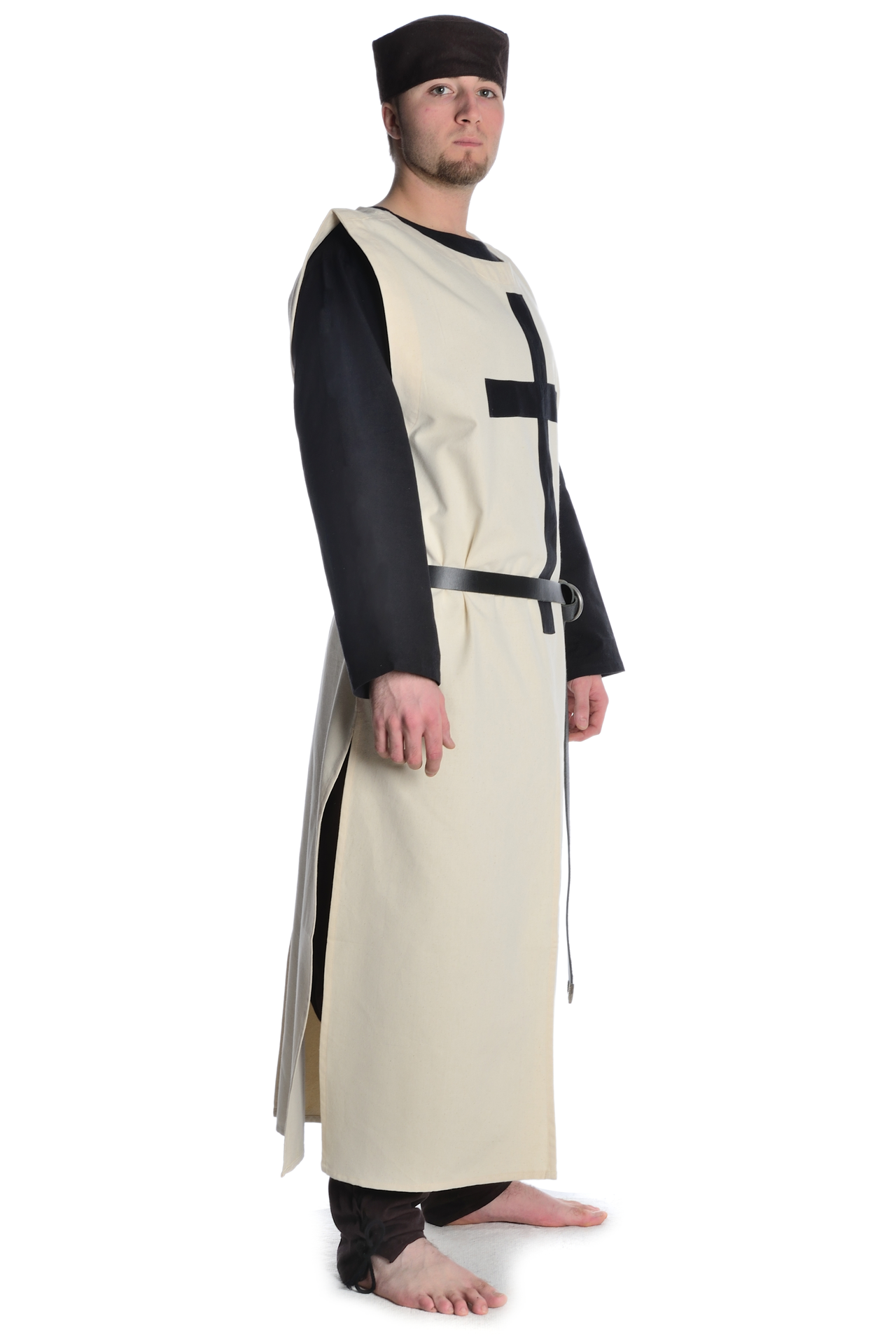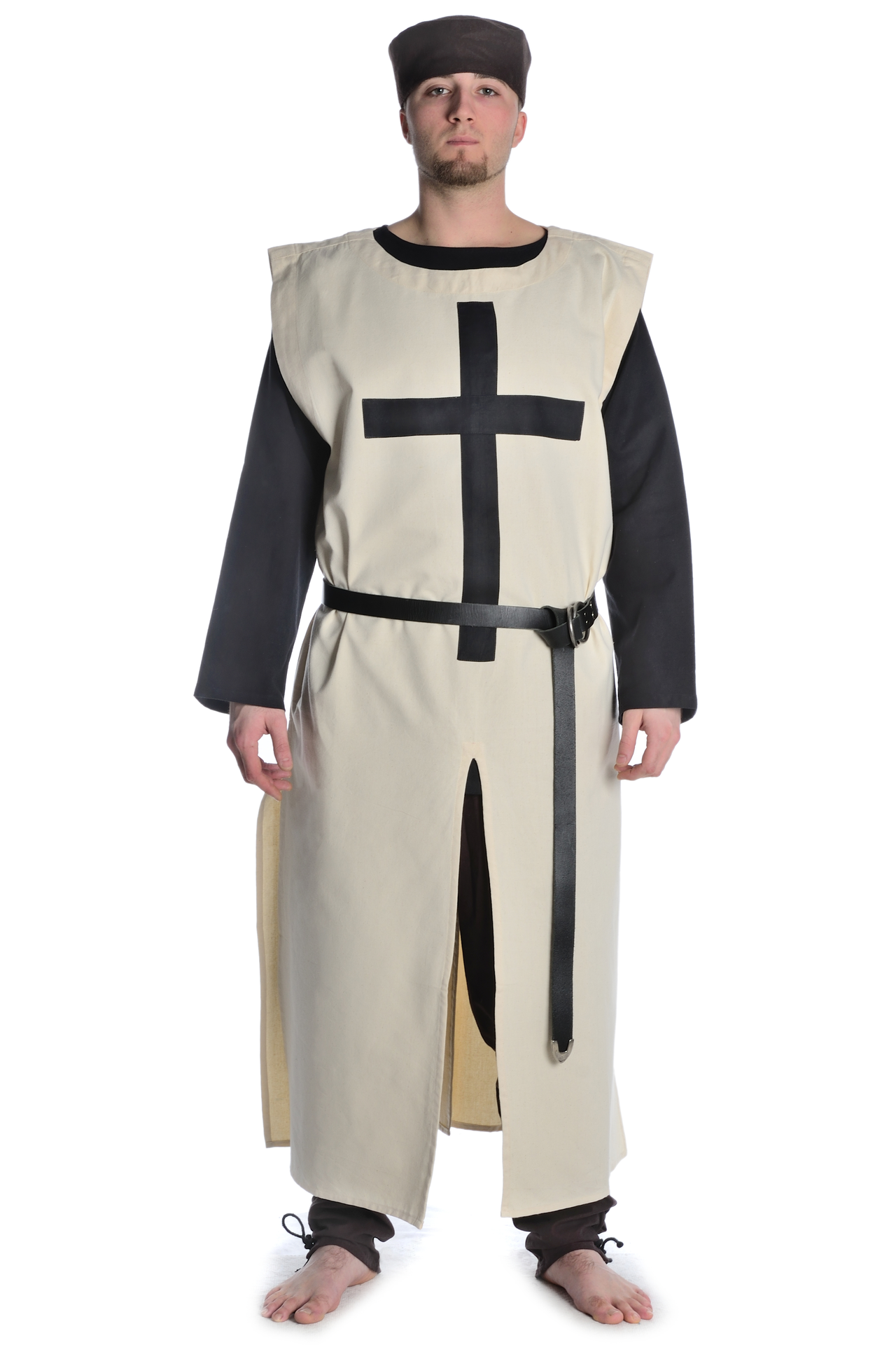 Unser Waffenrock "Tourendal" ist ein ärmelloses historisches Obergewand mit rundem Halsausschnitt. Sein langer Rock verfügt über vier Öffnungen (vorne, hinten und seitlich). Diese Gehschlitze gewähren nicht nur maximalen Bewegungsradius, sondern erlauben auch das Reiten zu Pferd. Ferner wird das Kleidungsstück in Einheitsgröße geliefert, die derart geschnitten ist, dass ein Tragen des Waffenrocks über Kettenhemd oder Rüstung völlig problemlos ist. Darüber hinaus verfügt die beigefarbene mittelalterliche Gewandung über ein auf der Brust aufgenähtes schwarzes Kreuz. Dieses Wappen des Deutschen Ordens (ab dem späten 12. Jahrhundert) können Sie mit geradem lateinischen Kreuz auswählen.