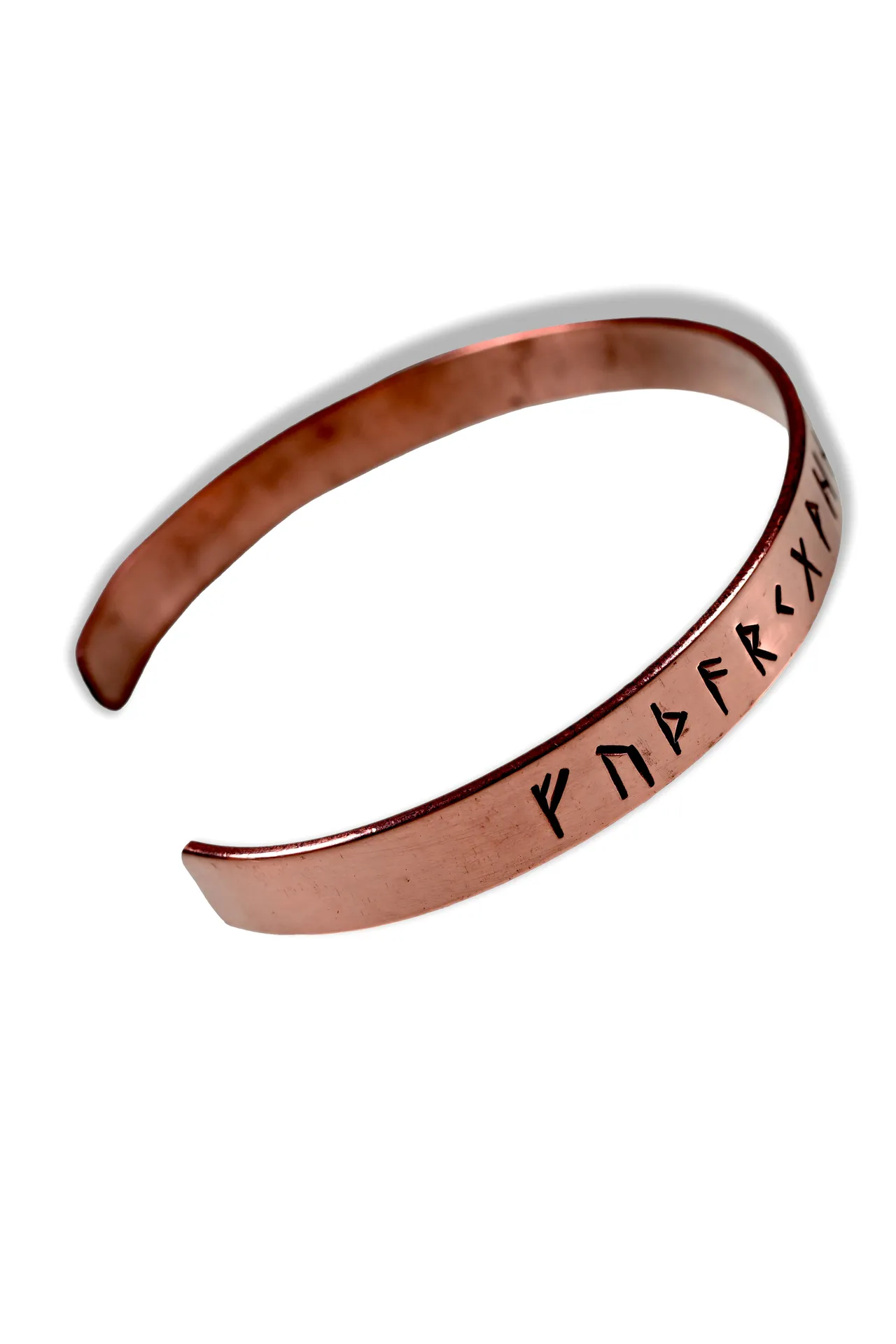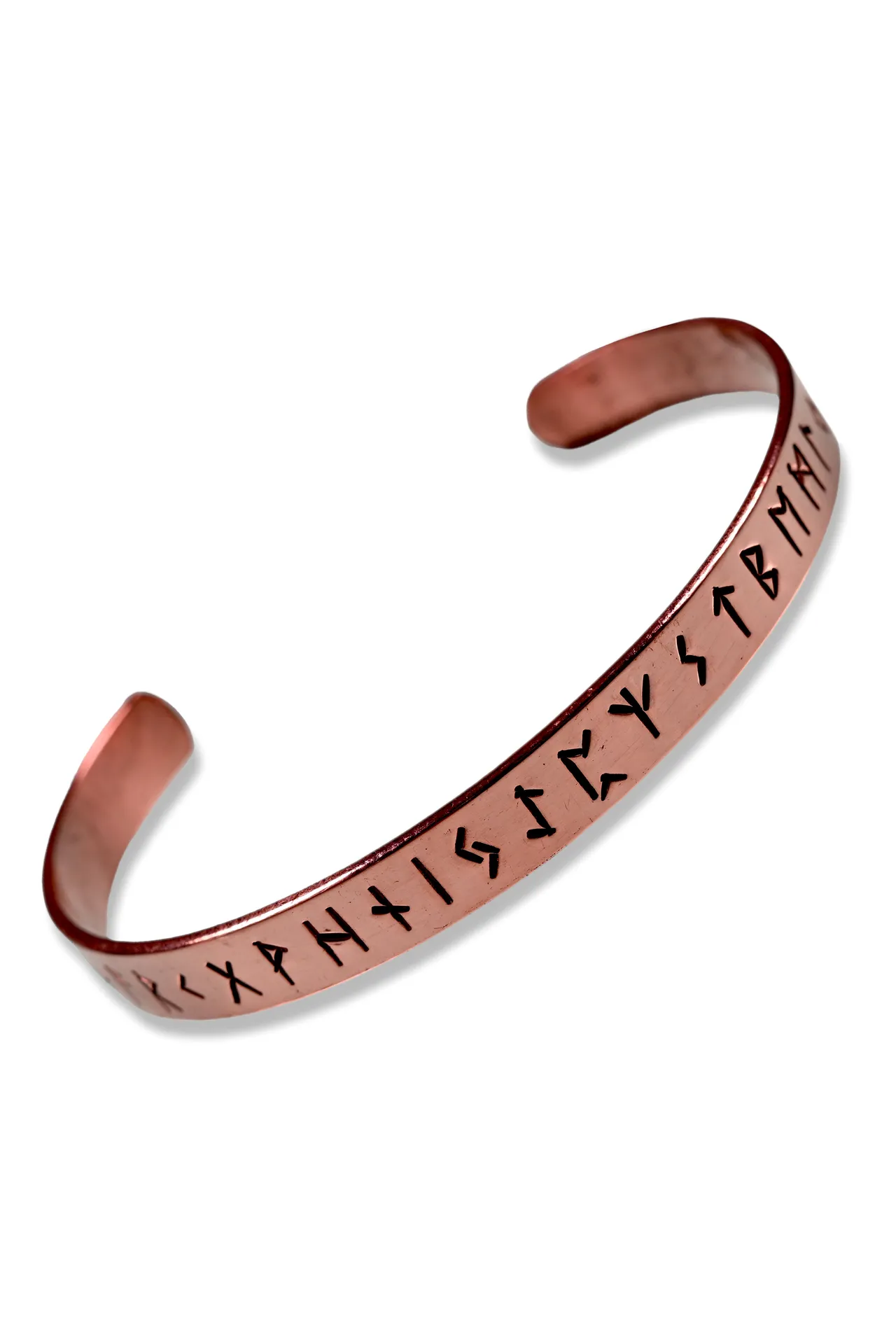 „Trygve“ in Kupfer ist zurückhaltend im Glanz, aber klar im Stil. Das Runenband im älteren Futhark liefert den nordischen Charakter, während das Material eine angenehm warme, erdige Optik bringt.