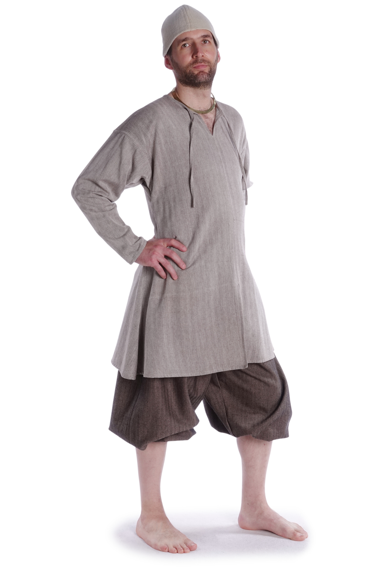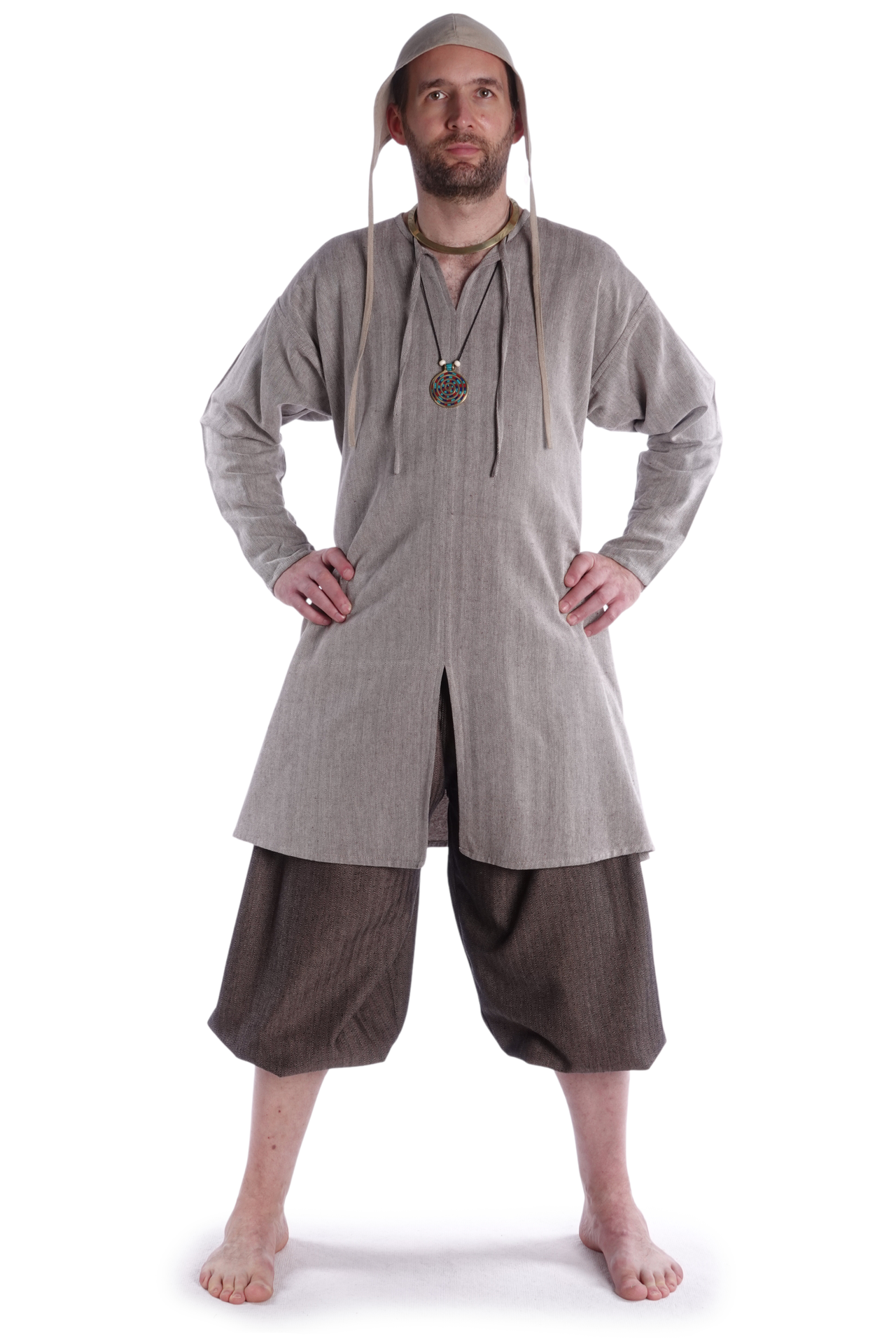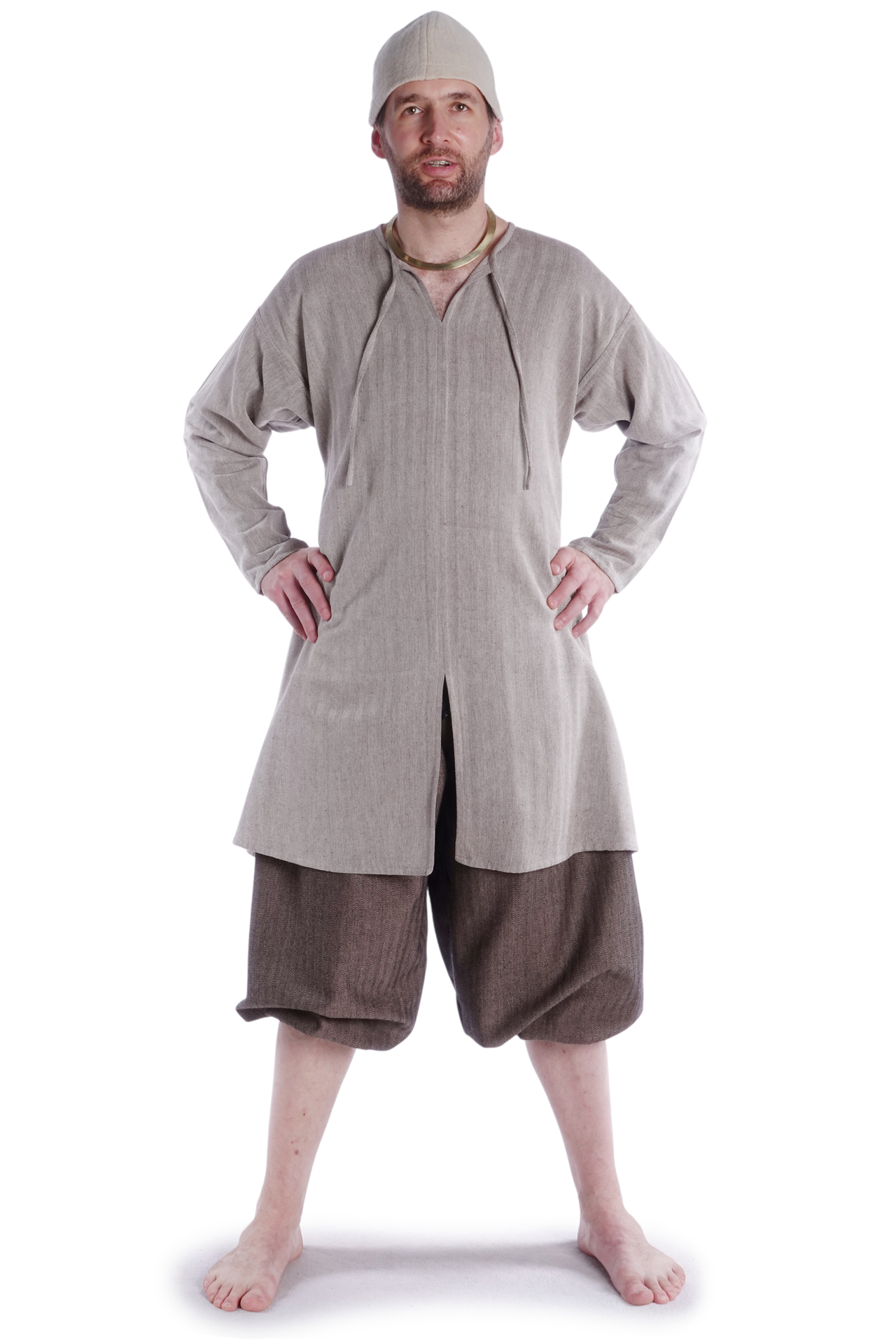 Es ist durch Funde und zeitgenössische Berichte historisch gesichert, dass die Gewandung der Wikingerkrieger auf Hosen basierte. Beispielsweise auf verschiedenen Fundstücken von Oseberg aus dem 9. Jahrhundert oder auf Bildsteinen der Wikingervölker sind Männer in Hosen abgebildet. Grundsätzlich wird zwischen zwei für diese Ära charakteristische Hosenschnitte unterschieden: Zum einen trugen die Wikinger eine am Bein eng anliegende Hosenform, ähnlich der germanischen Thorsberg-Hose aus dem 4. Jahrhundert, und zum anderen die hier umgesetzte Hosenform der weiten Pumphose, die an den Waden eng anliegt. Als Vorbild für unsere Hose „Munini“ diente der Oseberg-Teppich. Er zeigt eine weite, bis über die Knie pludernde Pumphose, welche aber an den Unterschenkeln bis zum Knöchel eng am Bein anlag, was wohl durch Wadenbinden oder Strümpfe erzielt wurde. Auch beispielsweise unter den Haithabu-Relikten befinden sich Überreste dieser Hosenart. Somit gilt dieses am Oberschenkel großzügig geschnittene und am Unterschenkel eng anliegende Modell als kennzeichnend für die Herrenbekleidung der Wikinger.