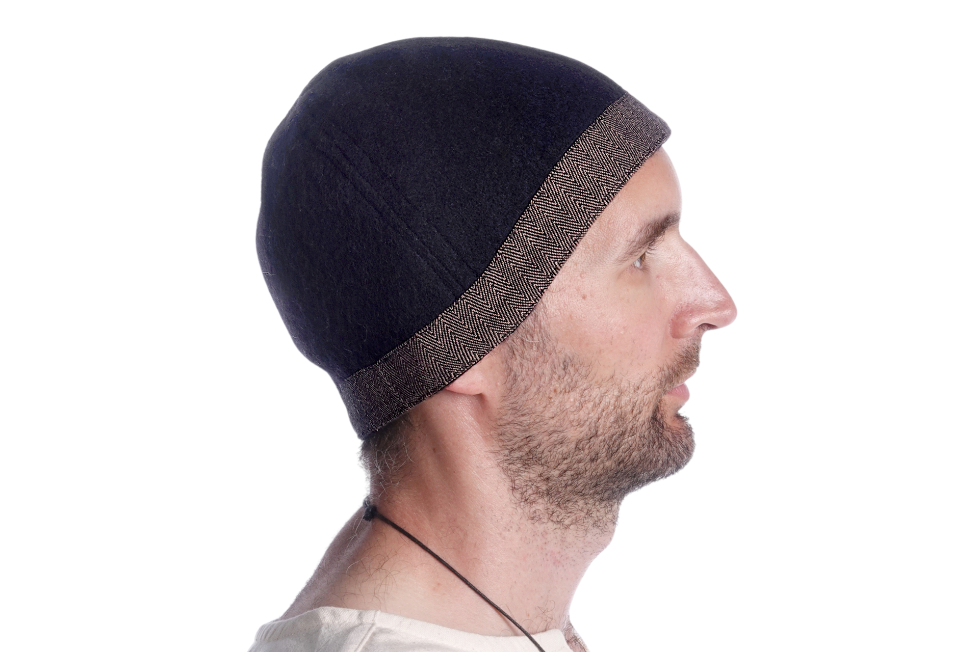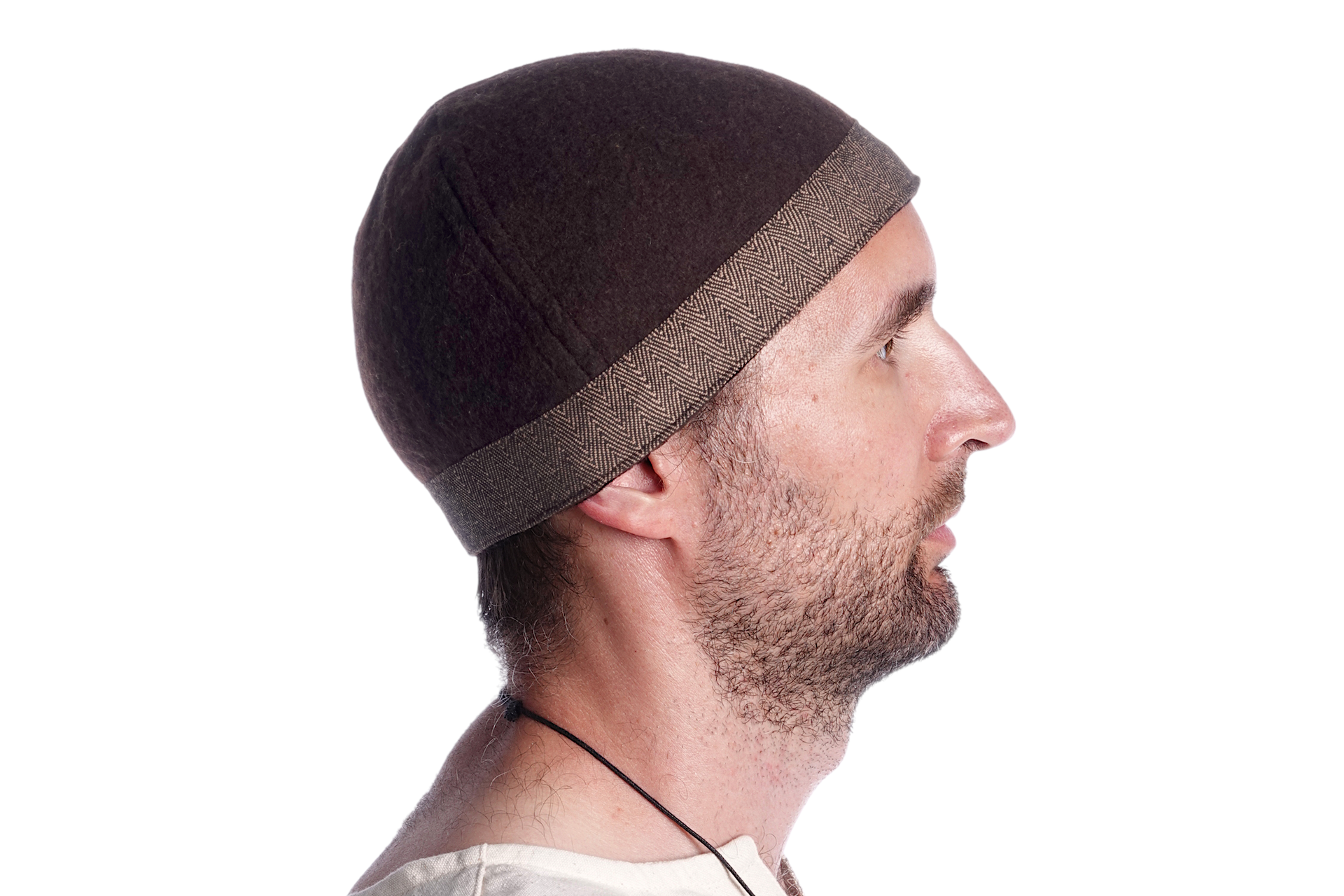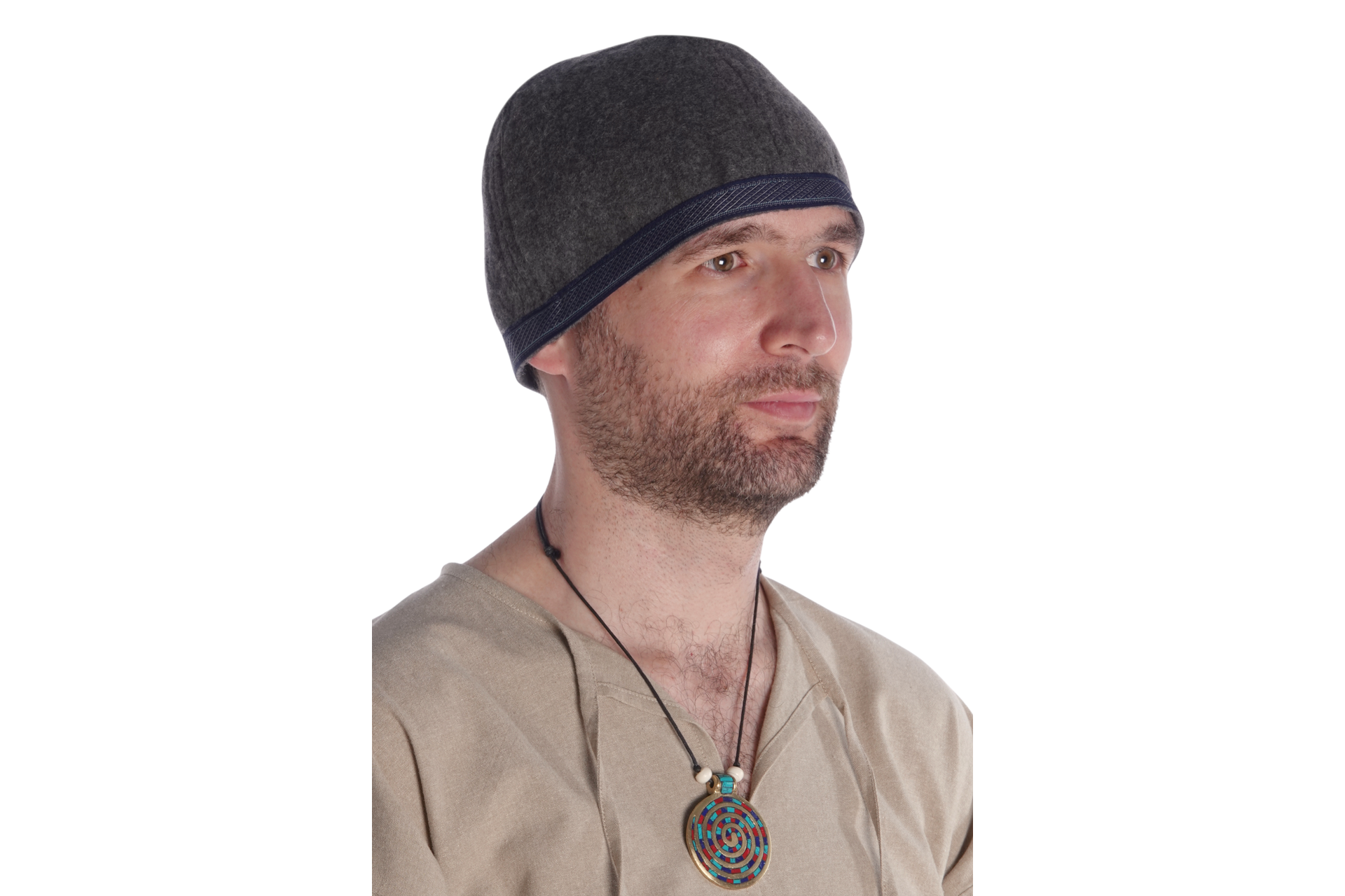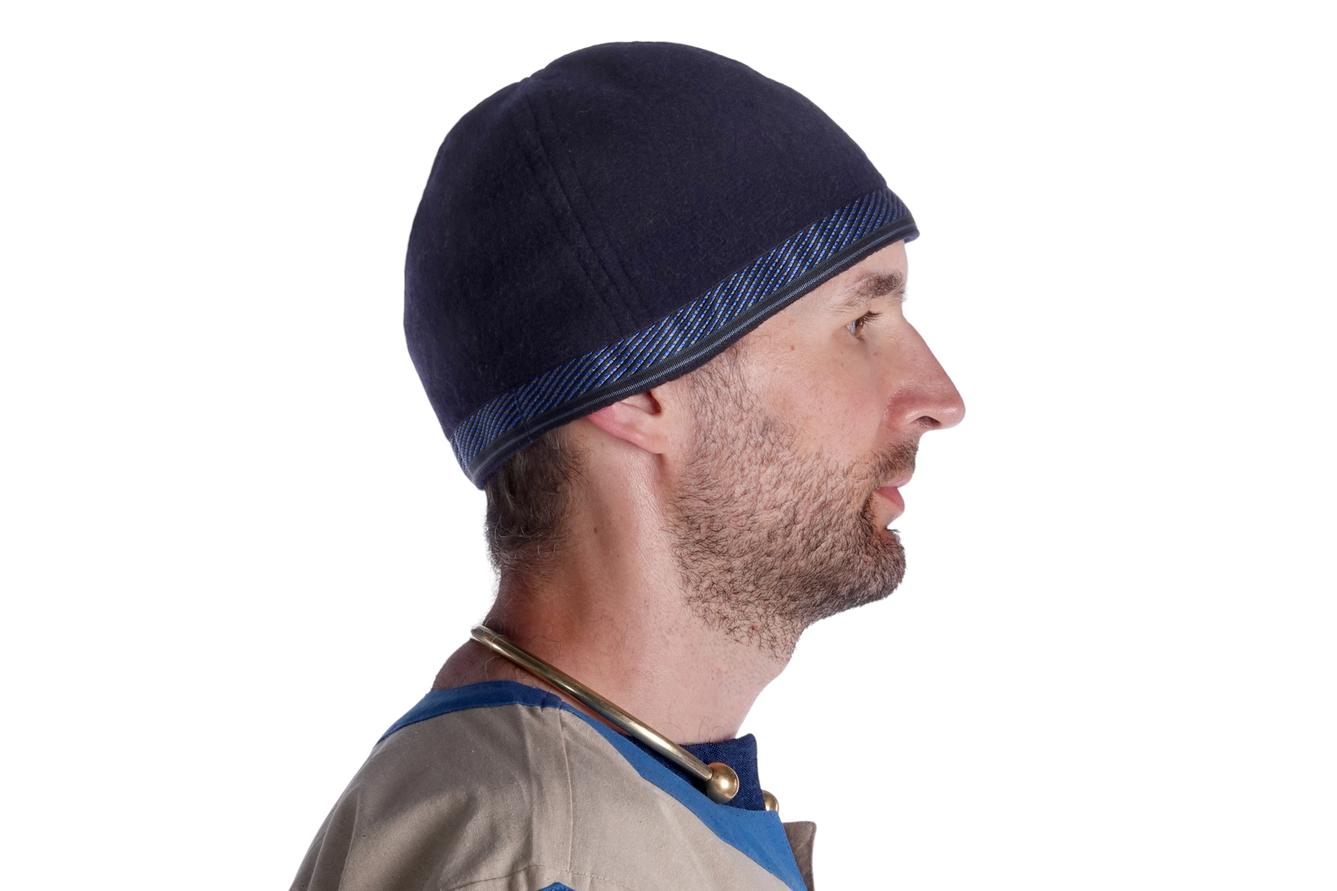 In der Fundstätte Birka lassen sich mehrere verschiedene Kopfbedeckungen der Männertracht der Wikinger nachweisen. Mützen, Hüte und Kappen waren fest verankert in der Herrenbekleidung der Wikinger. Eng anliegende Kappen wie die hier realisierte Kopfbedeckung findet man des Weiteren auf zahlreichen überlieferten Bildquellen des Wikingerkulturkreises, wie z.B. bei den Schnitzereien des Schiffsbegräbnis von Oseberg aus dem 9. Jahrhundert. Aufgrund der günstigen Konservierungsbedingungen für organische Materialien in Haithabu, war es möglich, dort auch Filz-Relikte sicherzustellen. Dies belegt, dass die Wikinger Wollfilz verwendeten, sogar gefärbter Filz wurde nachgewiesen. Es handelte sich auch um verschiedene Beschaffenheiten, was auf unterschiedliche Verwendungsweisen des Textils schließen lässt. Unter anderen entdeckten die Archäologen viele Zuschneidereste, deswegen wird angenommen, dass in Haithabu selbst Wollfilz produziert und weiterverarbeitet wurde.