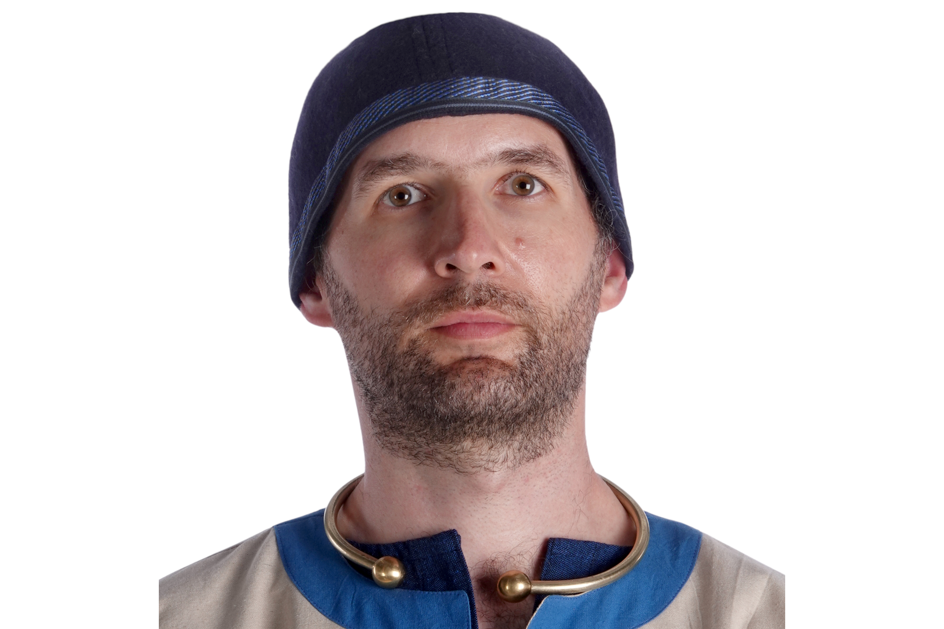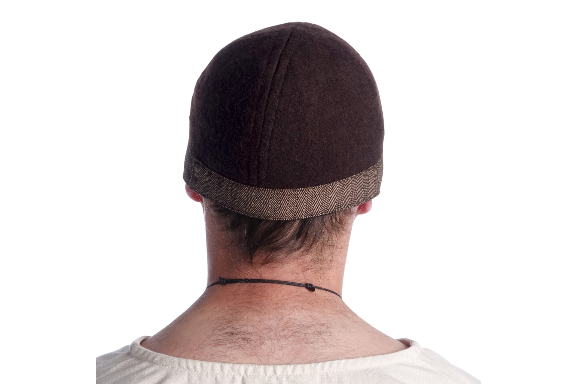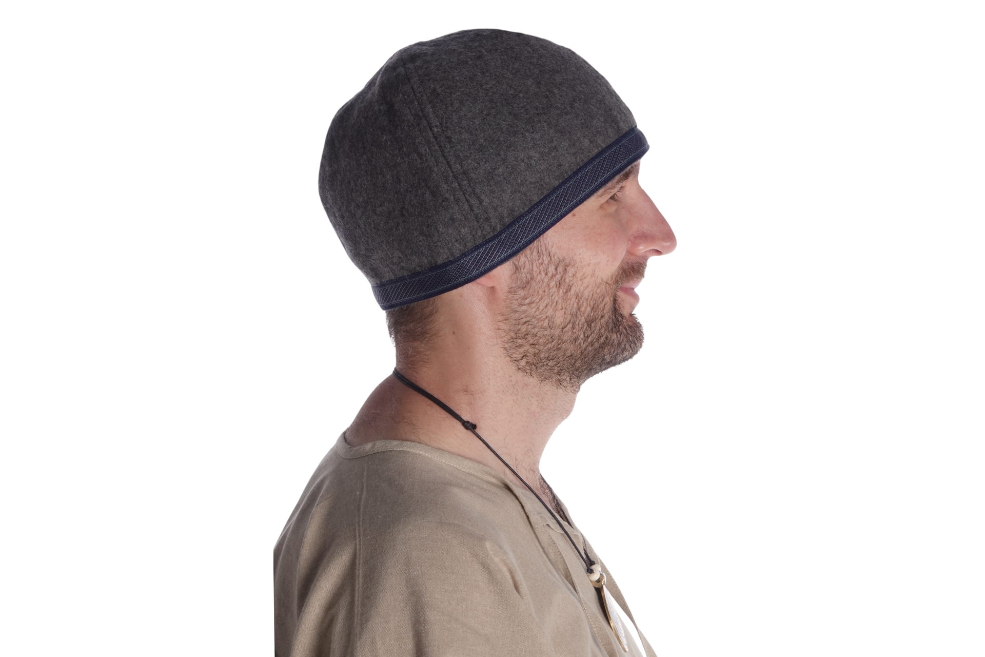 In der Fundstätte Birka lassen sich mehrere verschiedene Kopfbedeckungen der Männertracht der Wikinger nachweisen. Mützen, Hüte und Kappen waren fest verankert in der Herrenbekleidung der Wikinger. Eng anliegende Kappen wie die hier realisierte Kopfbedeckung findet man des Weiteren auf zahlreichen überlieferten Bildquellen des Wikingerkulturkreises, wie z.B. bei den Schnitzereien des Schiffsbegräbnis von Oseberg aus dem 9. Jahrhundert. Aufgrund der günstigen Konservierungsbedingungen für organische Materialien in Haithabu, war es möglich, dort auch Filz-Relikte sicherzustellen. Dies belegt, dass die Wikinger Wollfilz verwendeten, sogar gefärbter Filz wurde nachgewiesen. Es handelte sich auch um verschiedene Beschaffenheiten, was auf unterschiedliche Verwendungsweisen des Textils schließen lässt. Unter anderen entdeckten die Archäologen viele Zuschneidereste, deswegen wird angenommen, dass in Haithabu selbst Wollfilz produziert und weiterverarbeitet wurde.