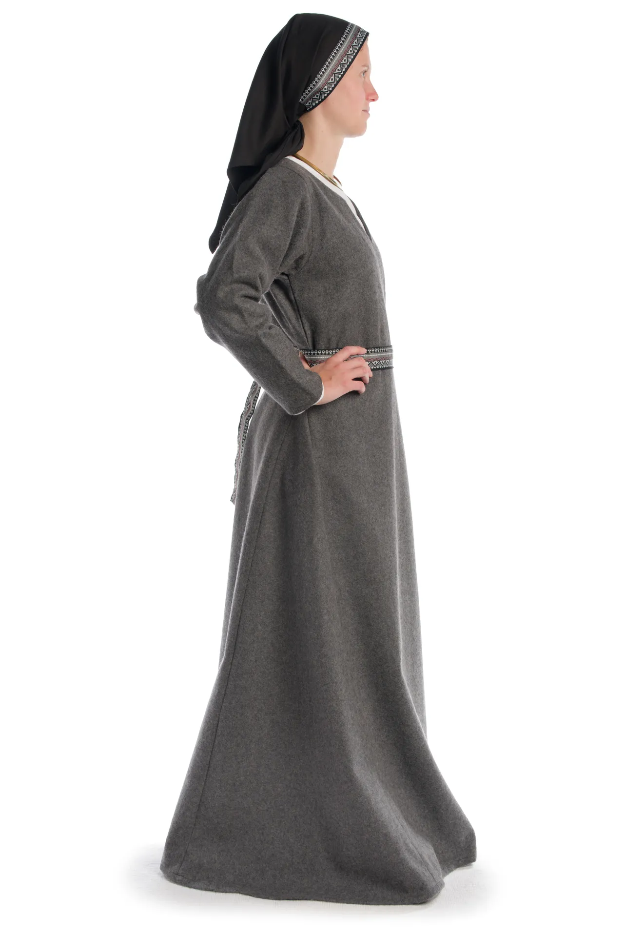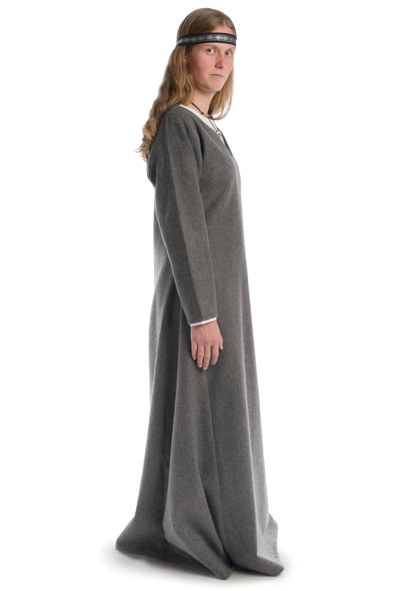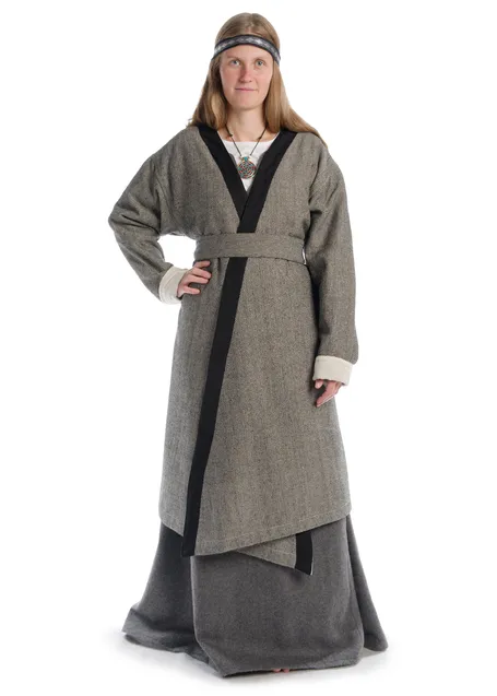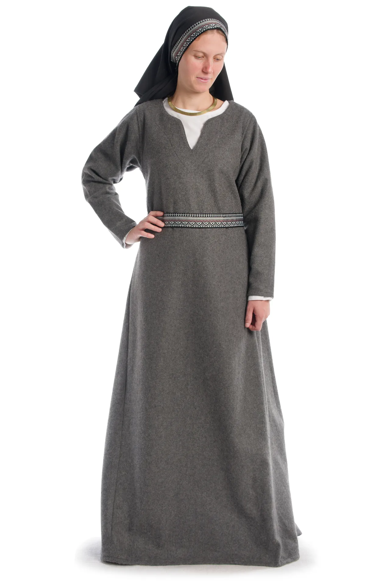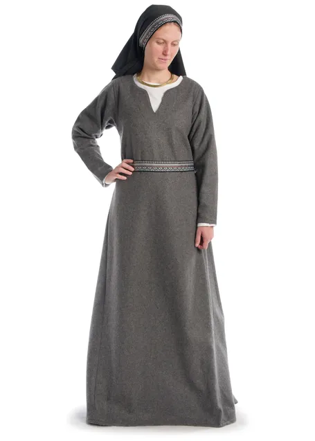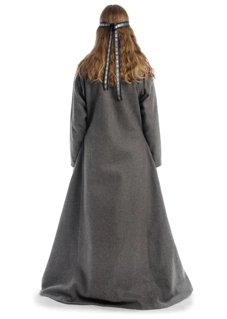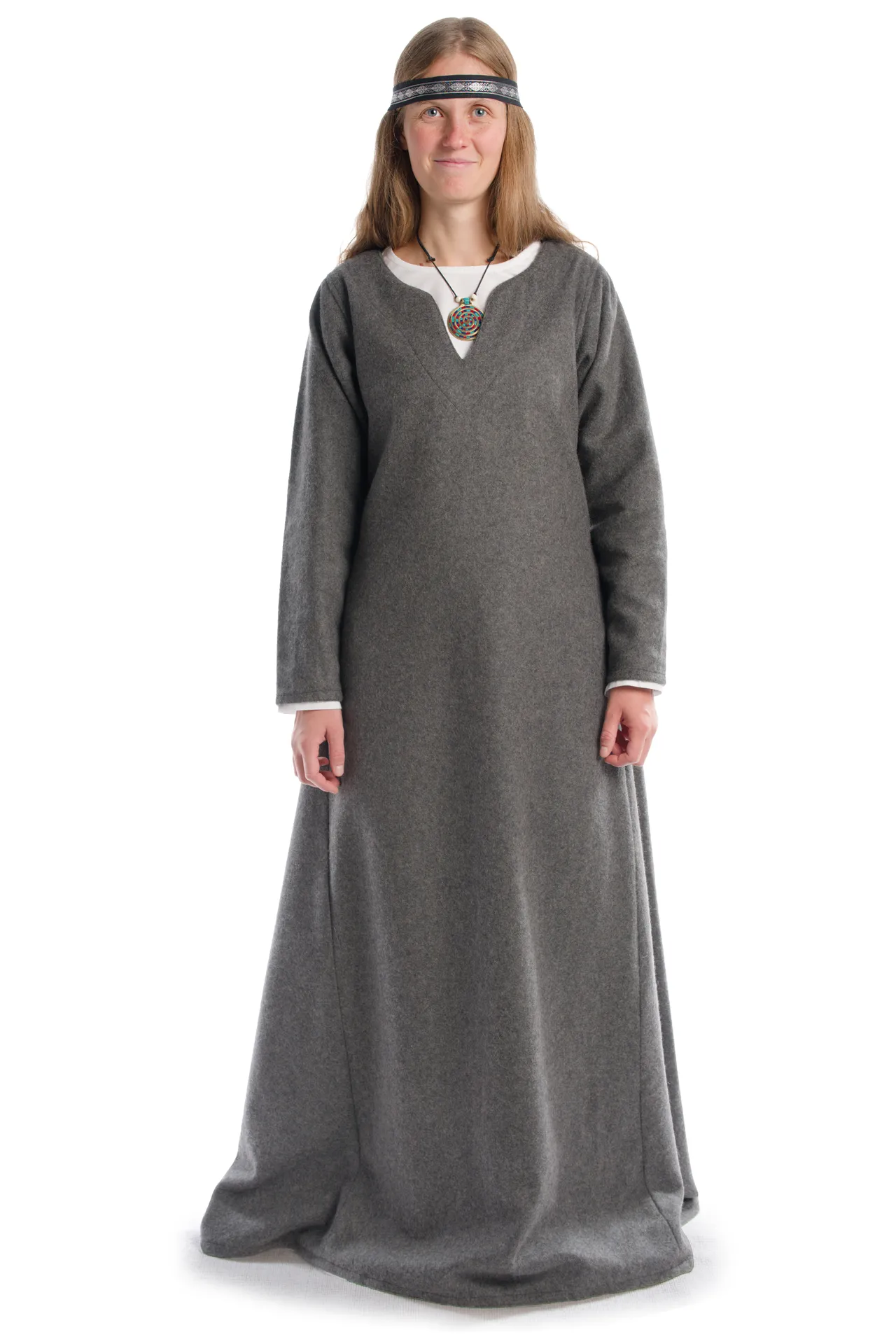 Bereits ab dem Frühmittelalter war die Damenbekleidung geprägt von knöchellangen Kleidern, deren großzügige Röcke in Falten fielen, wie auch hier umgesetzt. Des Weiteren war es fester Bestandteil der mittelalterlichen Tracht der Frauen, eine Cotte oder ein Unterkleid, wie „Hildr“, zu tragen. Über diesem Untergewand wurde stets ein Obergewand getragen – entweder ein Skapulier (der Überwurf) oder ein Surkot (das Überkleid). Das historische Unterkleid der Wikingerinnen war bodenlang und hatte oft auch Bliesen, wie beides hier realisiert. Natürlich kann das Baumwollkleid aber auch ohne Oberbekleidung als leichtes Sommer-, Freizeit- oder Hauskleid getragen werden. Dennoch eignet sich unser mittelalterliches Kleid „Hildr“ hervorragend als Grundlage für eine Wikingerin-Gewandung (ca. 750 bis 1050), wenn es mit unserem für die Damentracht der nordischen Volksstämme des Frühmittelalters typischen Überkleid „Surkot Skuld“ (aus Baumwolle oder Wollfilz verfügbar) kombiniert wird. Diese Kleider (Unterkleid „Hildr“ und Überkleid „Skuld“) wurden durch die Relikte der Handelsstädte Birka (8. – 10. Jahrhundert) und Haithabu (9. – 11. Jahrhundert) inspiriert.
