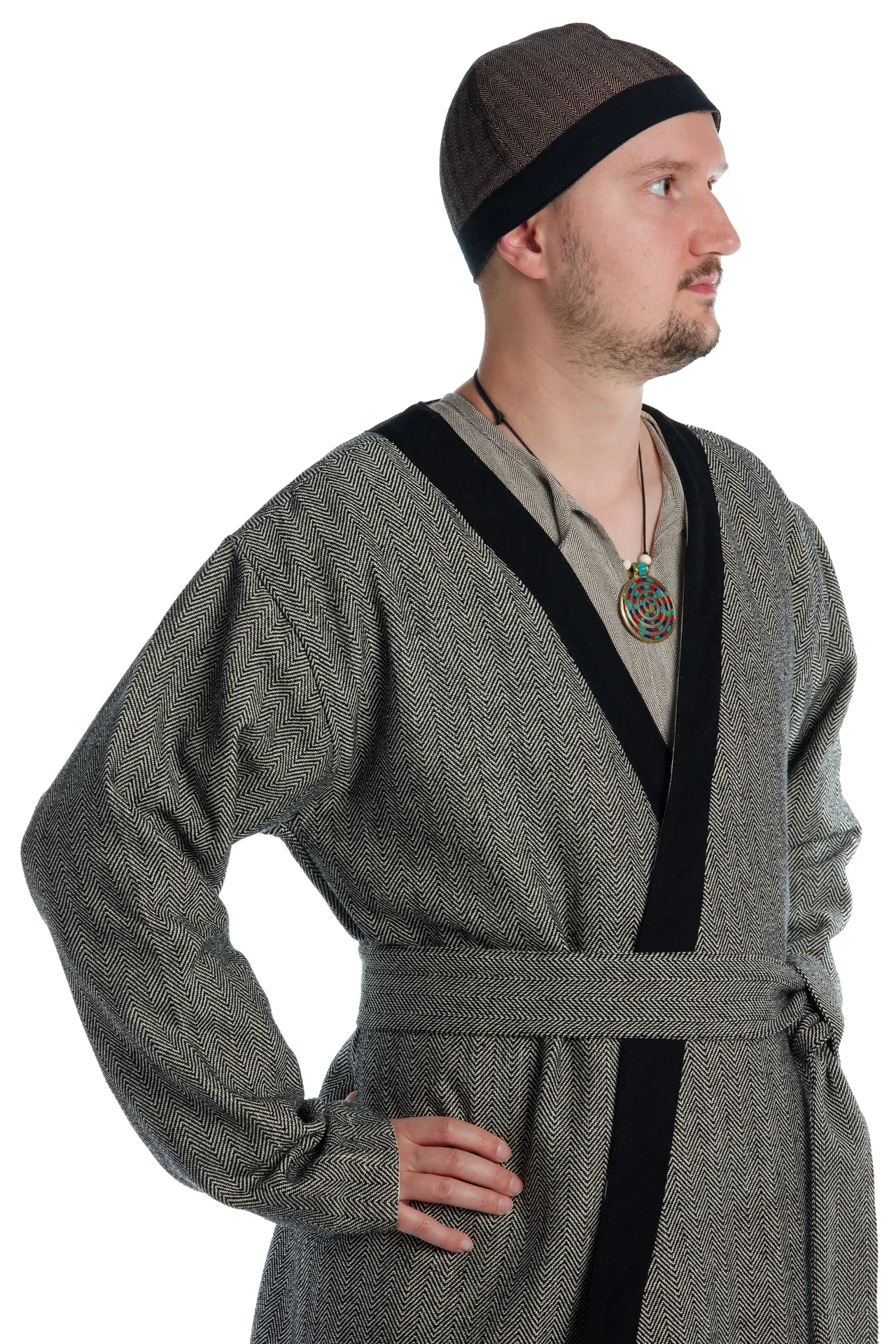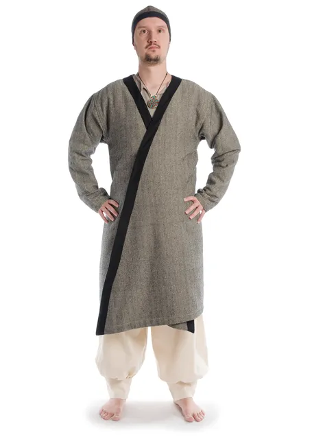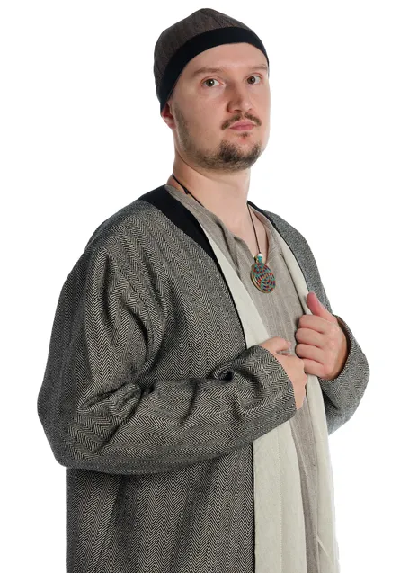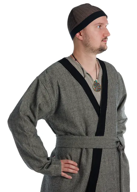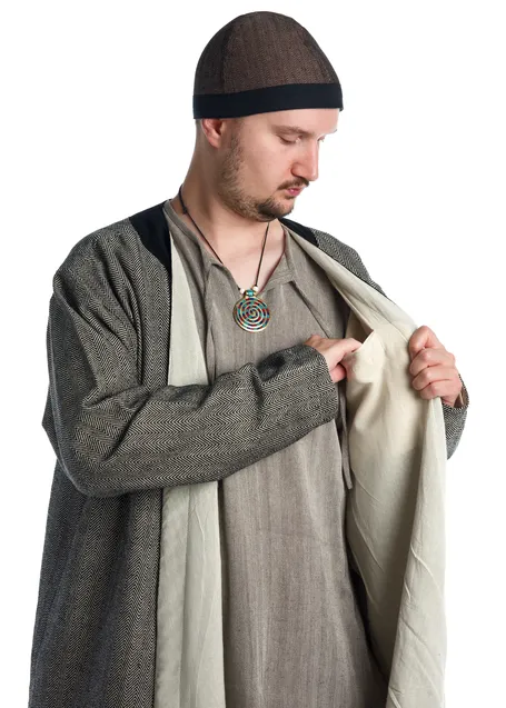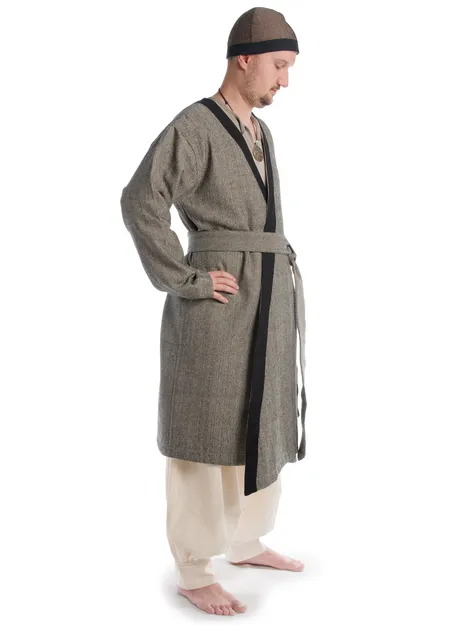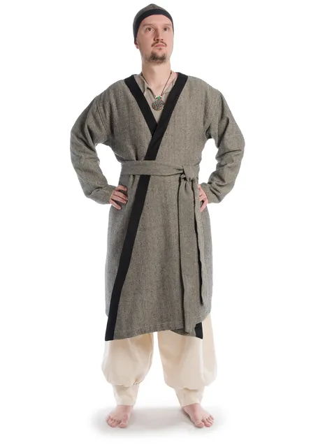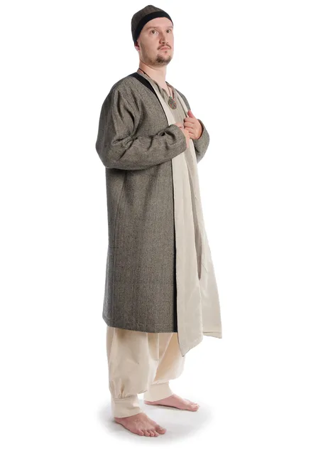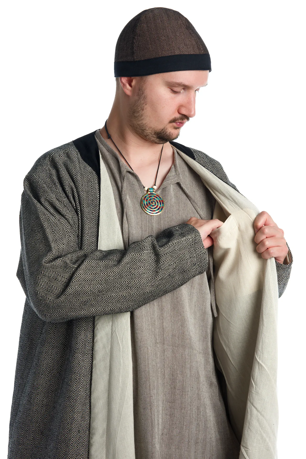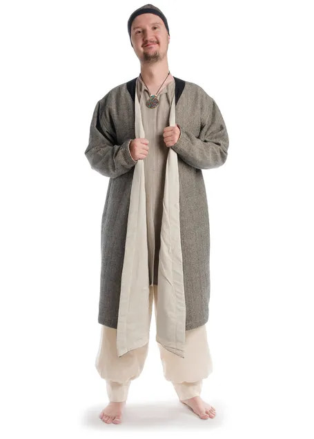 Unser mittelalterliches, mantelartiges Obergewand ist als Wikinger-Mantel konzipiert. „Vidar“ hat lange Ärmel, reicht bis zum Knie und ist frontal offen, wobei die Säume der Vorderseite entlang des Brust-und Halsausschnitt mit einer schwarzen Bordüre eingefasst sind. Falls der Mantel mit Gürtel oder Schnur getragen wird, ergibt sich ein V-förmiger Halsausschnitt. Das Innenfutter aus Baumwolle ist etwas heller als das Obermaterial aus ebenfalls reiner Baumwolle im Fischgrätmuster.