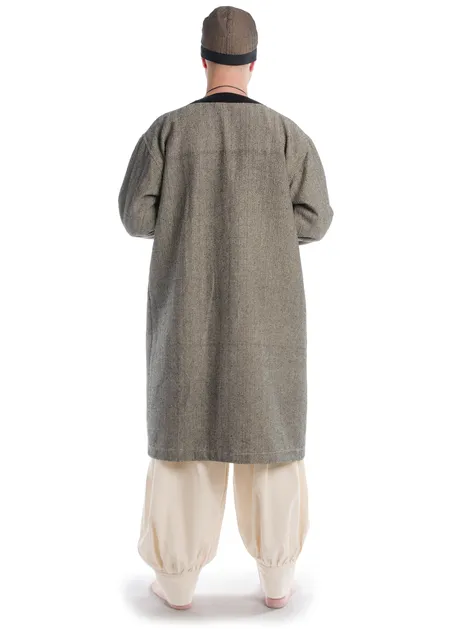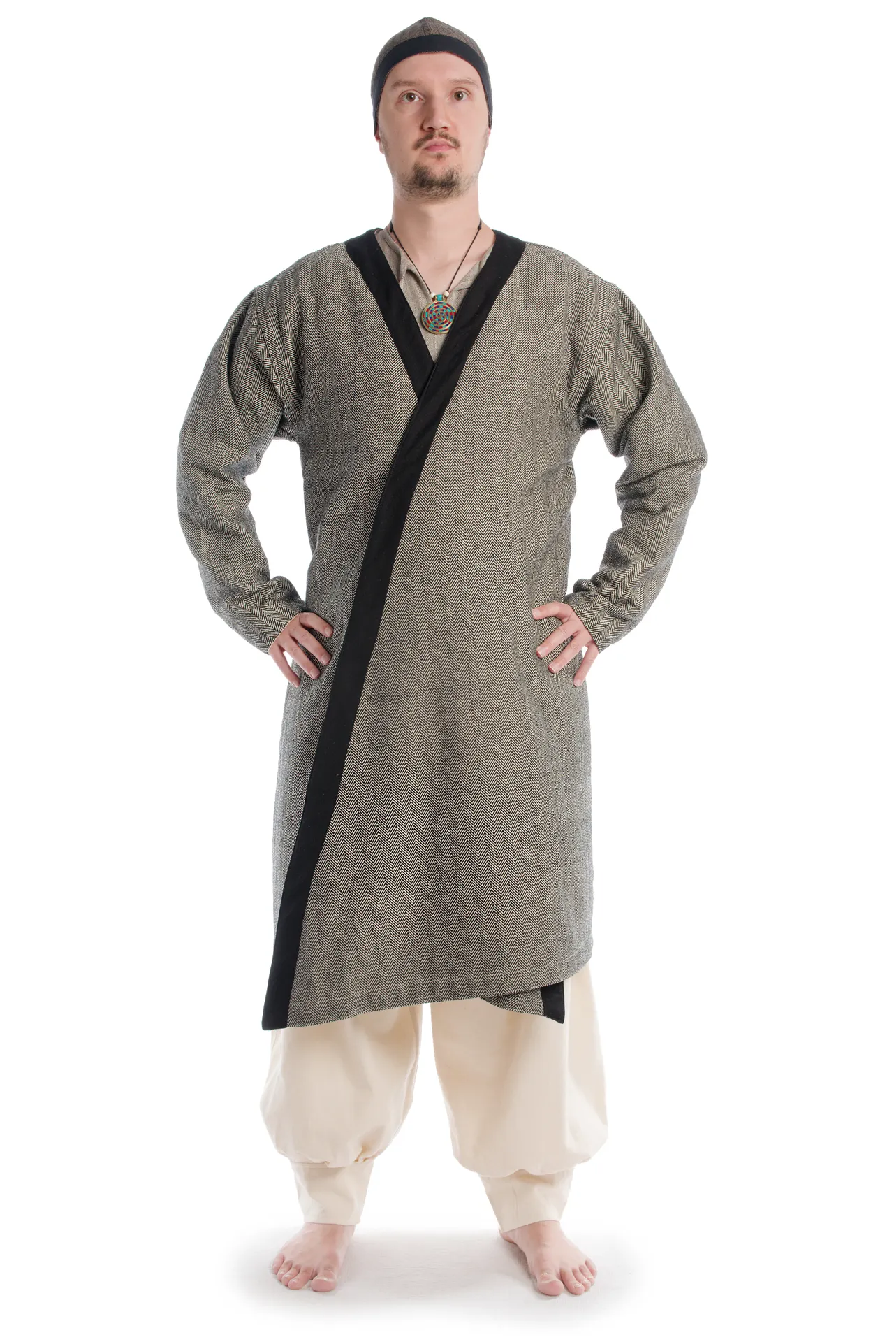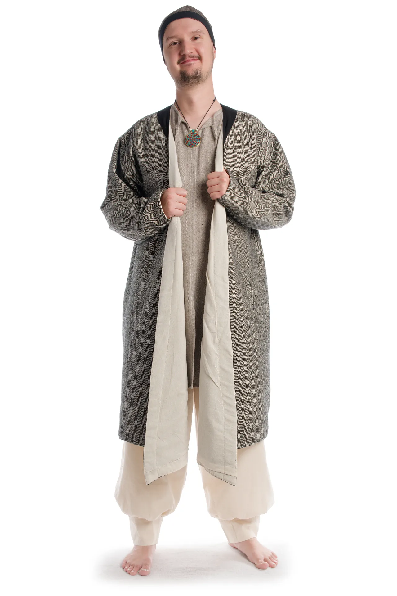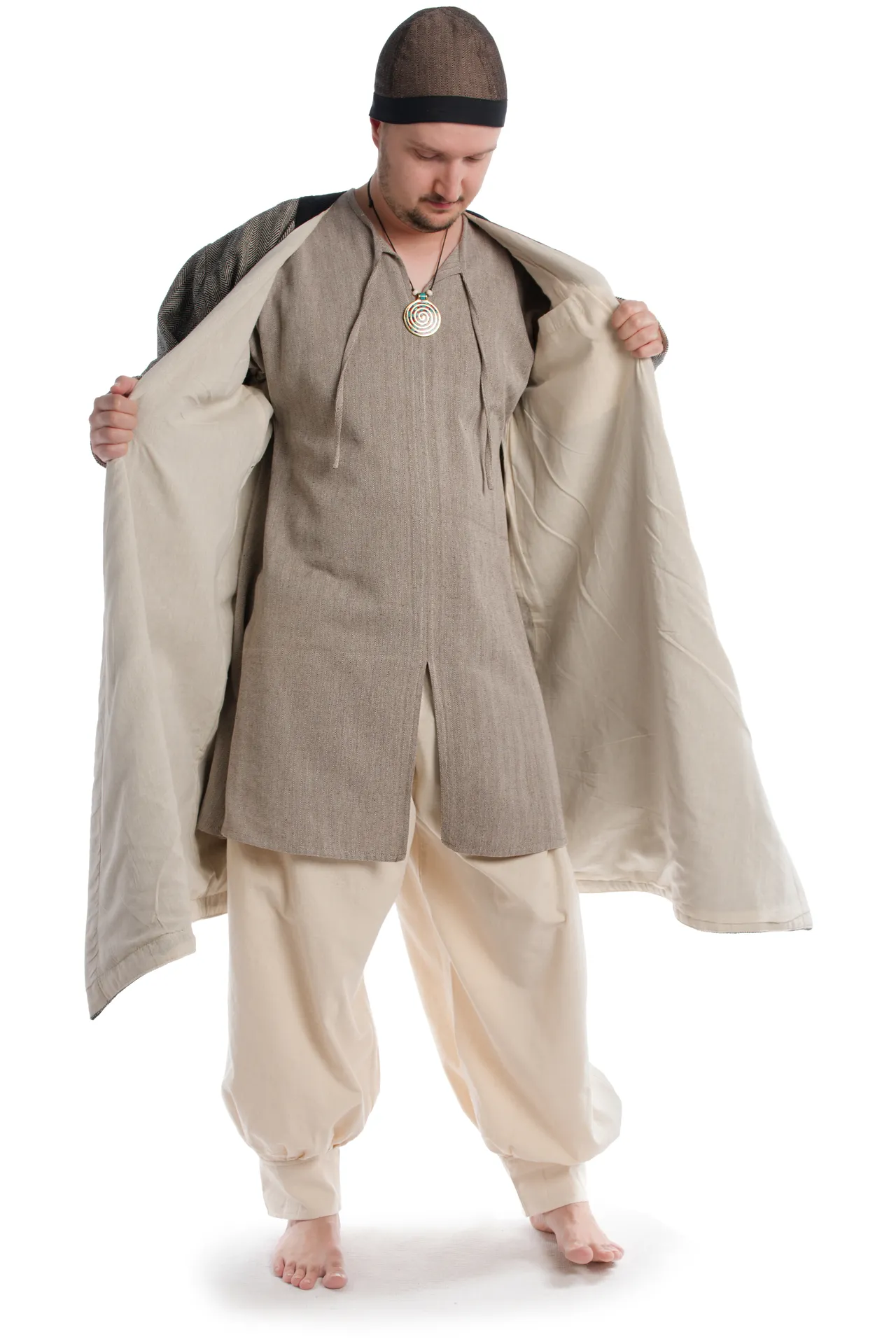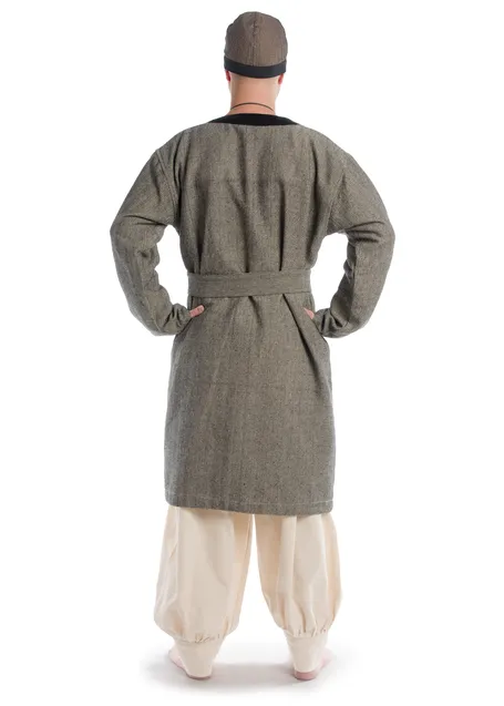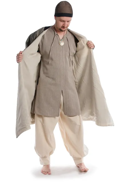 Unser mittelalterliches, mantelartiges Obergewand ist als Wikinger-Mantel konzipiert. „Vidar“ hat lange Ärmel, reicht bis zum Knie und ist frontal offen, wobei die Säume der Vorderseite entlang des Brust-und Halsausschnitt mit einer schwarzen Bordüre eingefasst sind. Falls der Mantel mit Gürtel oder Schnur getragen wird, ergibt sich ein V-förmiger Halsausschnitt. Das Innenfutter aus Baumwolle ist etwas heller als das Obermaterial aus ebenfalls reiner Baumwolle im Fischgrätmuster.