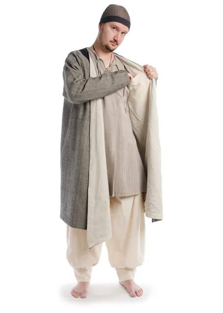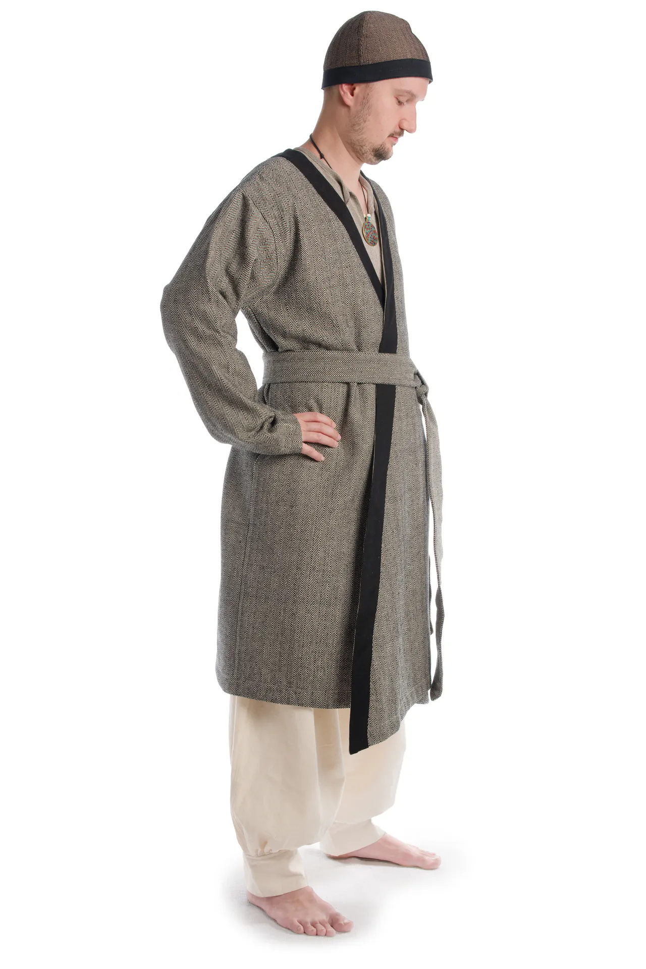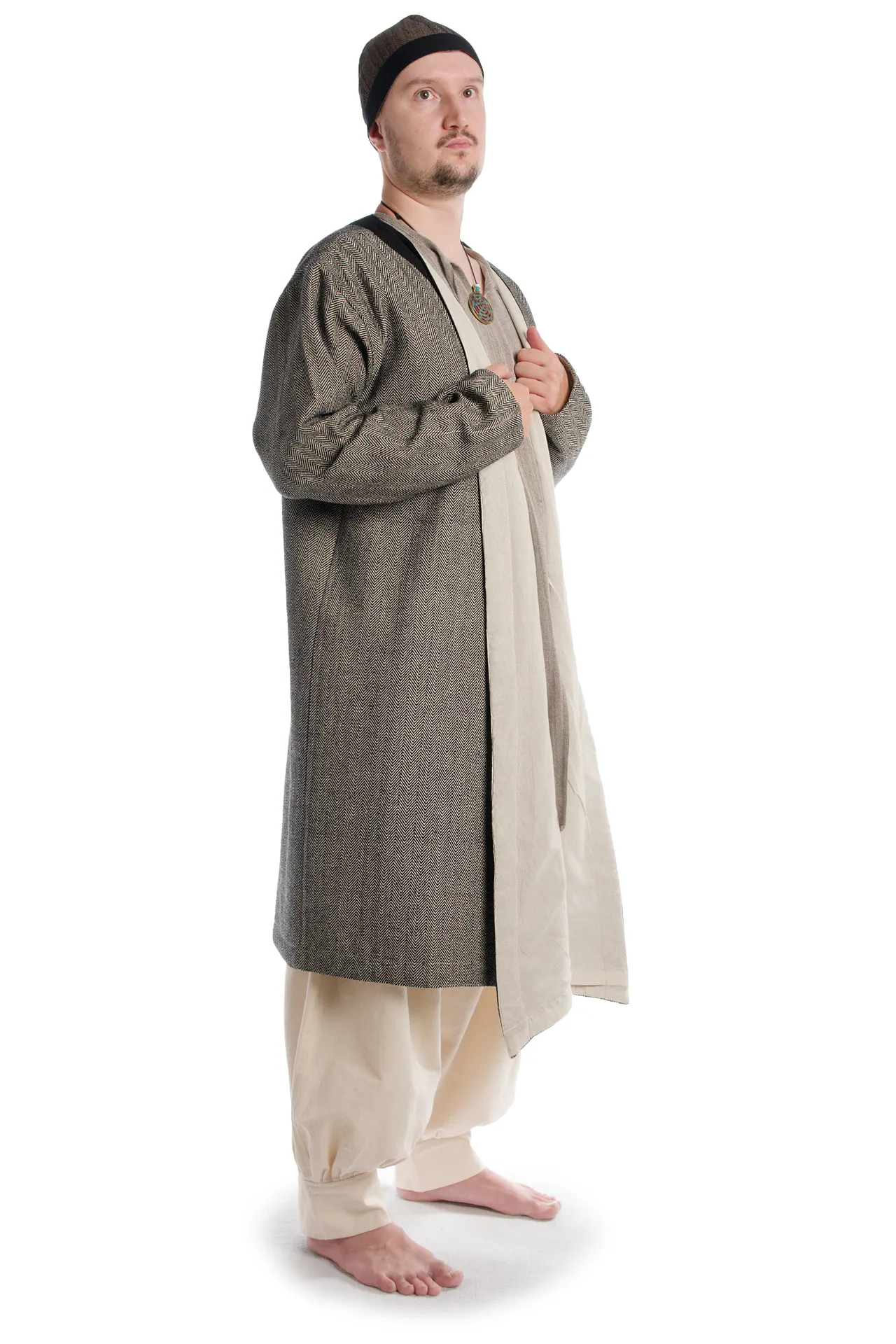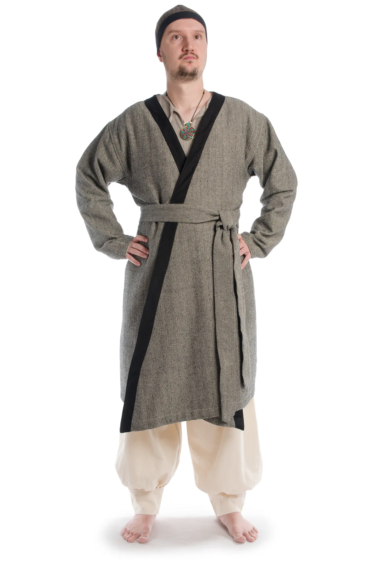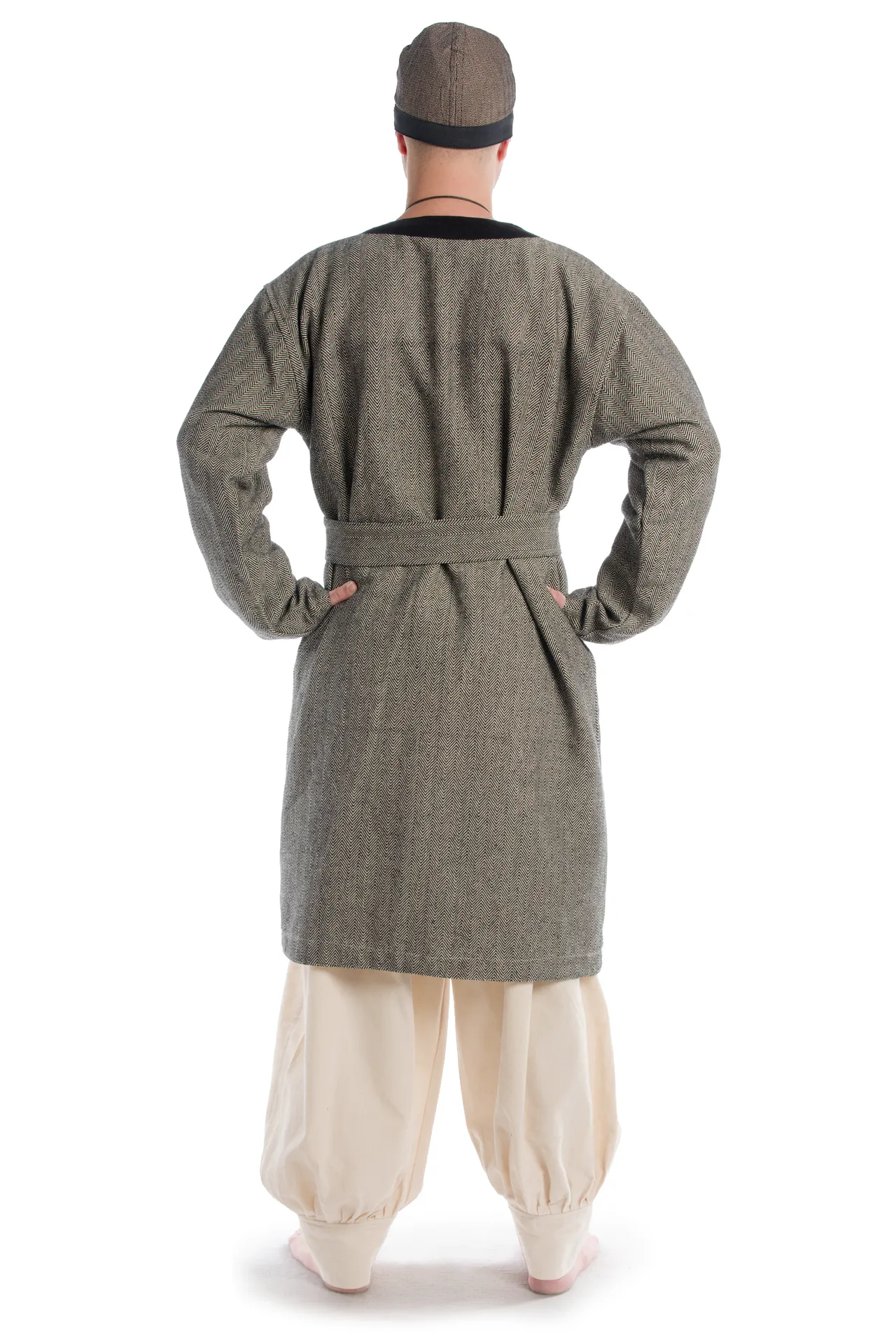 Unser mittelalterliches, mantelartiges Obergewand ist als Wikinger-Mantel konzipiert. „Vidar“ hat lange Ärmel, reicht bis zum Knie und ist frontal offen, wobei die Säume der Vorderseite entlang des Brust-und Halsausschnitt mit einer schwarzen Bordüre eingefasst sind. Falls der Mantel mit Gürtel oder Schnur getragen wird, ergibt sich ein V-förmiger Halsausschnitt. Das Innenfutter aus Baumwolle ist etwas heller als das Obermaterial aus ebenfalls reiner Baumwolle im Fischgrätmuster.