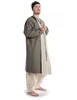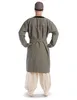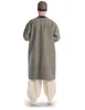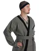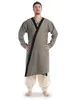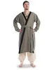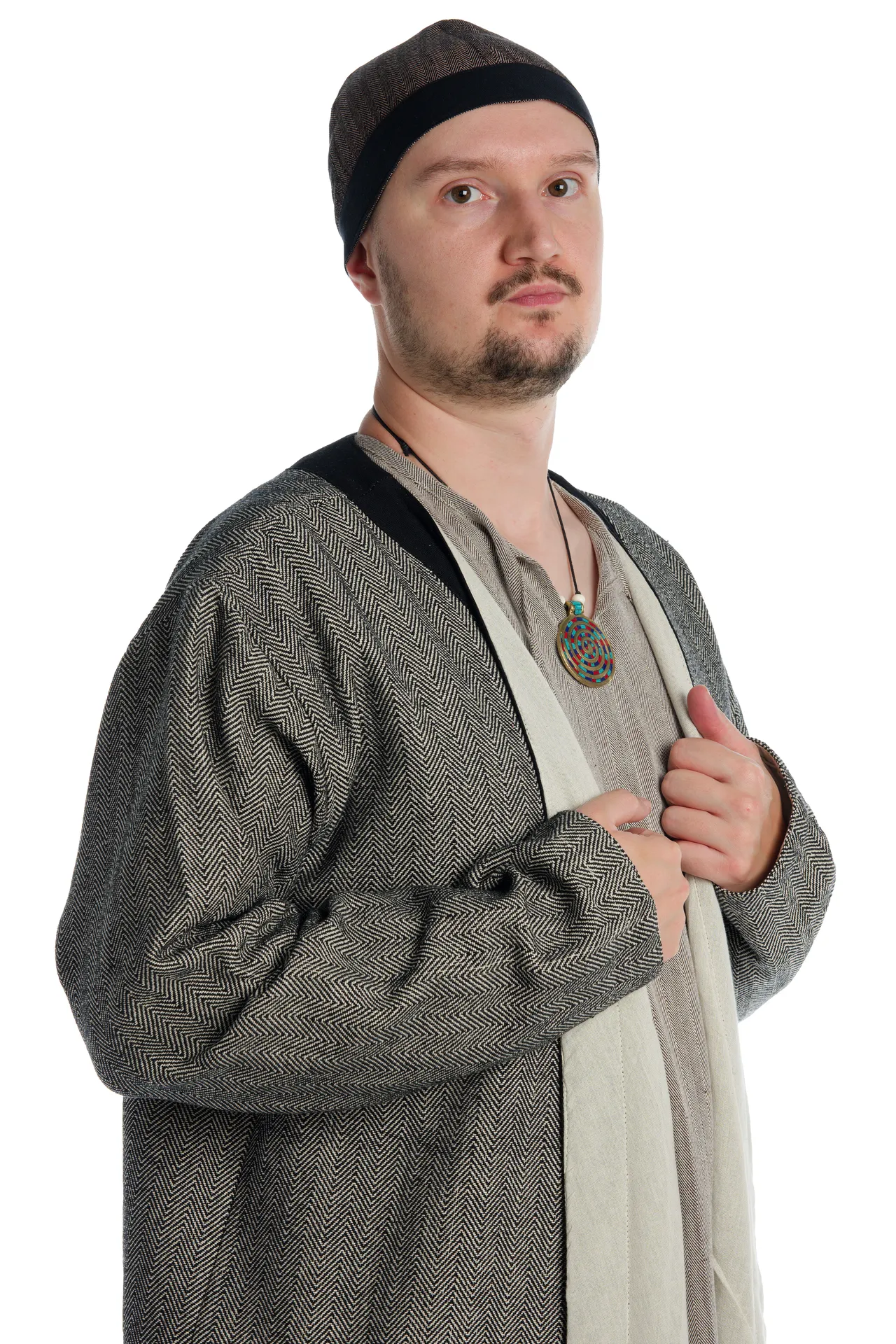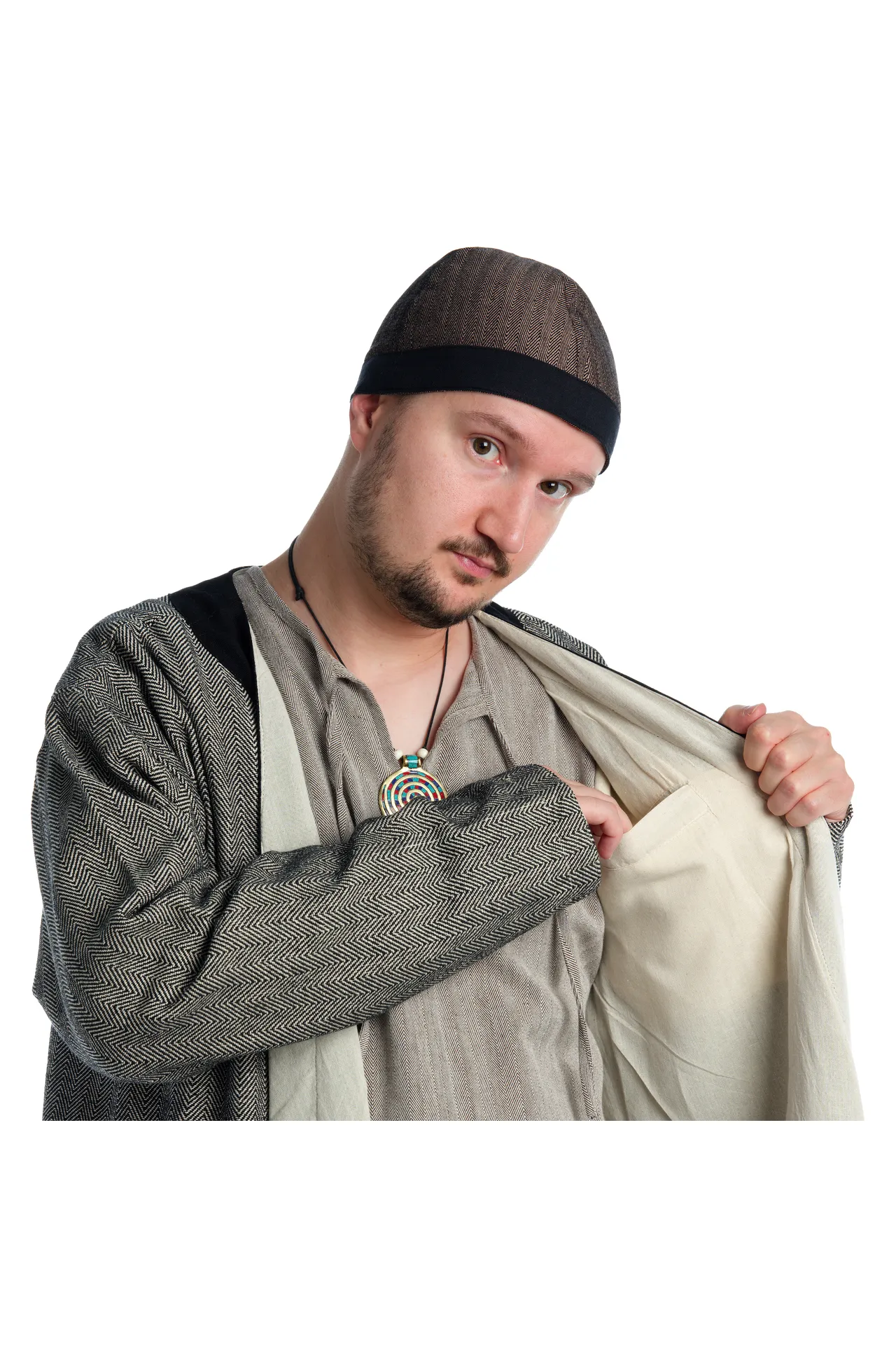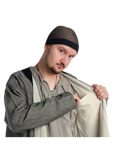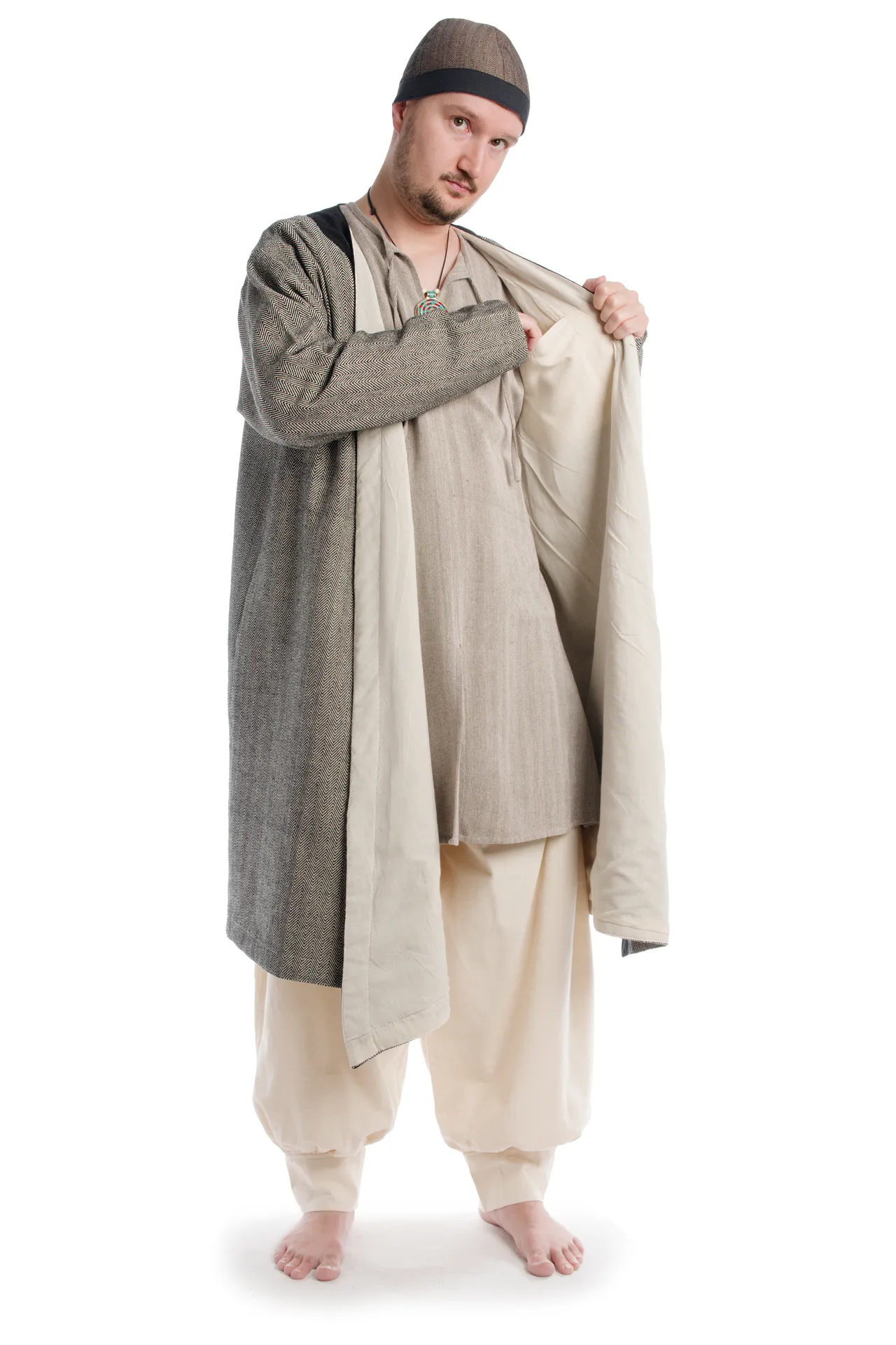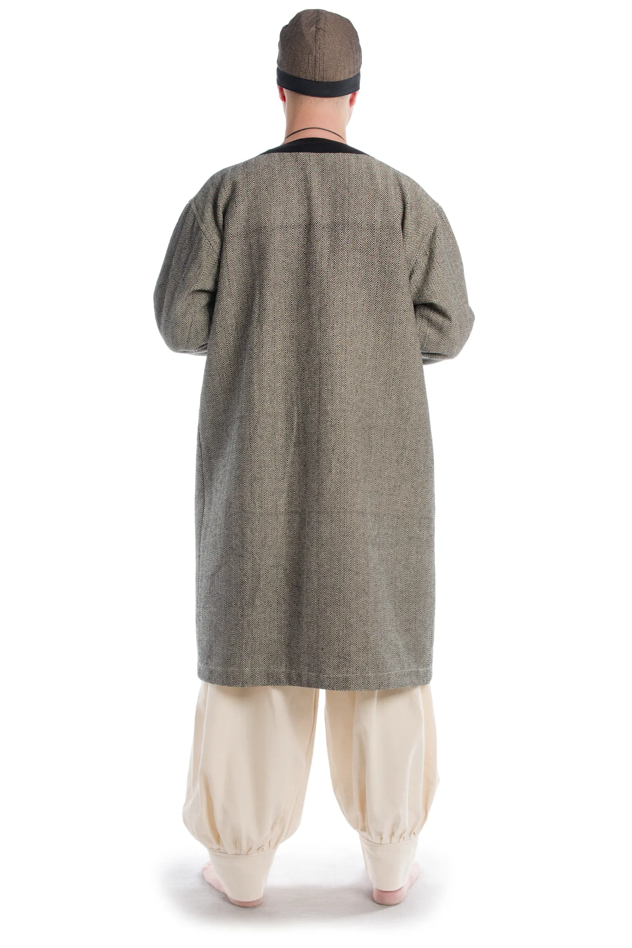 Unser mittelalterliches, mantelartiges Obergewand ist als Wikinger-Mantel konzipiert. „Vidar“ hat lange Ärmel, reicht bis zum Knie und ist frontal offen, wobei die Säume der Vorderseite entlang des Brust-und Halsausschnitt mit einer schwarzen Bordüre eingefasst sind. Falls der Mantel mit Gürtel oder Schnur getragen wird, ergibt sich ein V-förmiger Halsausschnitt. Das Innenfutter aus Baumwolle ist etwas heller als das Obermaterial aus ebenfalls reiner Baumwolle im Fischgrätmuster.