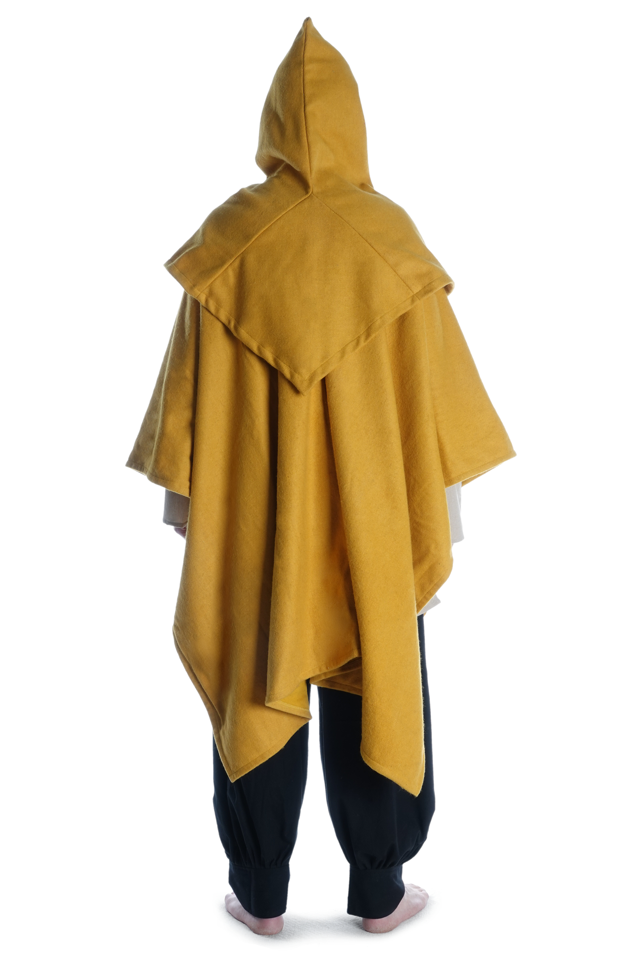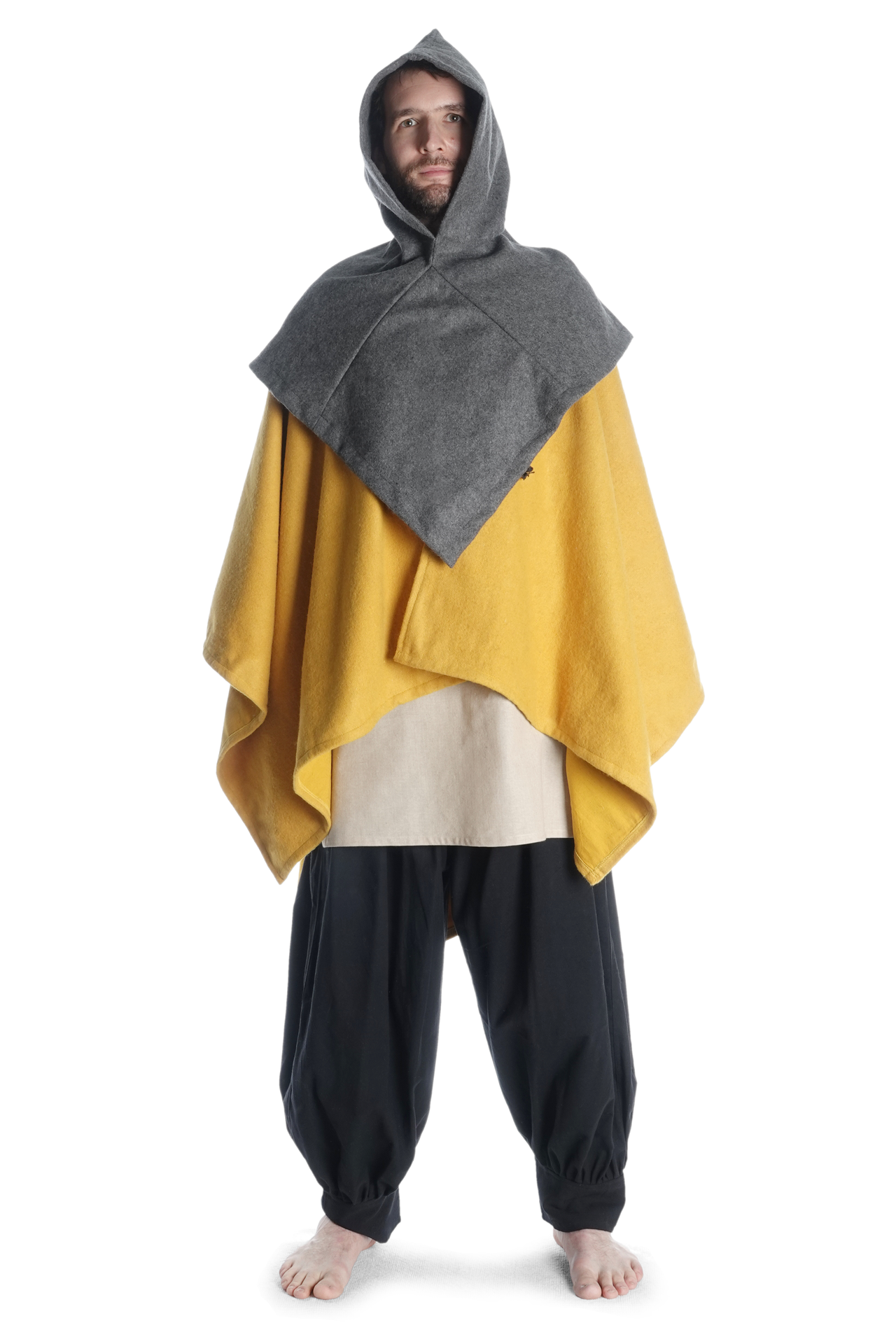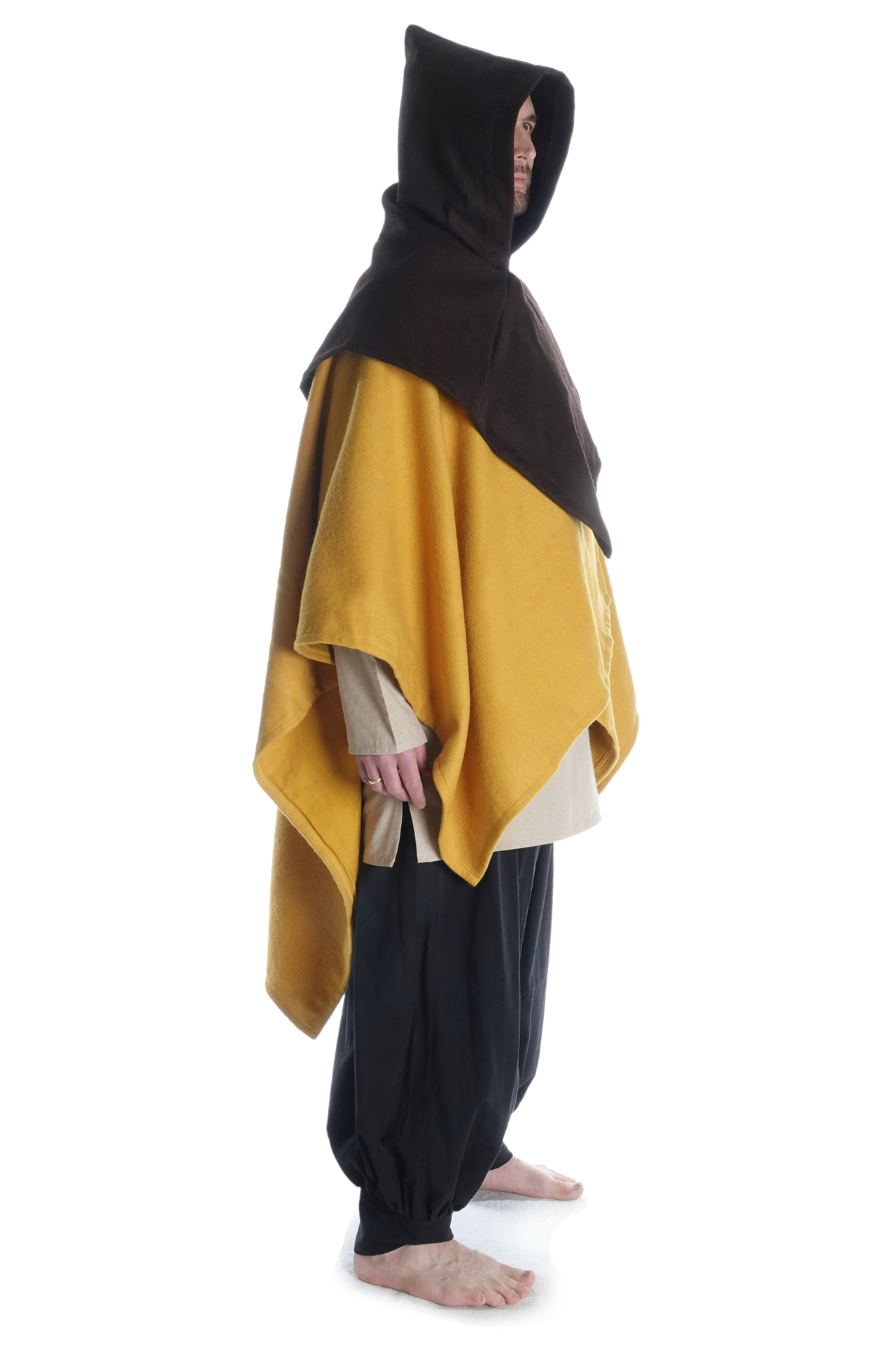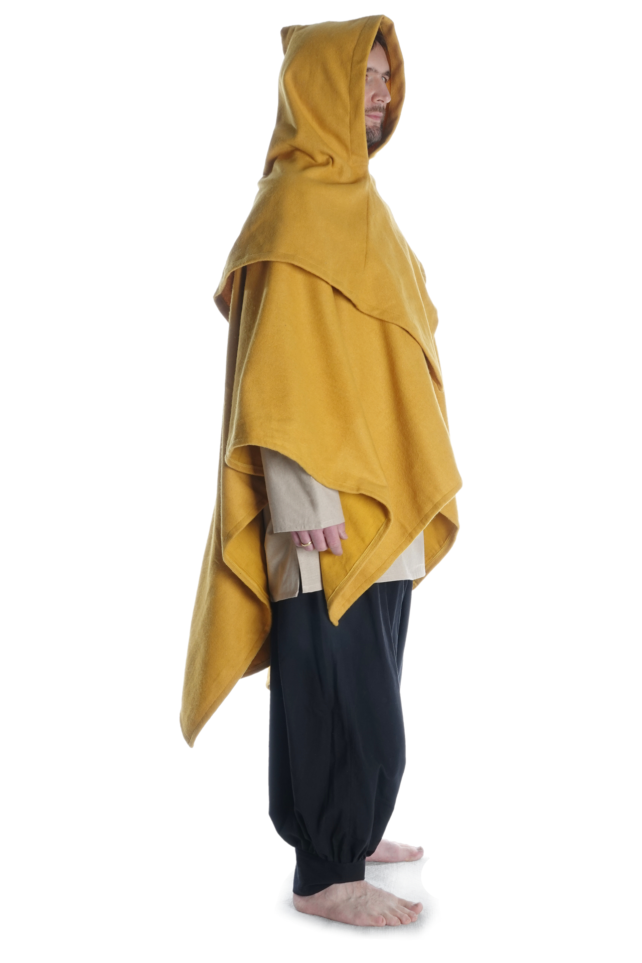 Unsere Kapuze „Limme“ hat eine großzügig geschnittene, runde Schulterpartie. Da sie geschlossen ist, ist diese Kopfbedeckung durch Hineinschlüpfen anzuziehen, was aber durch die Weite der Kapuze keinesfalls unkomfortabel ist. Das pelerinenhafte Schulterkleid geht in eine kurze Kragenpartie über, die eine optimale Passform des mittelalterlichen Kleidungsstücks gewährleisten. Des Weiteren geht der Kragen über in eine weite Kapuze, die in einem spitzen Zipfel ausläuft. Die Kapuze ist so geschnitten, dass sie bequem in die Stirn gezogen werden kann.