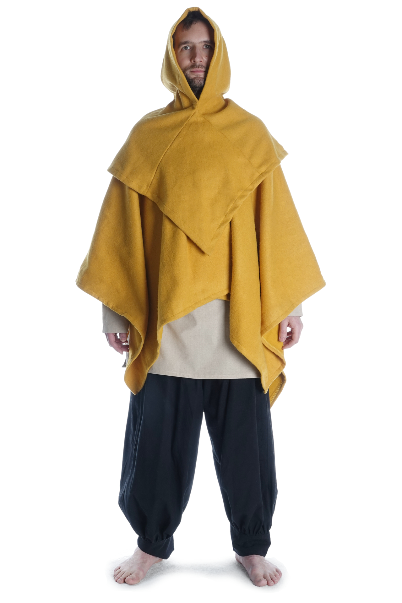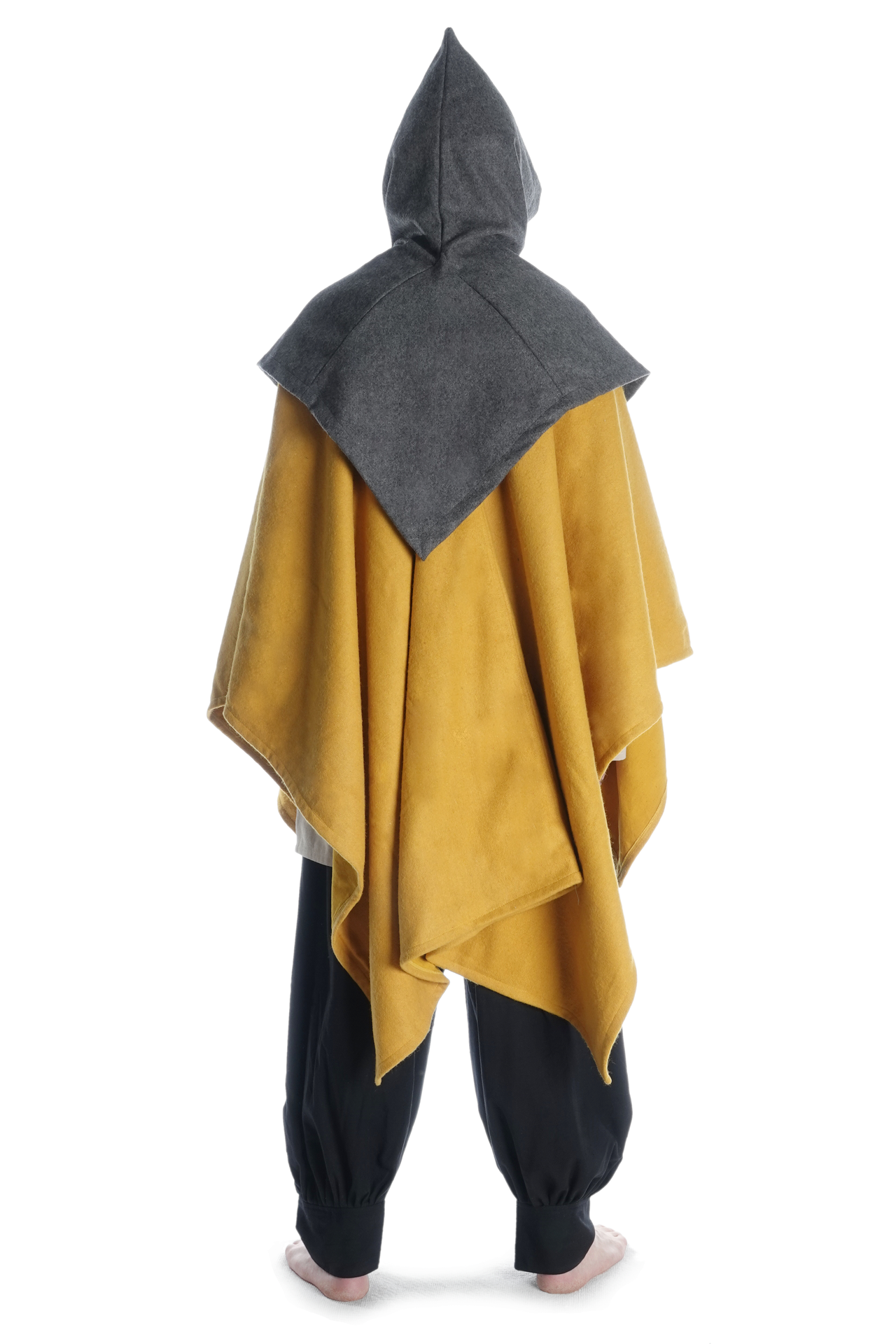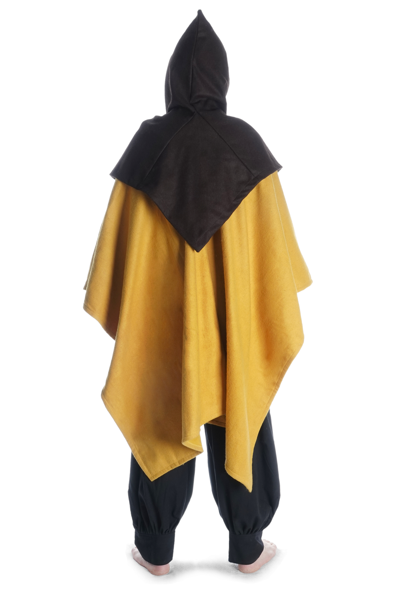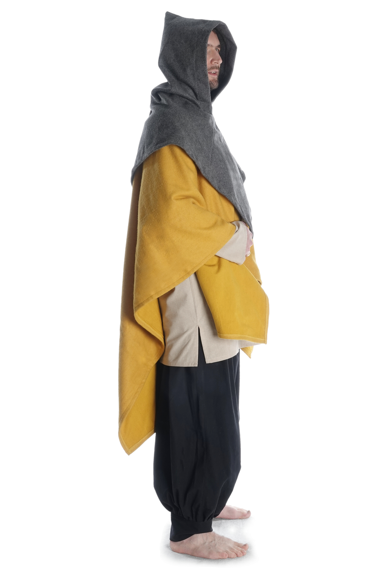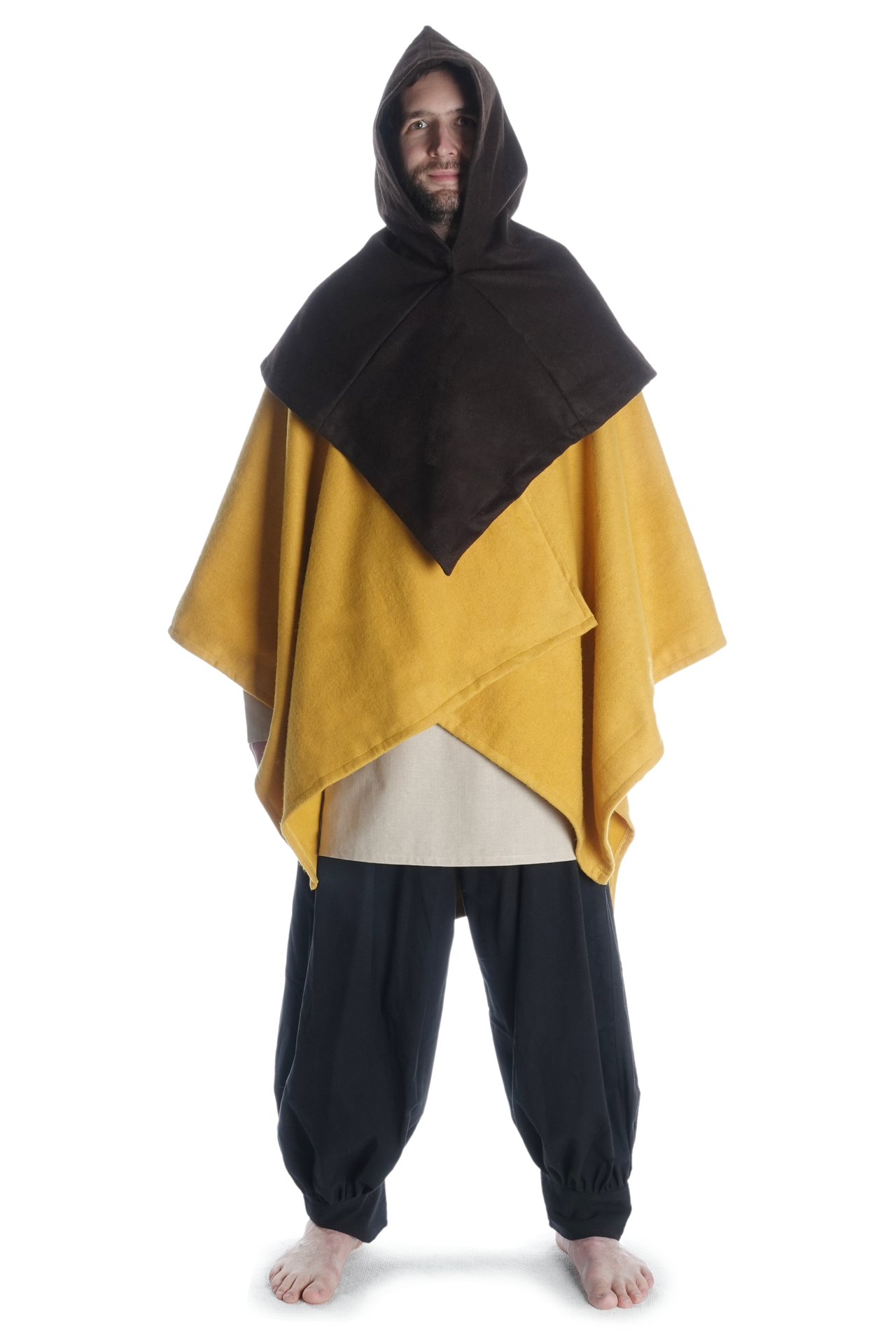 Unsere Kapuze „Limme“ hat eine großzügig geschnittene, runde Schulterpartie. Da sie geschlossen ist, ist diese Kopfbedeckung durch Hineinschlüpfen anzuziehen, was aber durch die Weite der Kapuze keinesfalls unkomfortabel ist. Das pelerinenhafte Schulterkleid geht in eine kurze Kragenpartie über, die eine optimale Passform des mittelalterlichen Kleidungsstücks gewährleisten. Des Weiteren geht der Kragen über in eine weite Kapuze, die in einem spitzen Zipfel ausläuft. Die Kapuze ist so geschnitten, dass sie bequem in die Stirn gezogen werden kann.