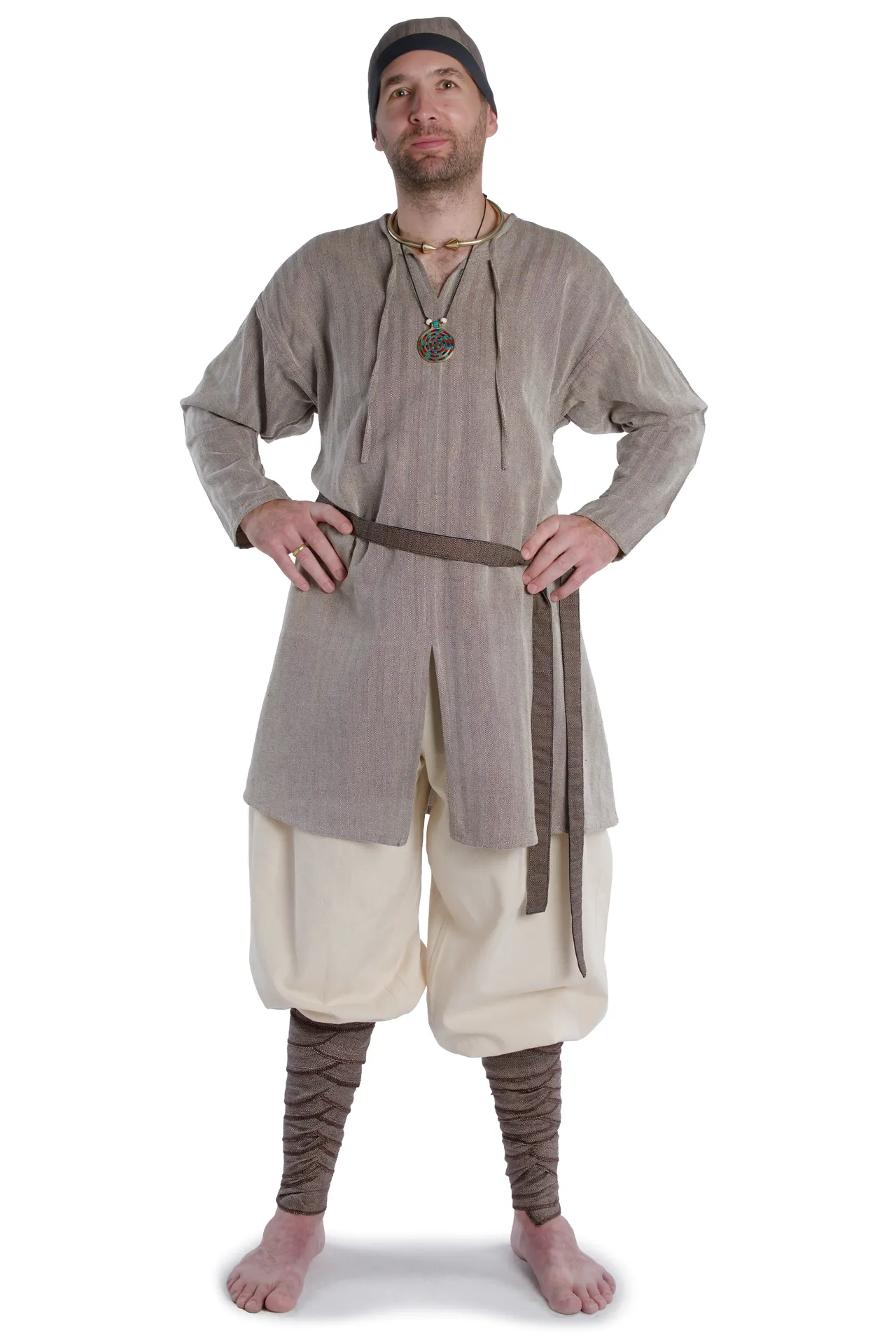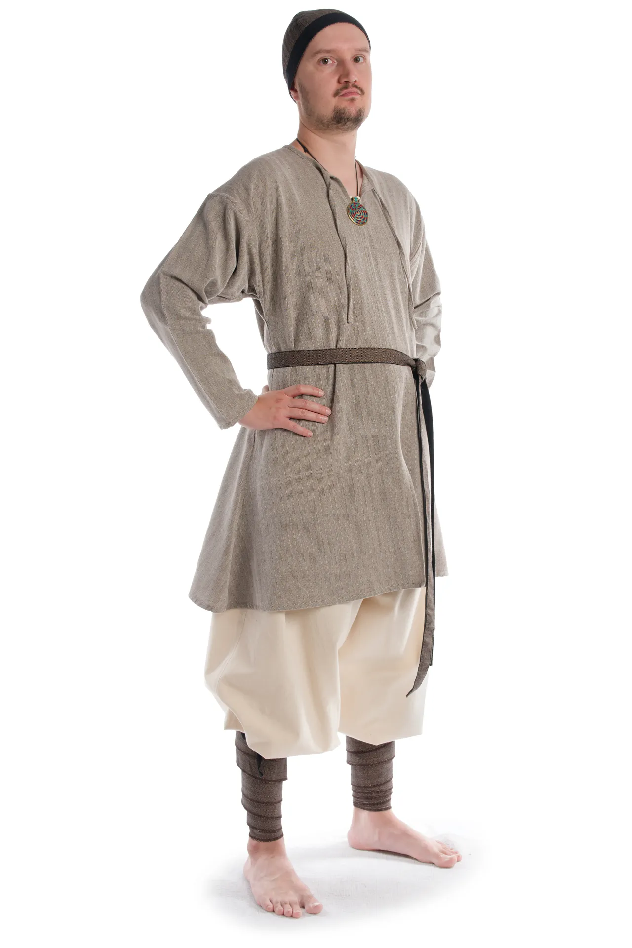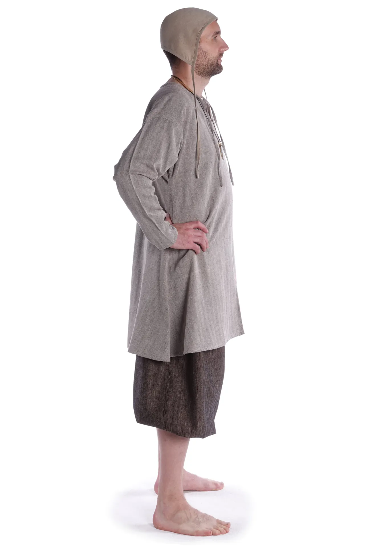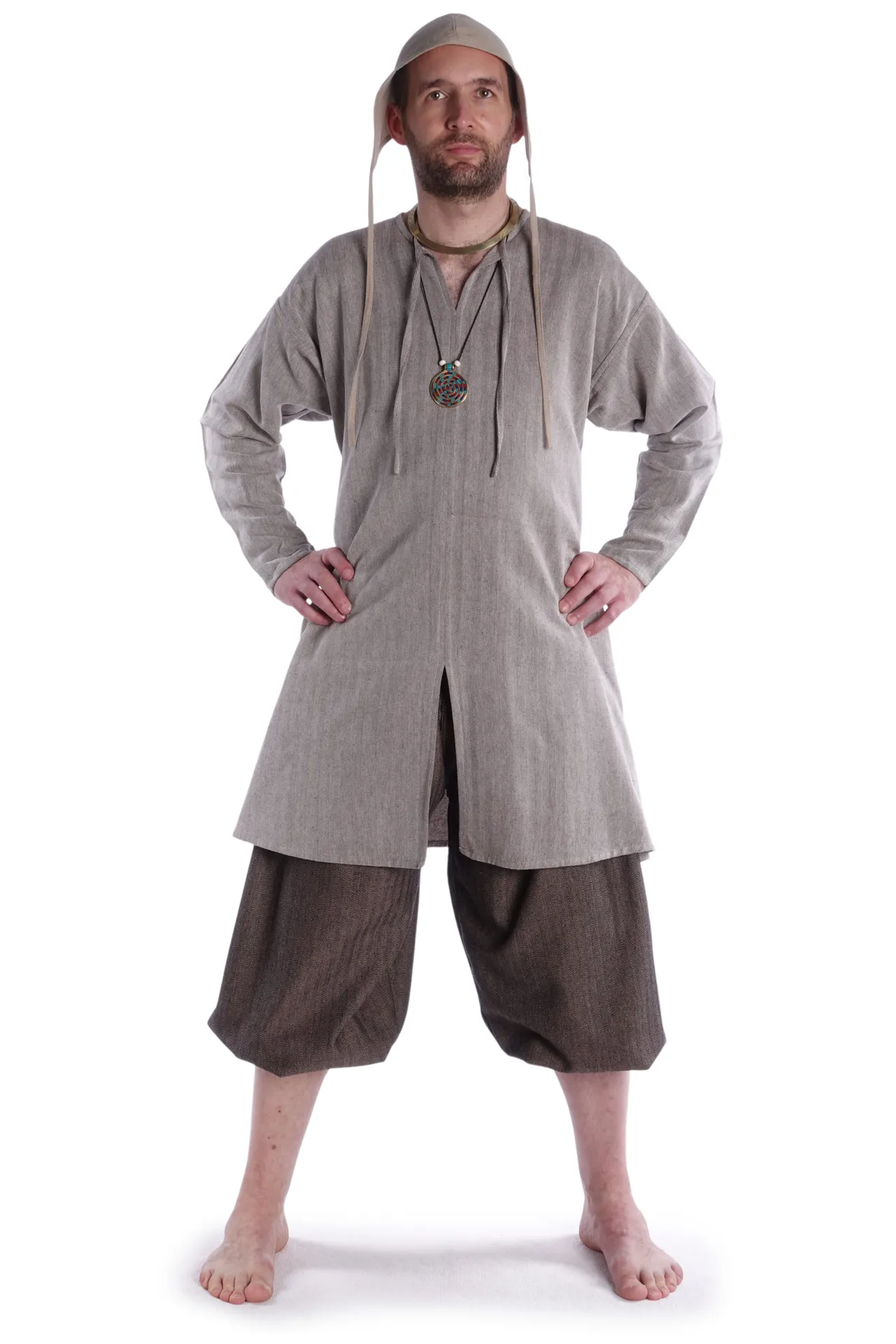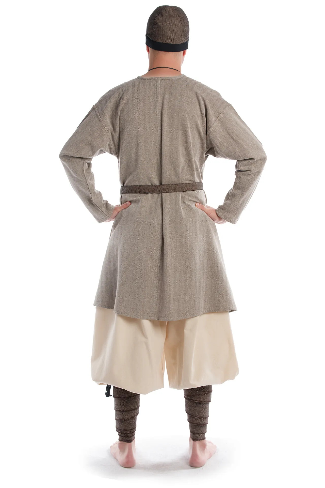 Kennzeichnend für unser Modell "Thord" sind der geschlitzte Halsausschnitt mit Bändern zum Binden sowie ein ein mittiger Schlitz der der auf Hüfthöhe anfängt und die langen, geraden Ärmel. Die Tunika sitz locker, um möglichst große bewegungsfreiheit zu ermöglichen. Diese Tunika bieten wir noch in Hanffarbener Baumwolle aus feiner Baumwolle an.